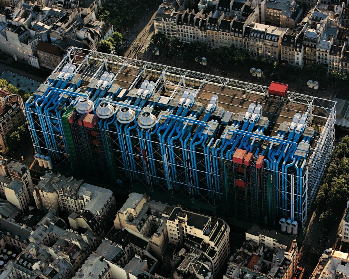 Kariyerlerinin henüz başındaki Renzo Piano ve Richard Rogers'ın ortak tasarımı olarak inşa edilen bu yapı 1977'de tamamlanıyor. Birçok bağlamda oldukça radikal, fütüristik, yenilikçi ve öncü bir tasarım olmasına rağmen Pompidou, yapıldığı dönemde Parisliler tarafından oldukça eleştiri alıyor.