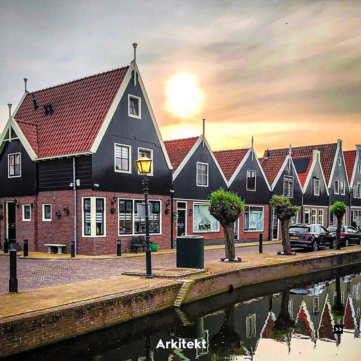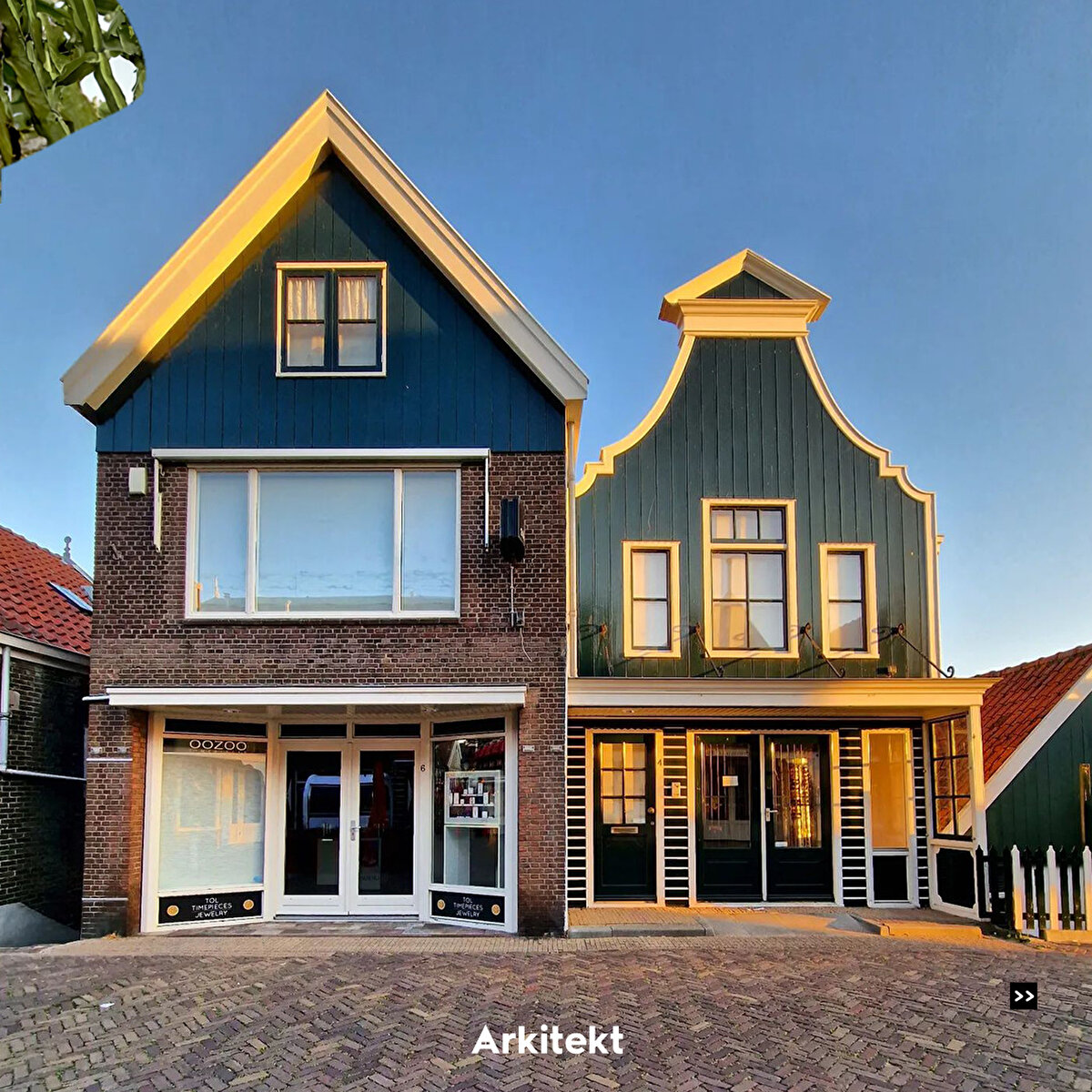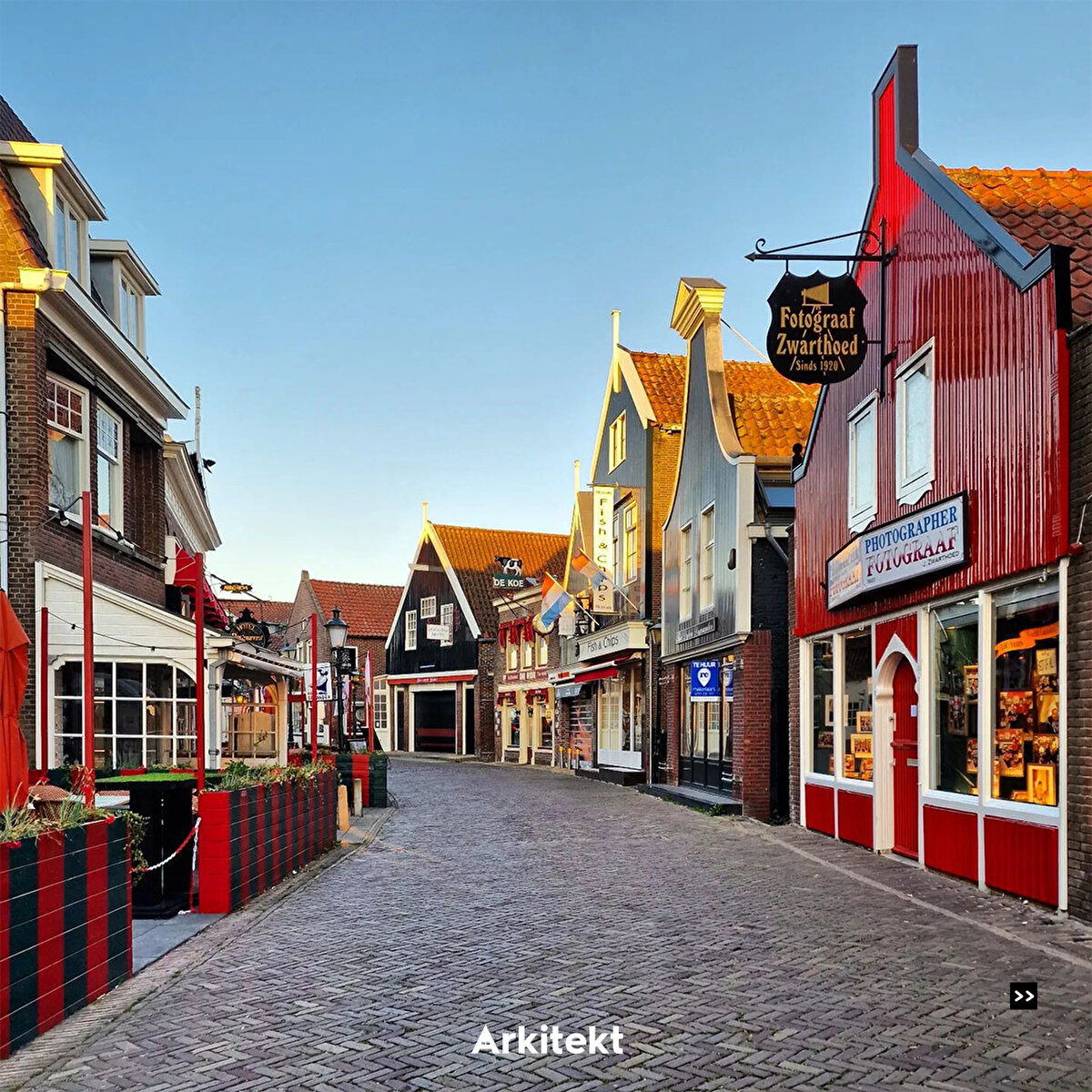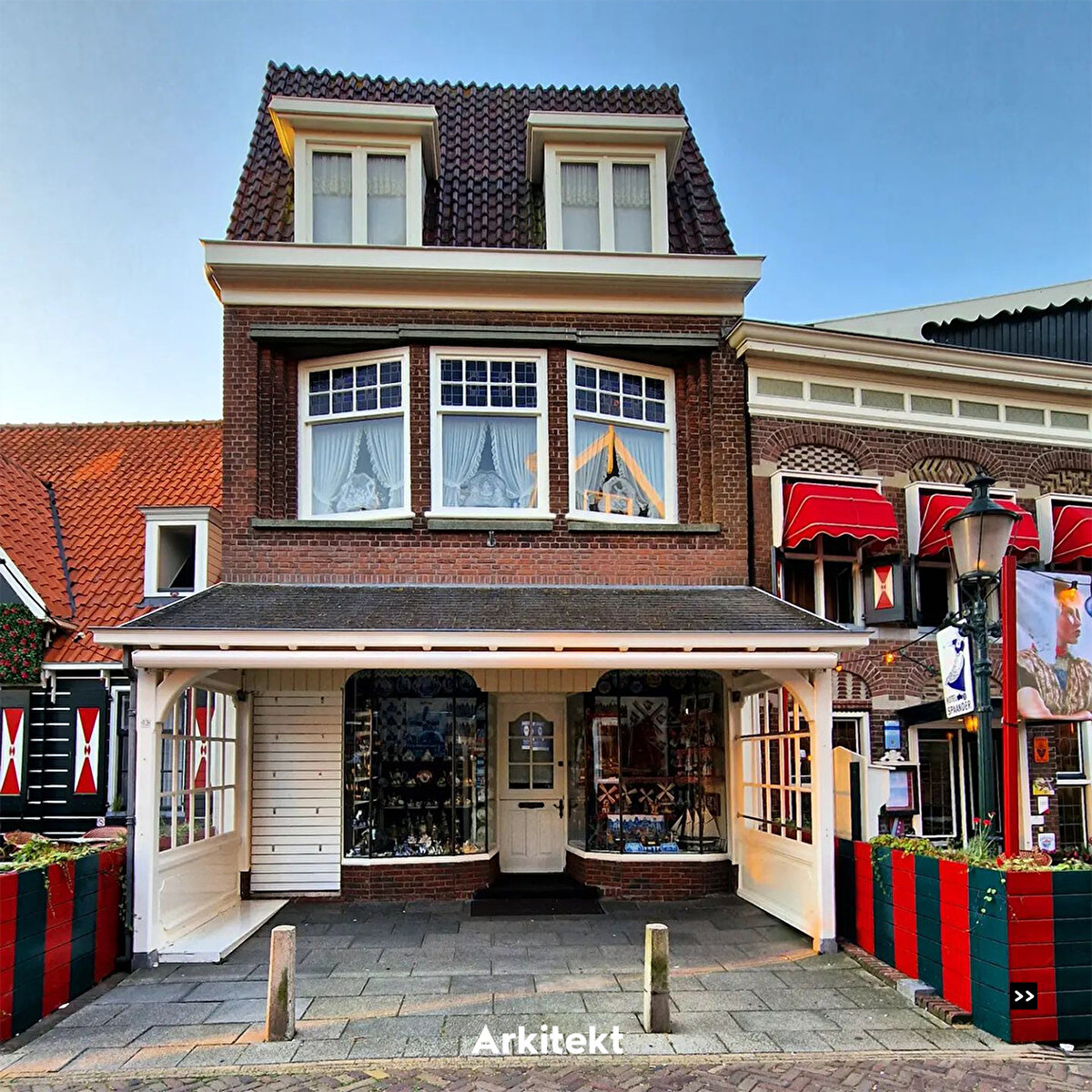In Volendam, which is famous for its traditional typical Dutch houses, the buildings are lined up on narrow streets. The roofs are usually steep and tiled, and bright colours, wooden joinery and details are used on the exterior of the houses.