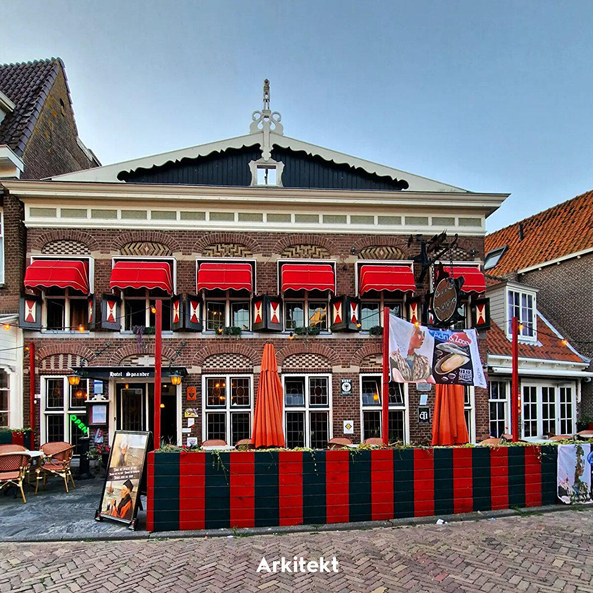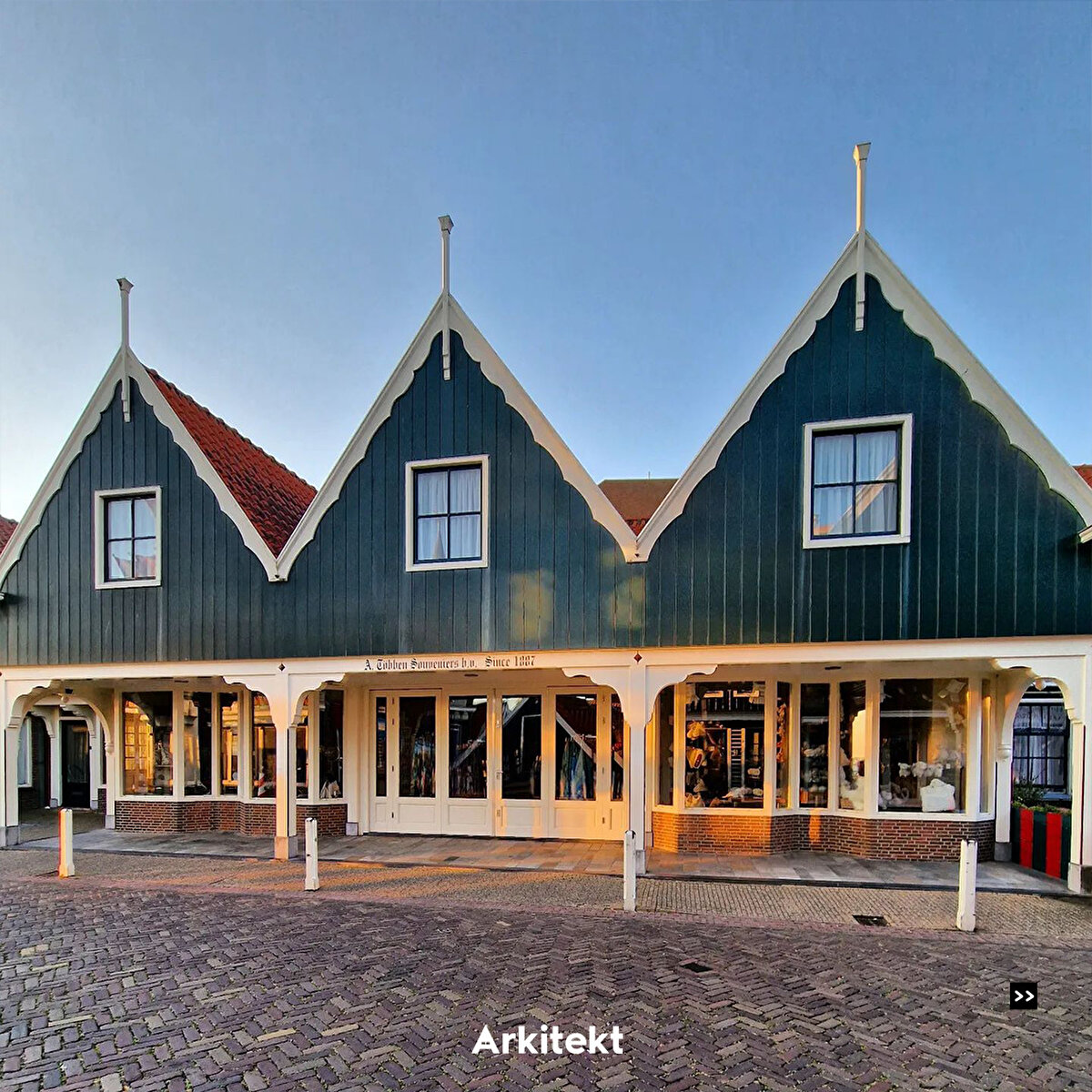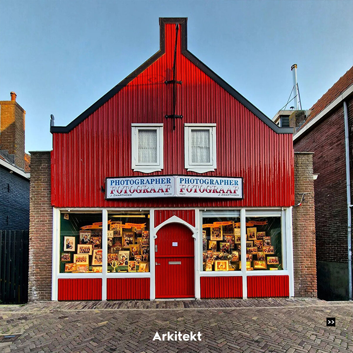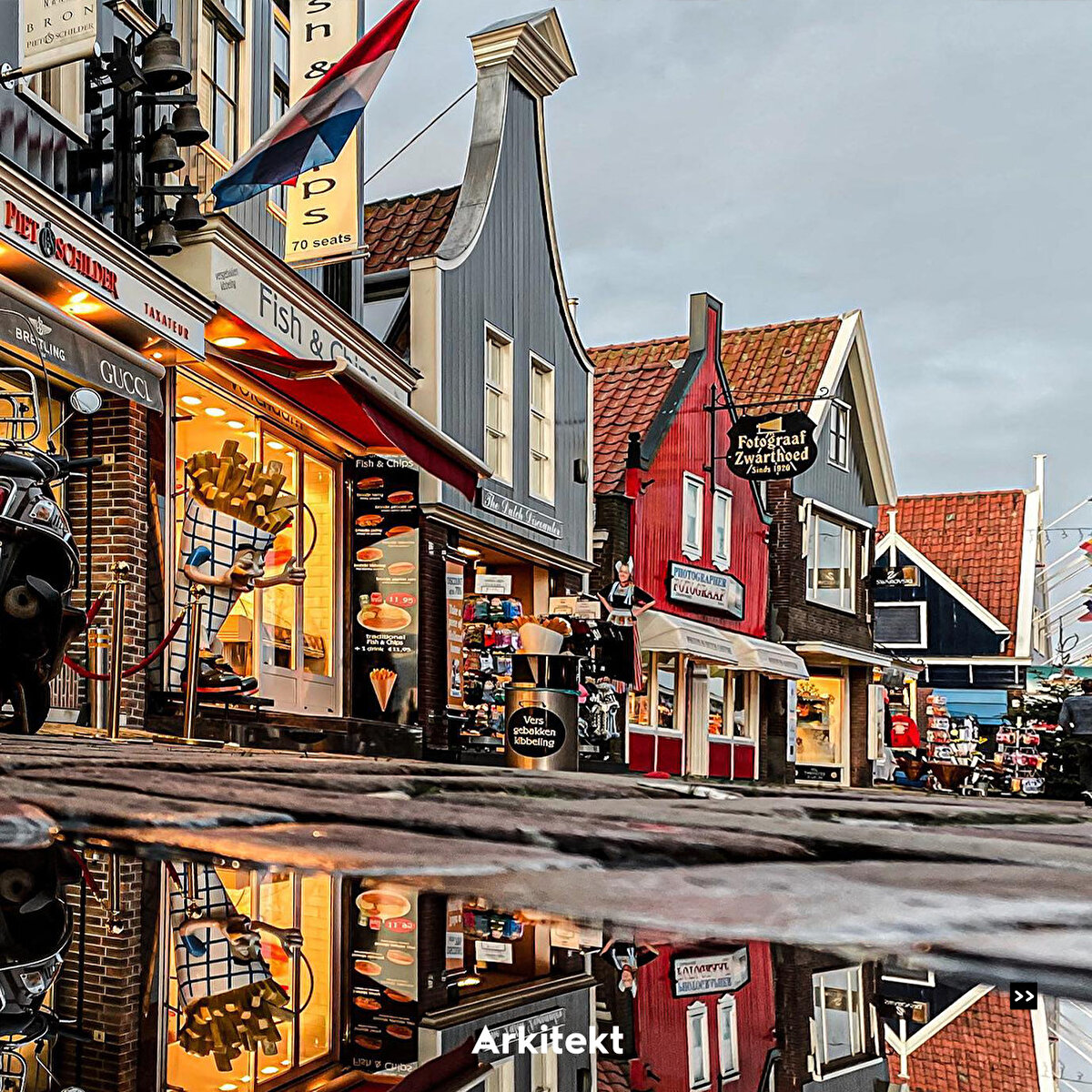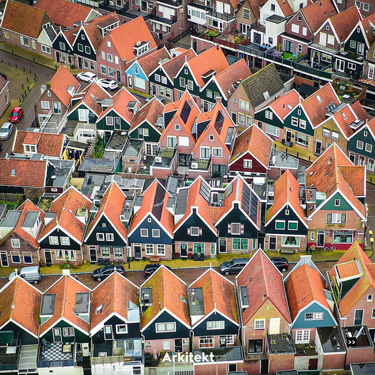 In Volendam, which is famous for its traditional typical Dutch houses, the buildings are lined up on narrow streets. The roofs are usually steep and tiled, and bright colours, wooden joinery and details are used on the exterior of the houses.
