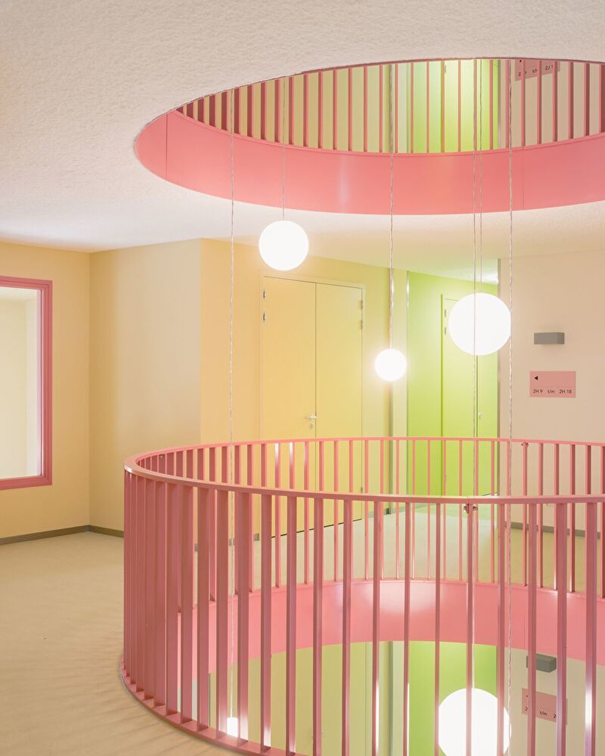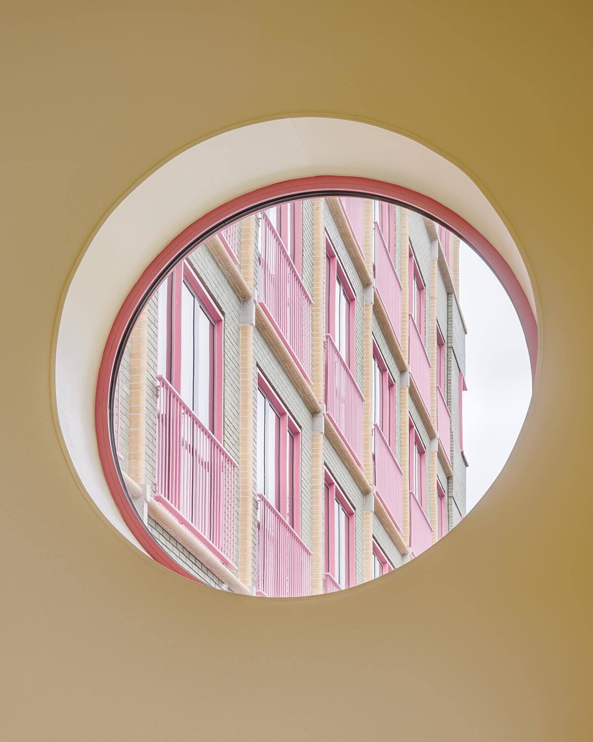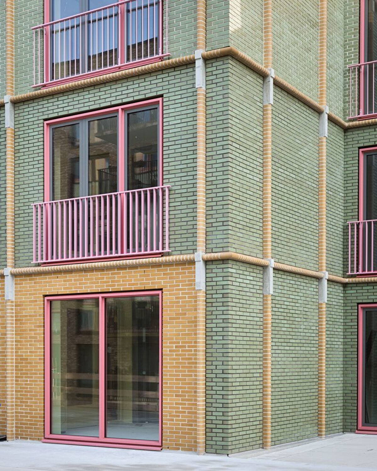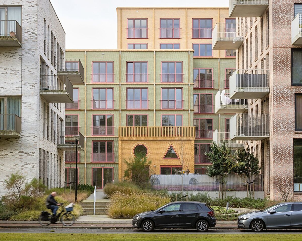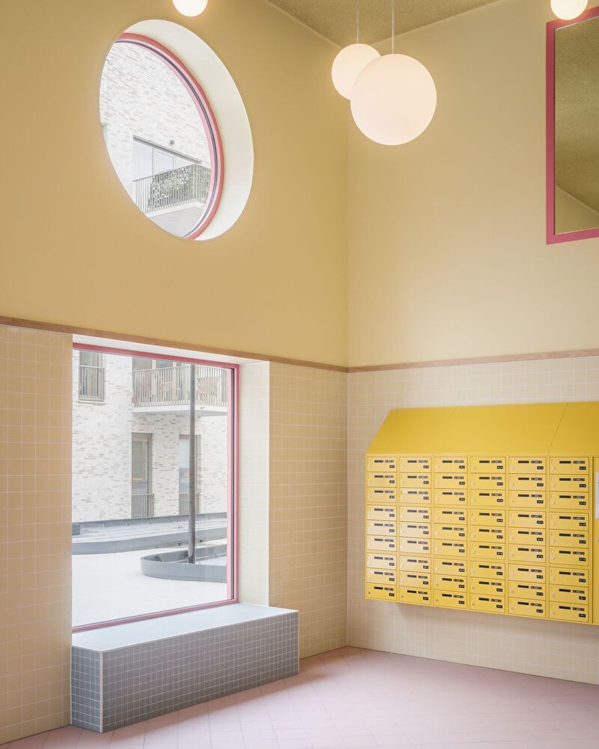 The two-part mass is positioned to establish spatial continuity with surrounding buildings, ensuring that natural light and views remain uninterrupted. Residential units are accessed via gallery-style corridors opening onto a circular courtyard at the centre of the building. The façade design features embossed modulations created with specially shaped bricks and horizontal stripes, adding scale, rhythm and textural richness to the volume. The main entrance, highlighted with glazed bricks, and the figurative end façades give the building a distinctive character.