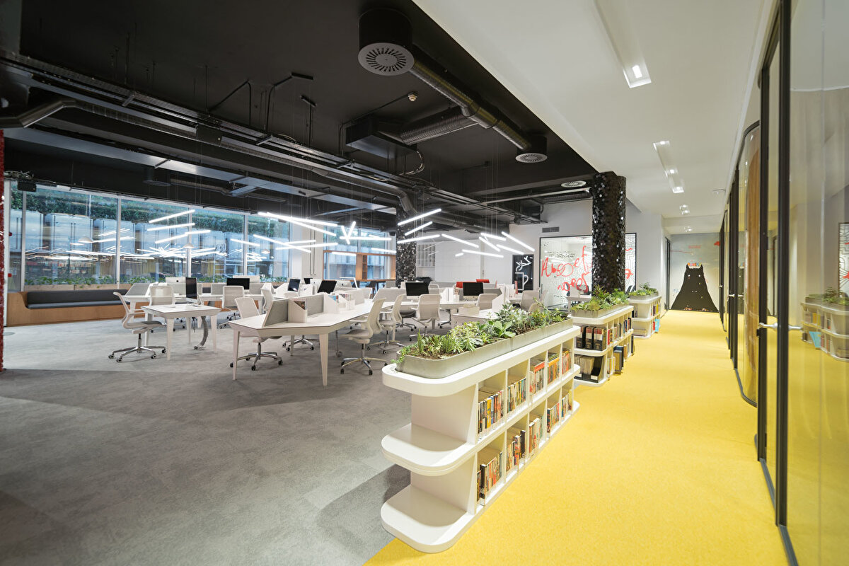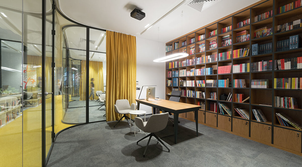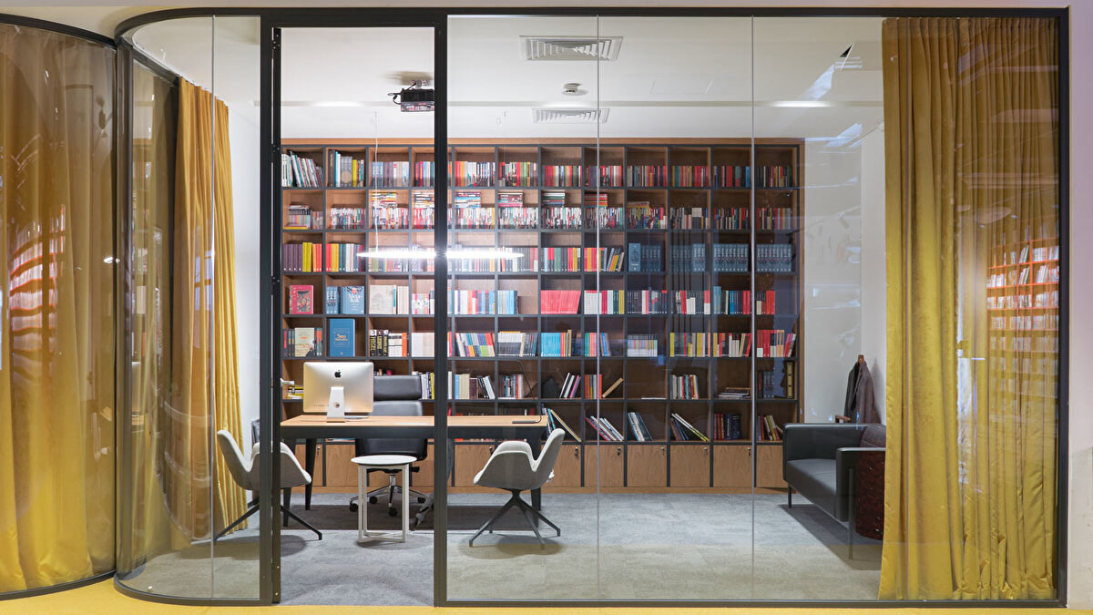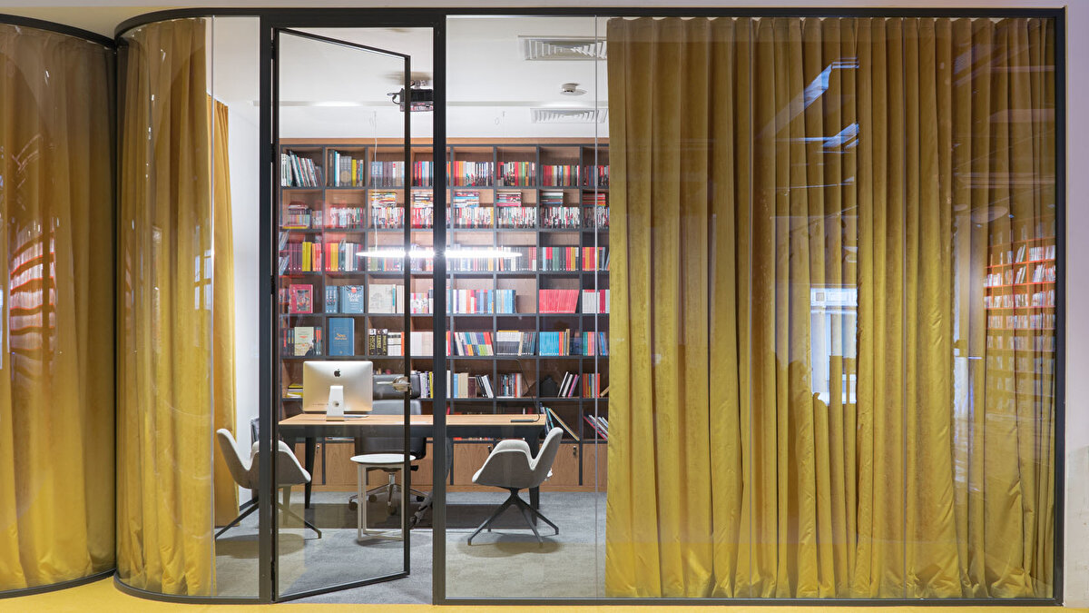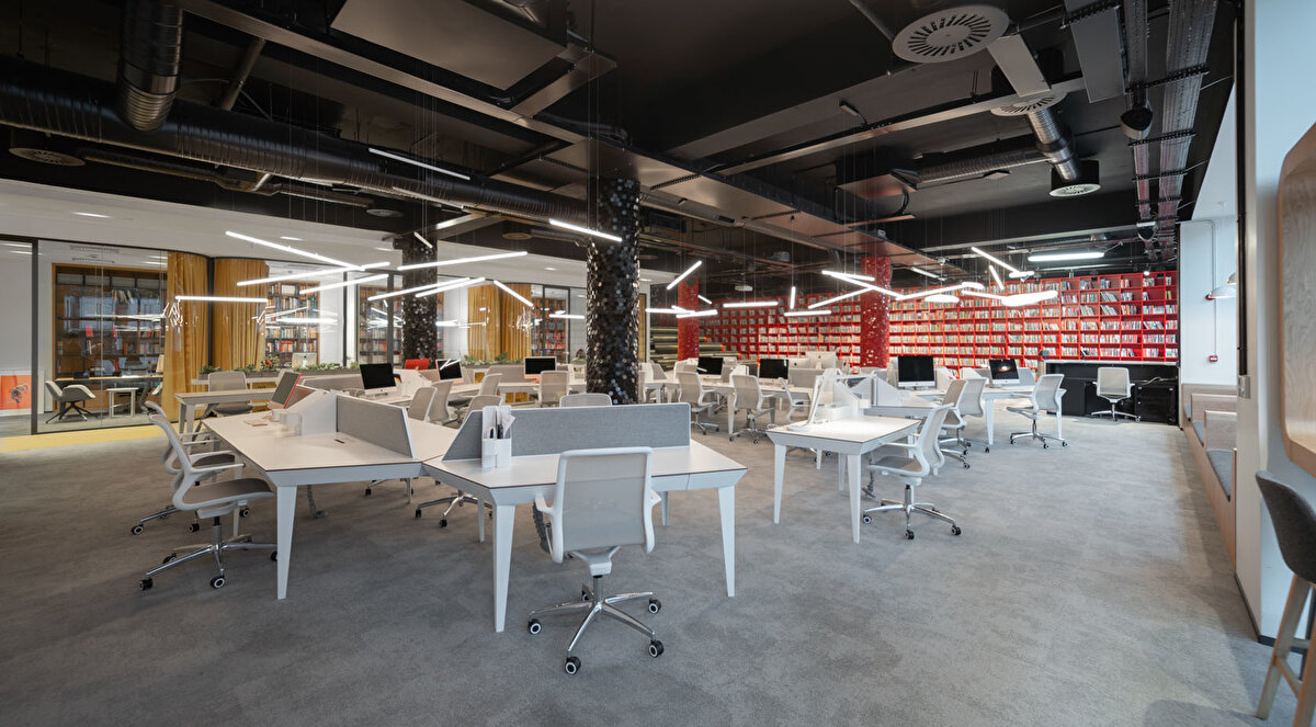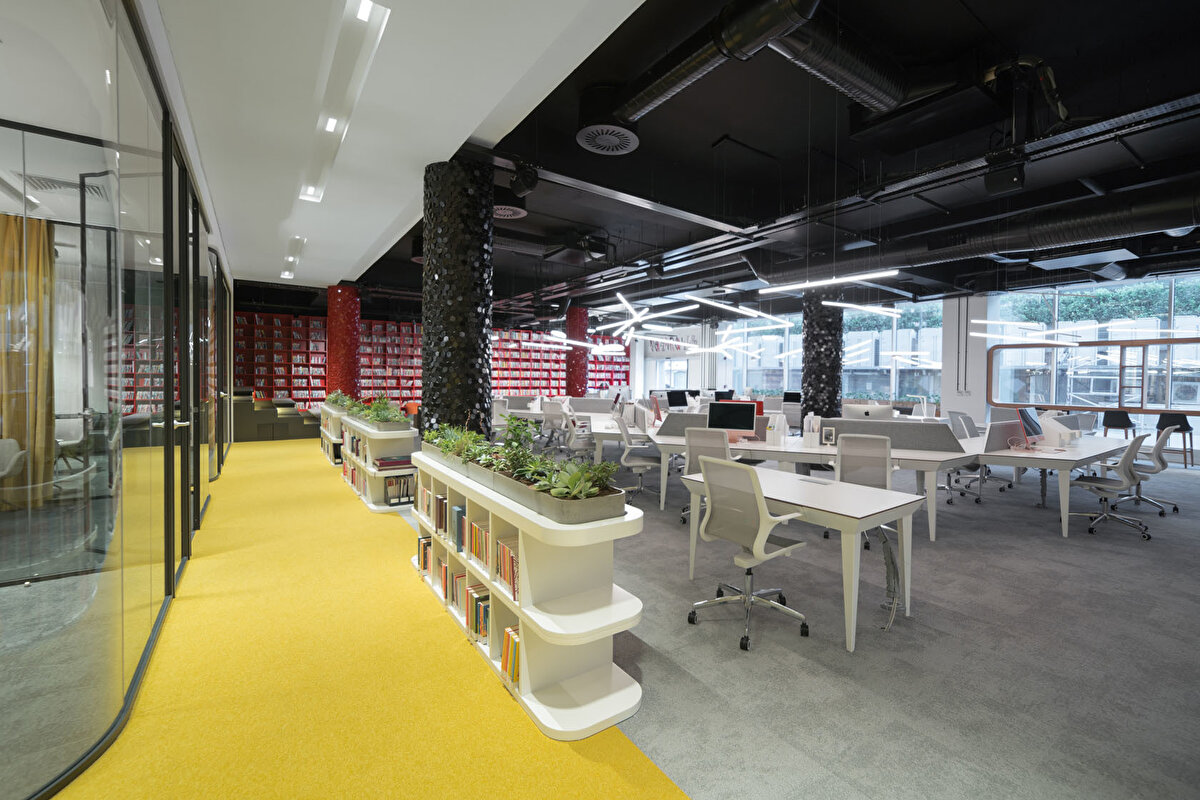 YDK Studio, Albayrak Holding'in Topkapı yerleşkesinde bulunan Ketebe Yayınları için, içerisinde açık ve kapalı ofislerin, etkinlik alanının ve mekanı karakterize eden kırmızı kütüphanenin yer aldığı bir ofis tasarladı. Bu geniş ve açık ofis alanı, editörlerin ve yöneticilerin kullanımlarına göre fonksiyonel olarak ayrıldı. Kullanıcıların olası ihtiyaçlarına cevap vermek amacıyla, mekanın içinde mutfak, oturma birimleri ve küçük bir çalışma standı tasarlandı. Ketebe Yayınları'nın marka kimliğinden referansla tasarlanan ikonik kütüphane ve kolonlar ile mekana renk vurgusu yapılırken, mobilyalara hakim olan beyaz renk ile mekanda bir denge sağlandı.