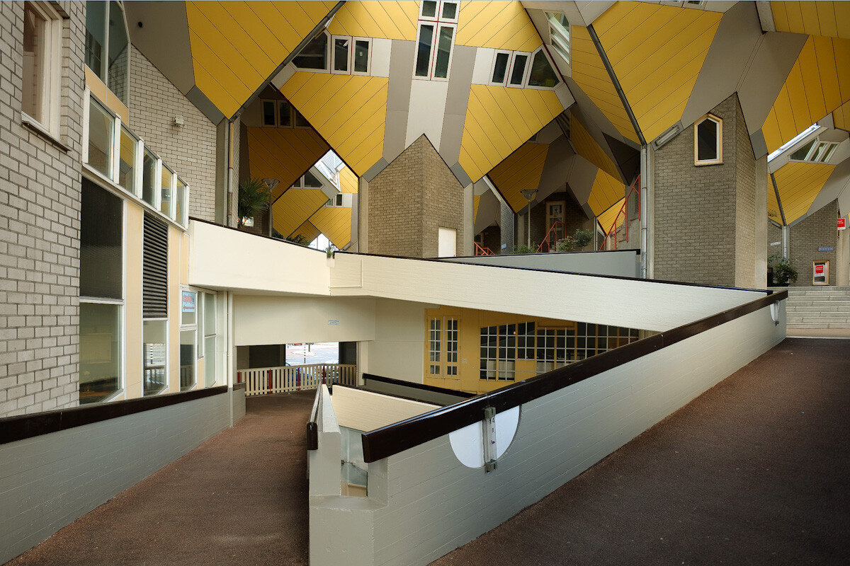 Kubuswoningen, Hollandalı mimar Piet Blom tarafından tasarlanıyor. 1970'lerin sonlarında inşa edilmeye başlanan yapı 1984 yılında tamamlanıyor. Bu konut projesinin en dikkat çekici özelliği, evlerin kare prizma şeklinde değil, 45 derece eğik duran küp şeklinde tasarlanmış olması. Bu eğik şekiller, tasarımın farklılığını vurguluyor.