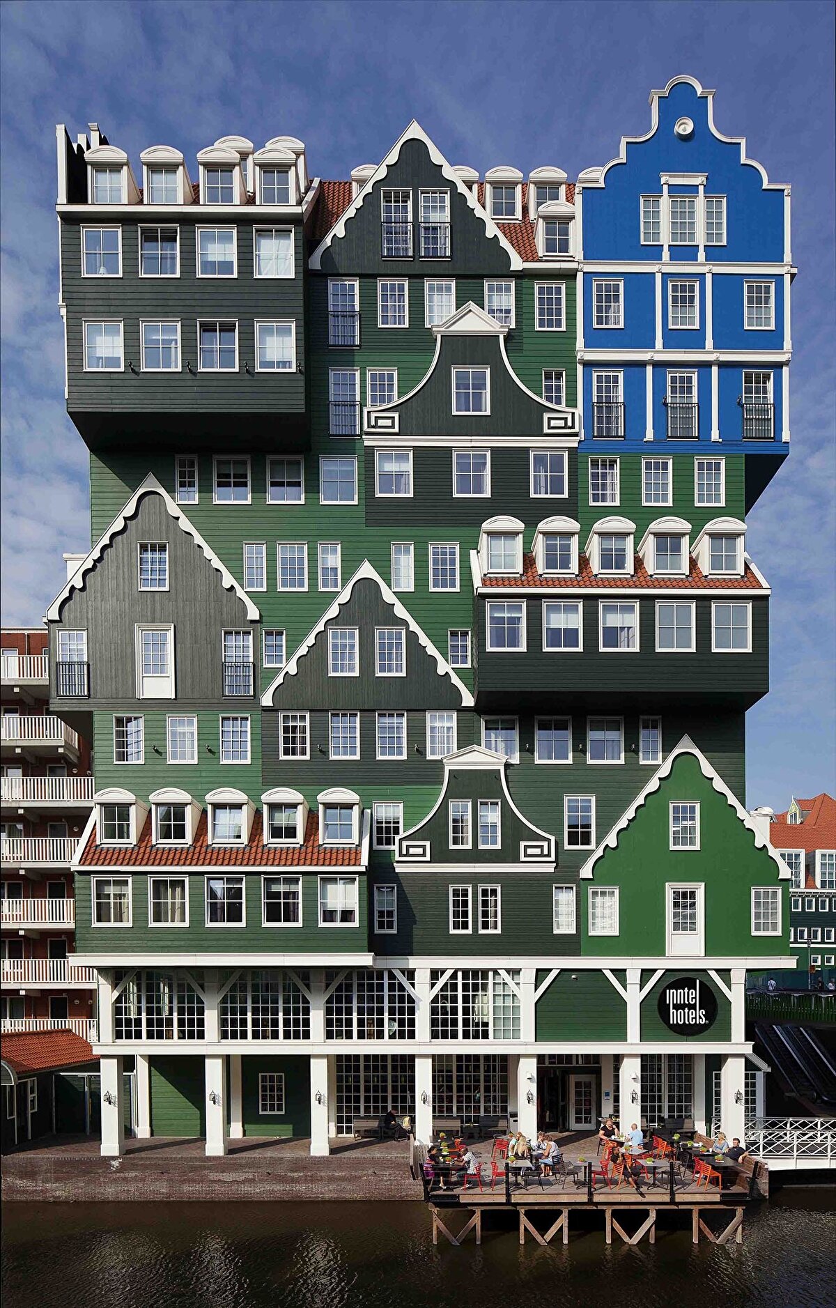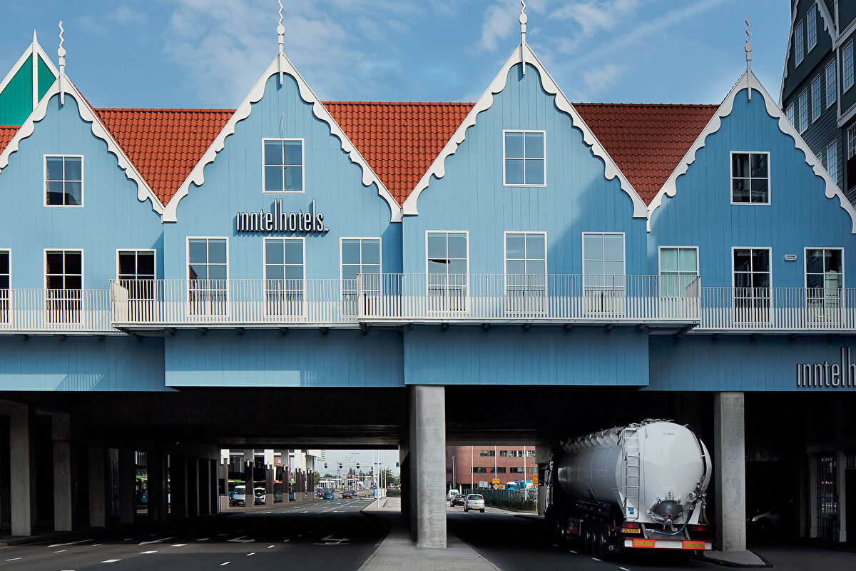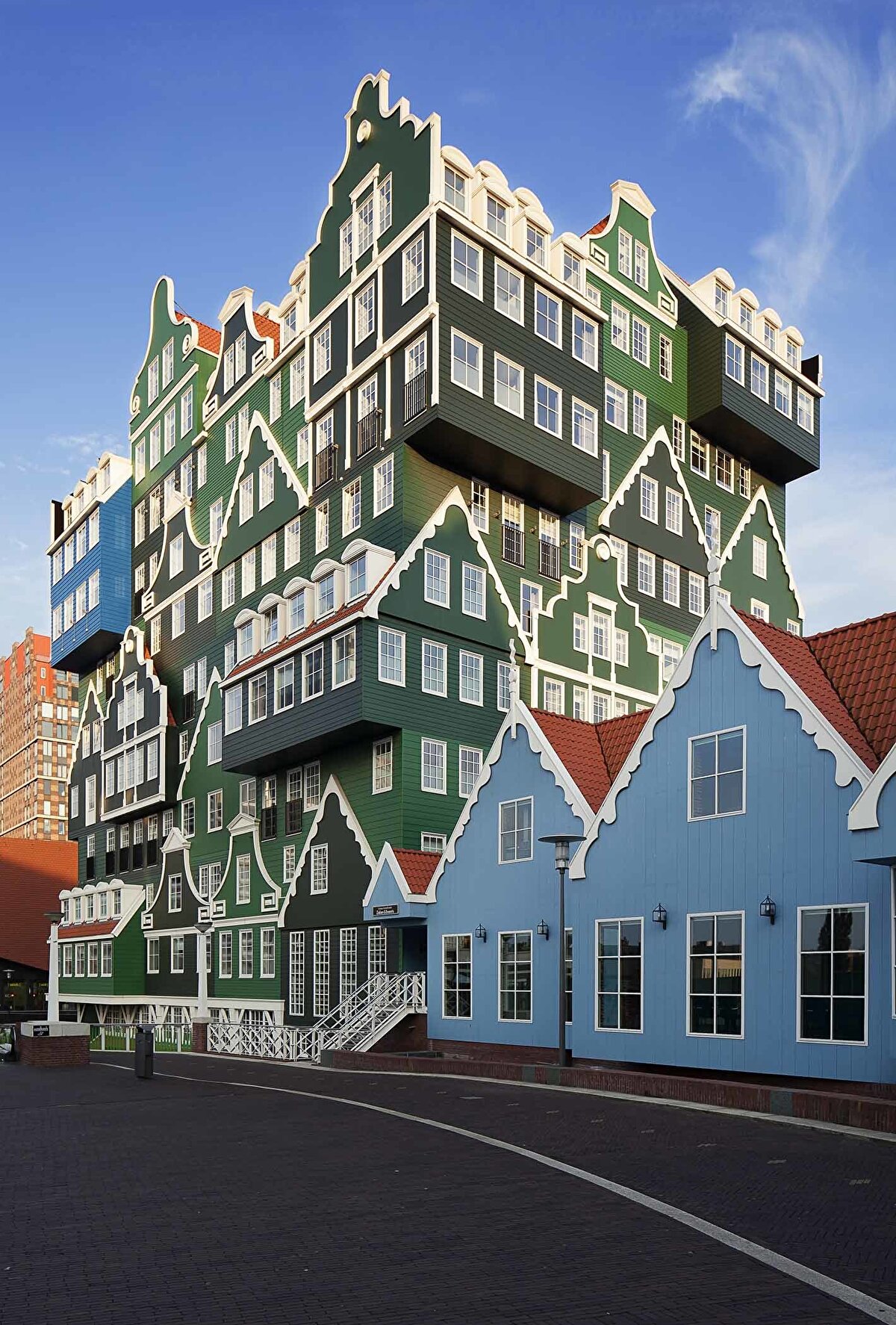 Zaandam bölgesinde bulunan geleneksel evlerden ve renklerden esinlenilerek tasarlanan mimaride, beyaz renkle süslenmiş yeşil duvarlar yer alıyor. 12 kat yüksekliğinde, 160 oda ve kısmen bir viyadük üzerine inşa edilmiş bir toplantı kompleksi bulunuyor. Odağı üzerine toplayan 'Mavi Ev' ise Claude Monet'nin 1871'de Zaandam'da resmettiği eserden esinlenerek tasarlanıyor.