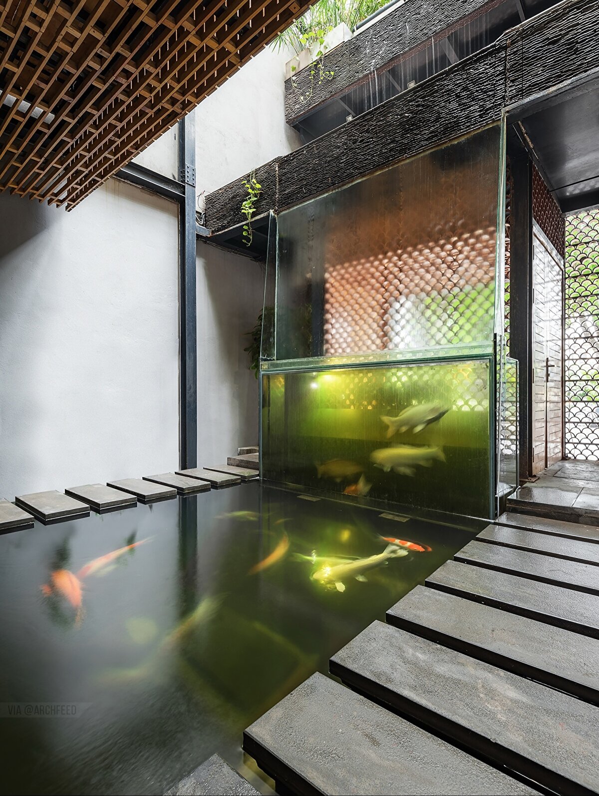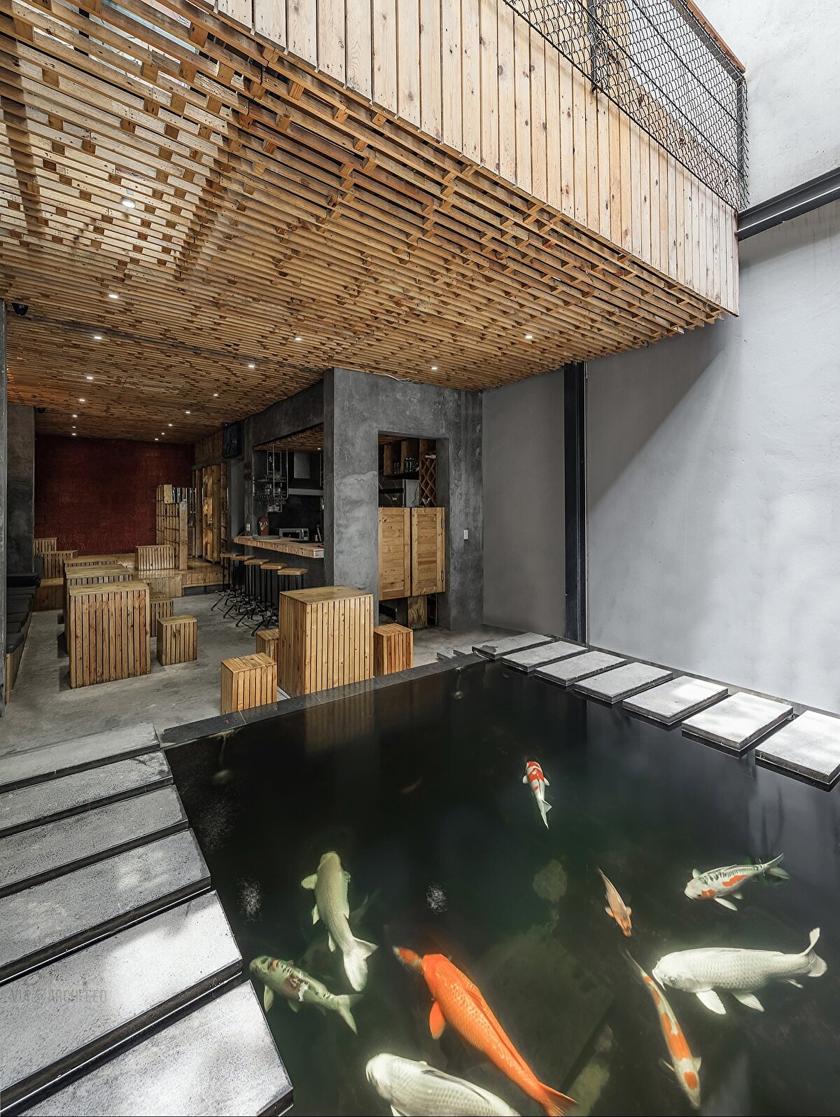 KOI balığı ile bütünleşen kompakt kafe tasarımı
