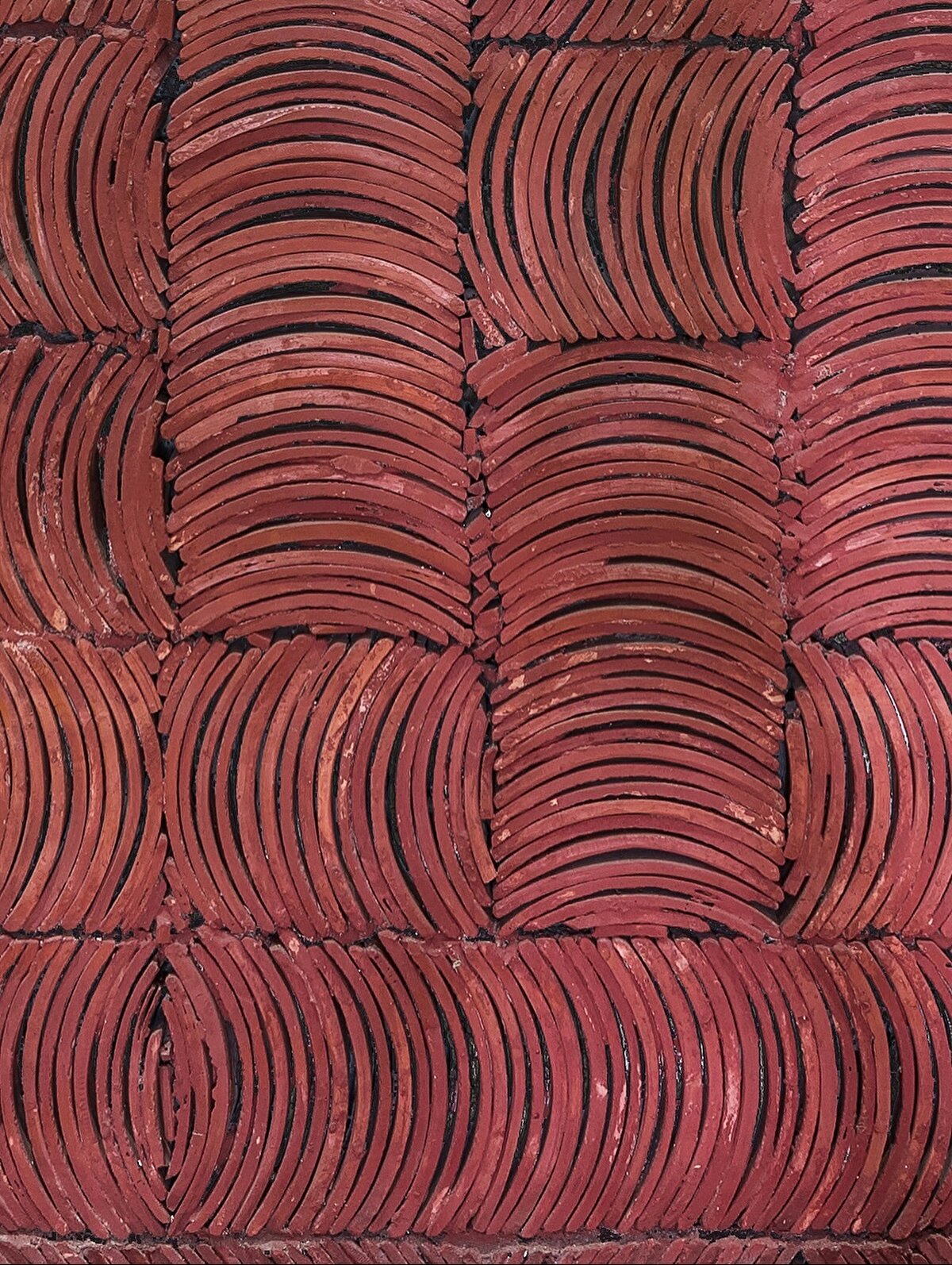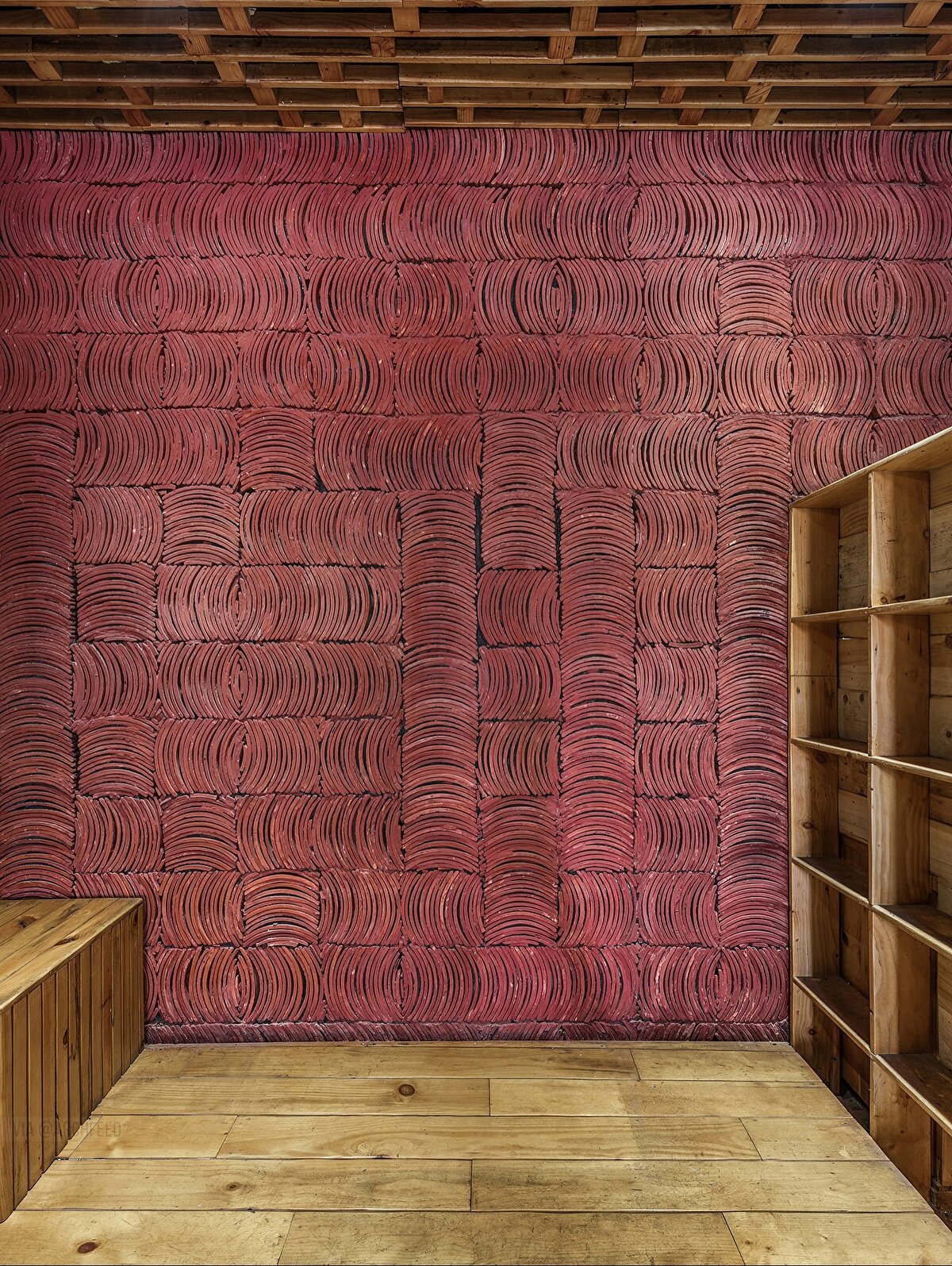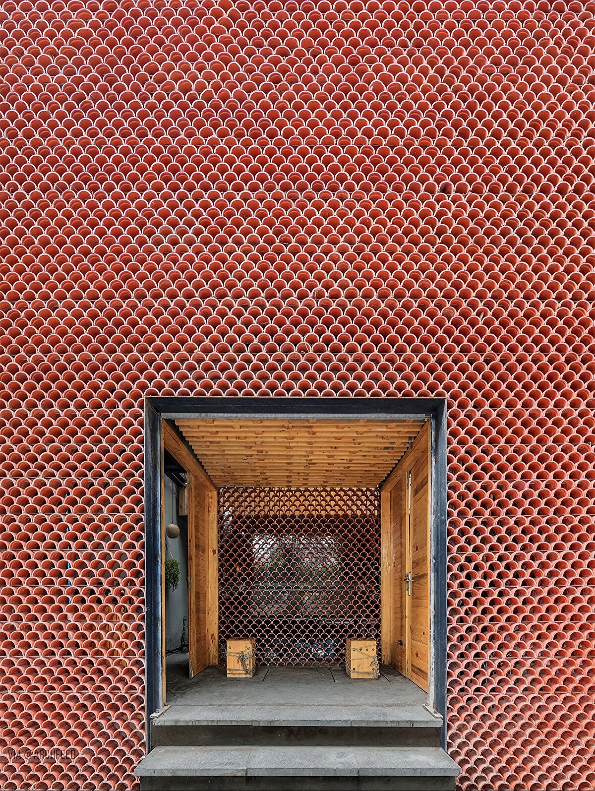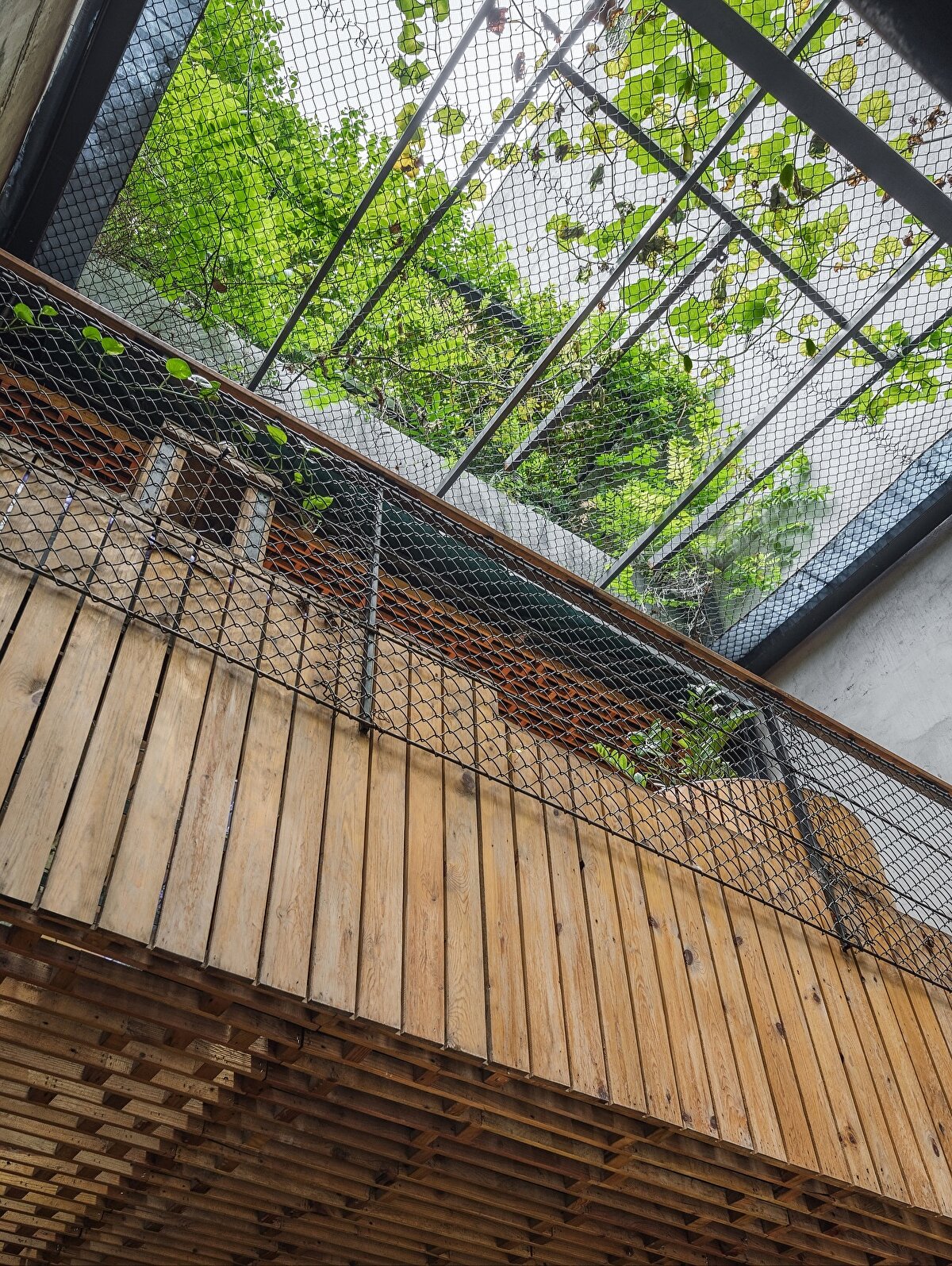Cephede kullanılan Batrang çift geleneksel kiremit, yapının kent içindeki konumuna rağmen yerel malzeme kültürüyle ilişki kuran bir yüzey oluşturuyor. Tüm cepheyi saran ince çatı katmanı, yakın çevredeki yapıların durağan kütlelerinden ayrışarak hafif bir kabuk etkisi oluşturuyor. İç mekânda ahşap paletlerin yeniden kullanılması ise geri dönüşüm odaklı, ölçülü ve işlevsel bir tasarım yaklaşımını destekliyor.
