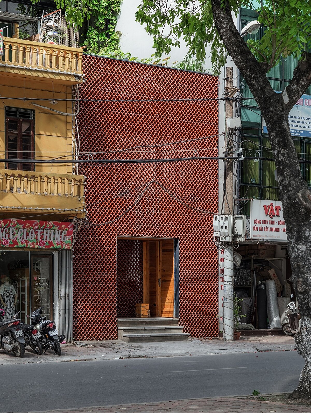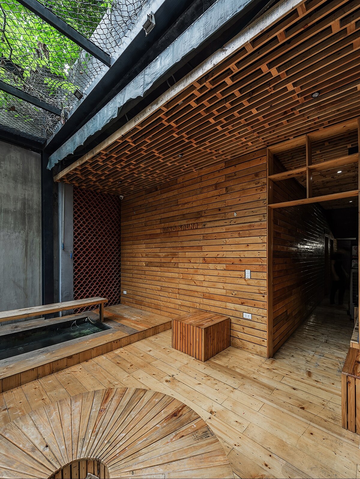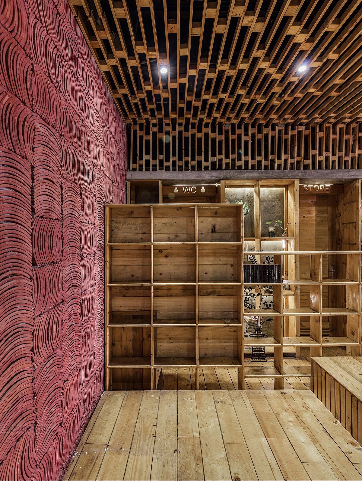 The Batrang double traditional tiles used on the facade create a surface that relates to the local material culture despite the building's urban location. The thin roof layer enveloping the entire facade creates a light shell effect, distinguishing it from the static masses of nearby buildings. The reuse of wooden pallets in the interior supports a recycling-focused, measured, and functional design approach.