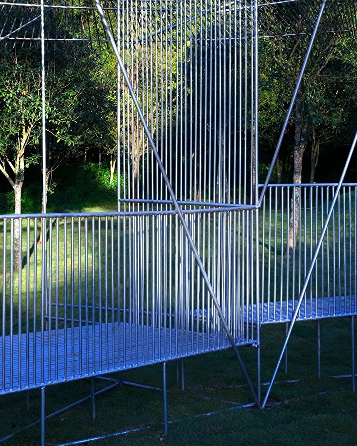 Kaplamalar ya da yüzey finishleri doğrudan gökyüzü ve ortam ışığına tepki veriyor. Gümüş metalik boyayla kaplanan çelik çubuk yüzeyleri, sisli havalarda soğuk mavi tonlar, günbatımında morumsu ya da pembe tonlar, gece ışığında ise sarımsı/altın rengimsi sıcaklıkların etkisiyle değişen bir görünüm kazanıyor. Yani yapı statik değil, ışık ve ortamla ilişkili olarak sürekli değişen bir görsellik sunuyor.