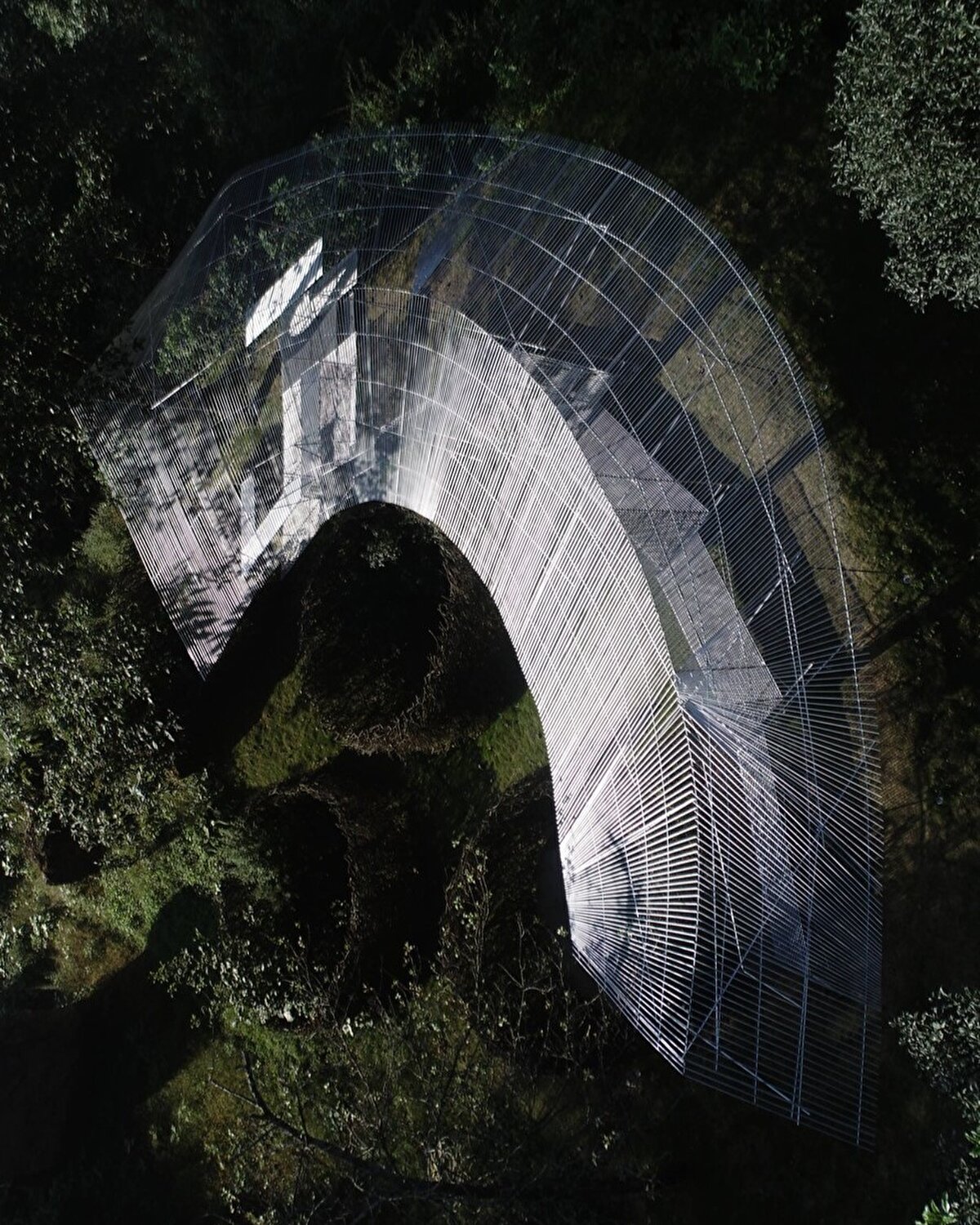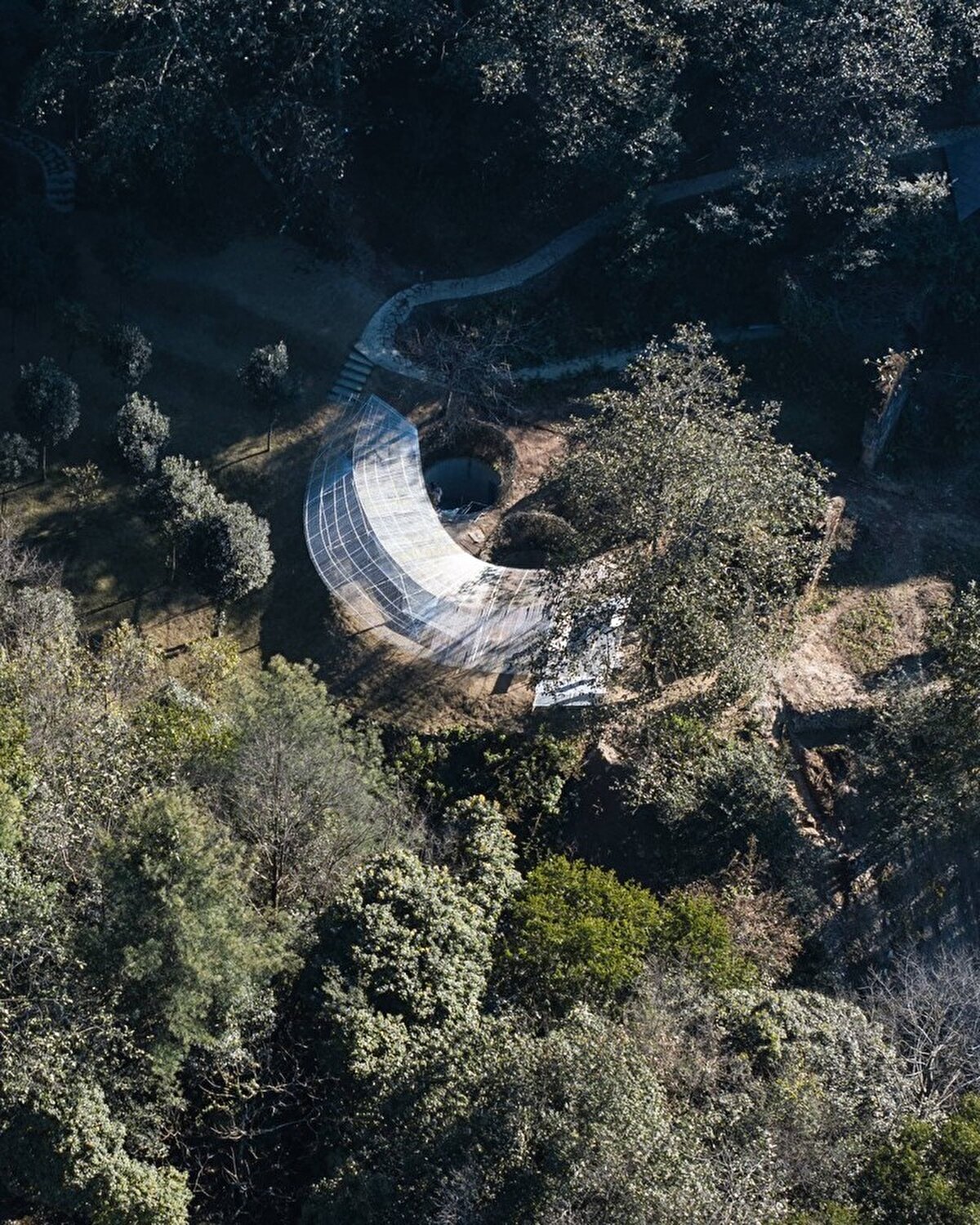 Pavilion, ormanın içinde unutulmuş bir vadide, eski toprak duvarların ve yosunlanmış taş temellerin bulunduğu bir alanda konumlanıyor. Bu kalıntılar, projenin başlangıcında hem yerin tarihini hem de ortamın dönemselliğini hatırlatan unsurlar.