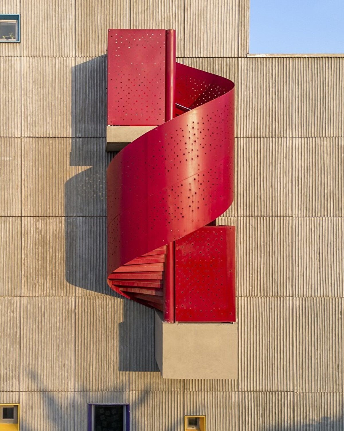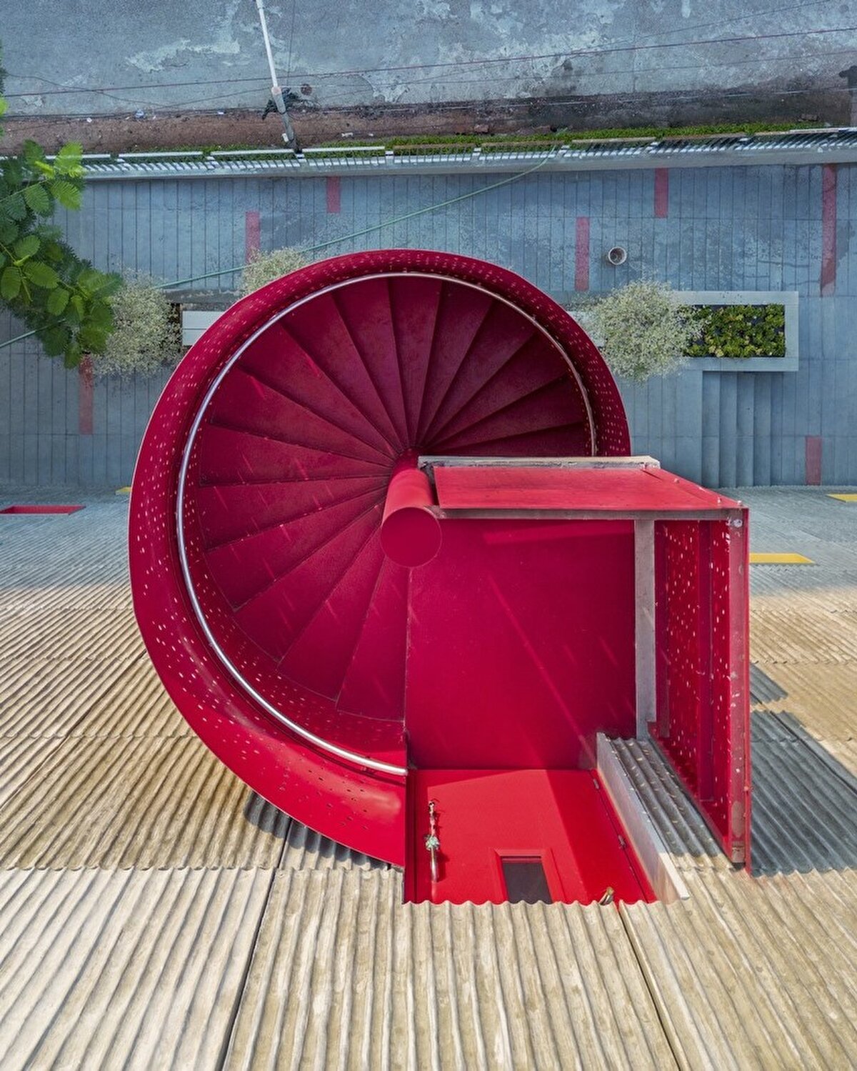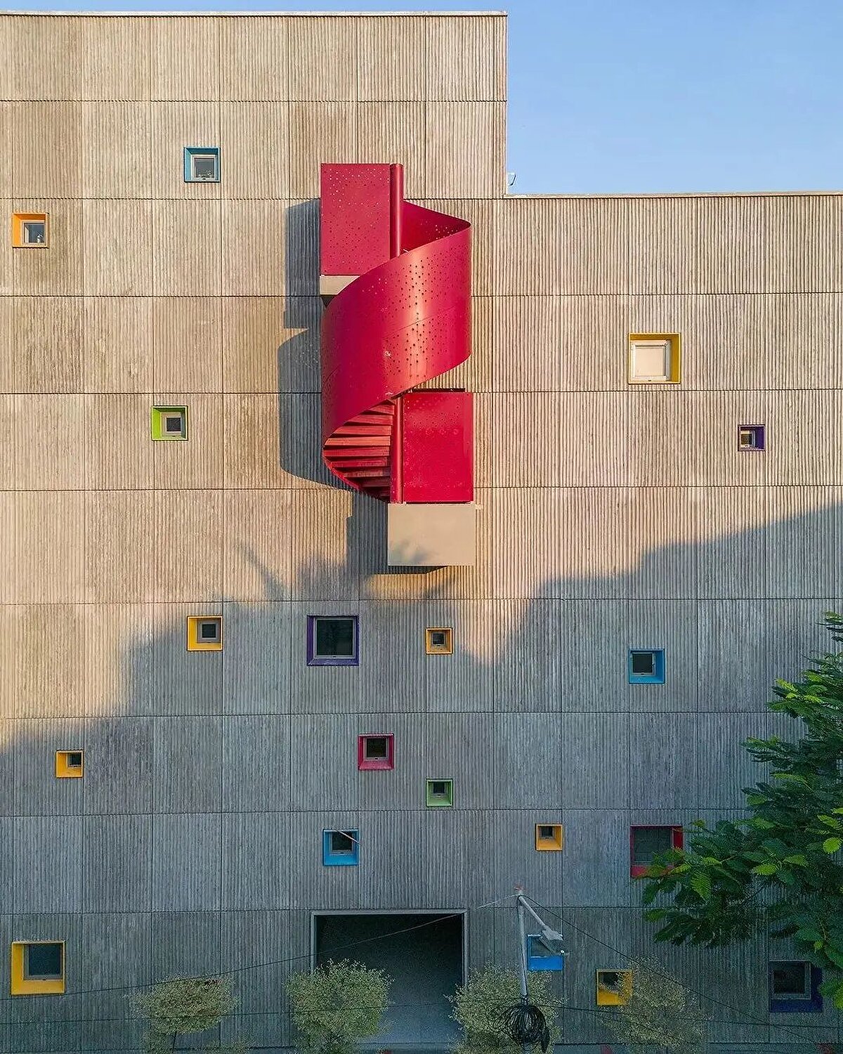 Opened to take advantage of the south wind, the center features a lecture hall and gallery space overlooking the garden, a metal staircase connecting the different levels, a slide leading to the library, and a spiral staircase leading to the rooftop cafeteria. The climate-responsive façade system is provided by insulated cavities on the east and west walls and openable, shaded windows on the south and north walls. The center is illuminated by the warm glow of natural light, providing an ideal atmosphere for learning.