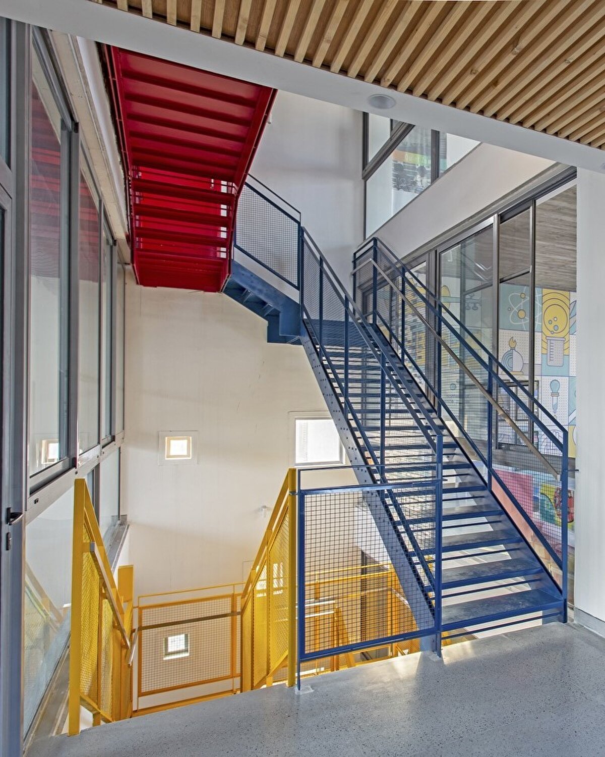 Güney rüzgarından yararlanmak için açılan merkezde, bahçeye bakan bir amfi ve galeri alanı, farklı seviyeleri bağlayan bir metal merdiven, kütüphaneye açılan bir kaydırak ve çatıdaki kafeteryaya çıkan spiral bir merdiven bulunuyor. İklime duyarlı cephe sistemi, doğu ve batı duvarlarında yalıtımlı boşluklar, güney ve kuzey duvarlarında ise açılabilir, gölgelikli pencerelerle sağlanıyor. Merkez, doğal ışığın sıcak parıltısıyla aydınlanarak öğrenme için ideal bir atmosfer sunuyor.