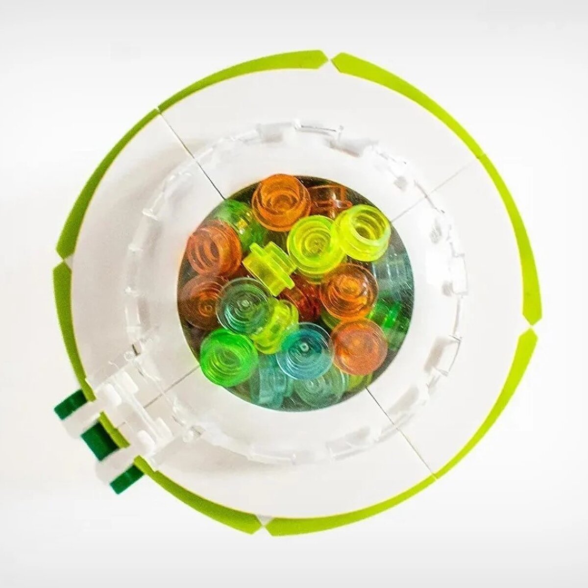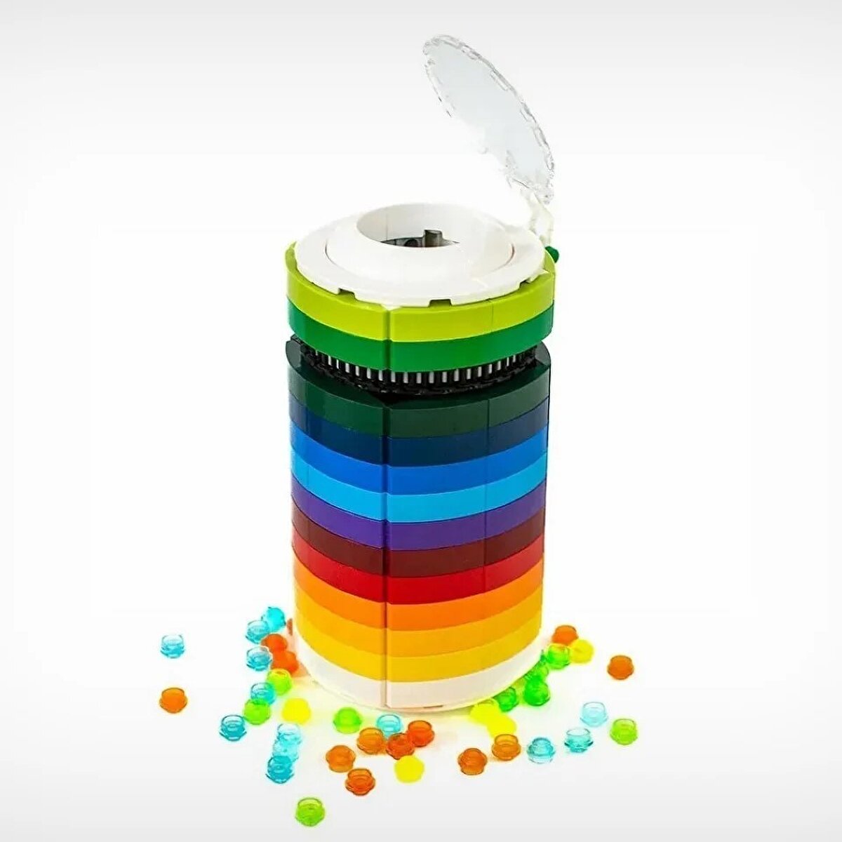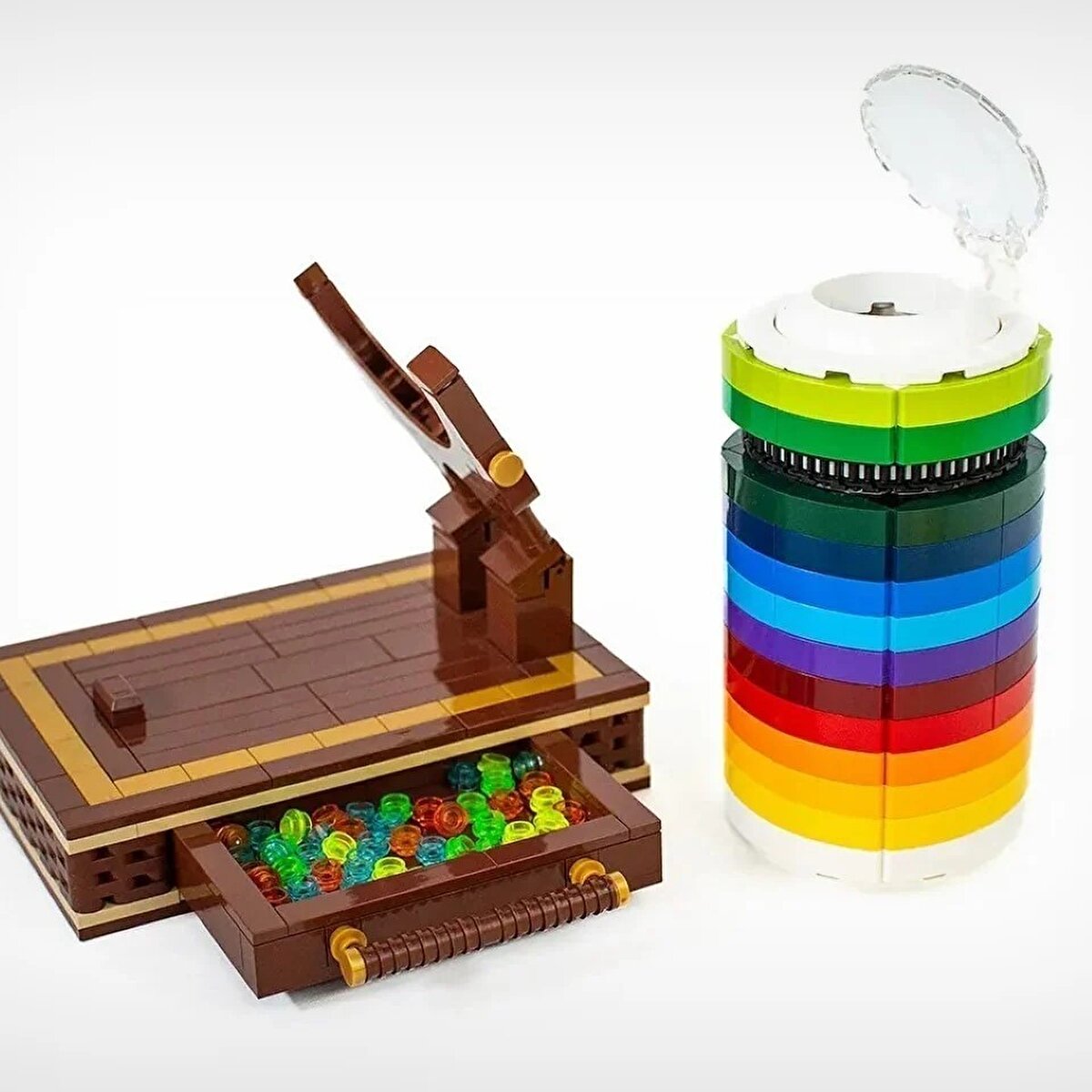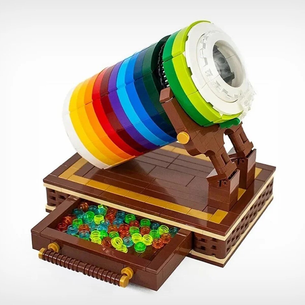 KaLEGOidoscope, LEGO parçaları kullanılarak tasarlanmış işlevsel bir kaleydoskop örneği olarak dikkat çekiyor. Geleneksel kaleydoskoplardaki prizma aynalar yerine, parlak LEGO tuğlalarıyla benzer bir yansıma etkisi sağlanıyor. Silindirik gövde ve çivileri taşıyan bir stanttan oluşan yapı, görsel deneyimi ve üretim sürecini bir arada sunuyor. Üst parçasında yer alan kapak sayesinde kullanıcılar iç mekana şeffaf LEGO çivileri, plastik parçalar veya başka küçük nesneler yerleştirebiliyor. @lego