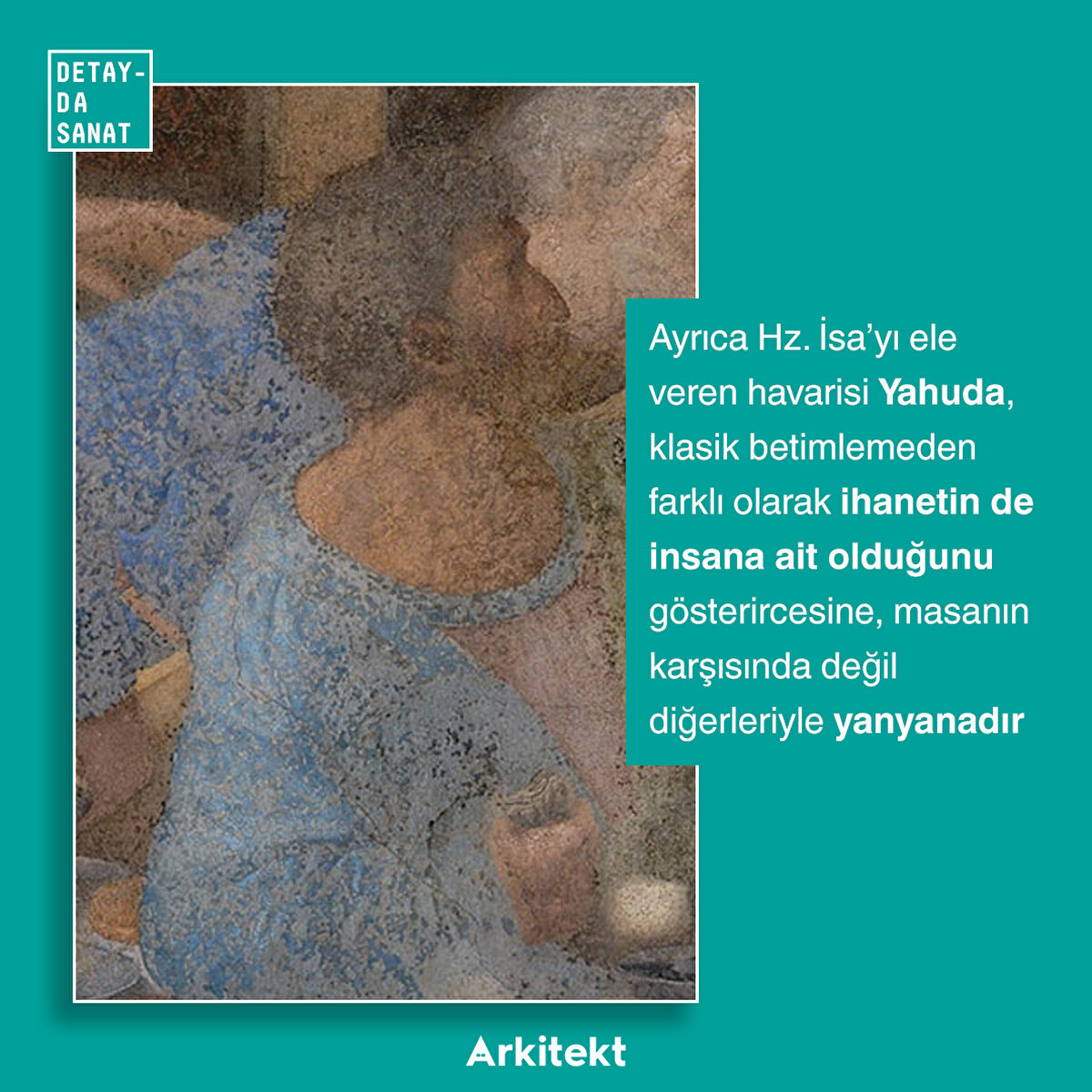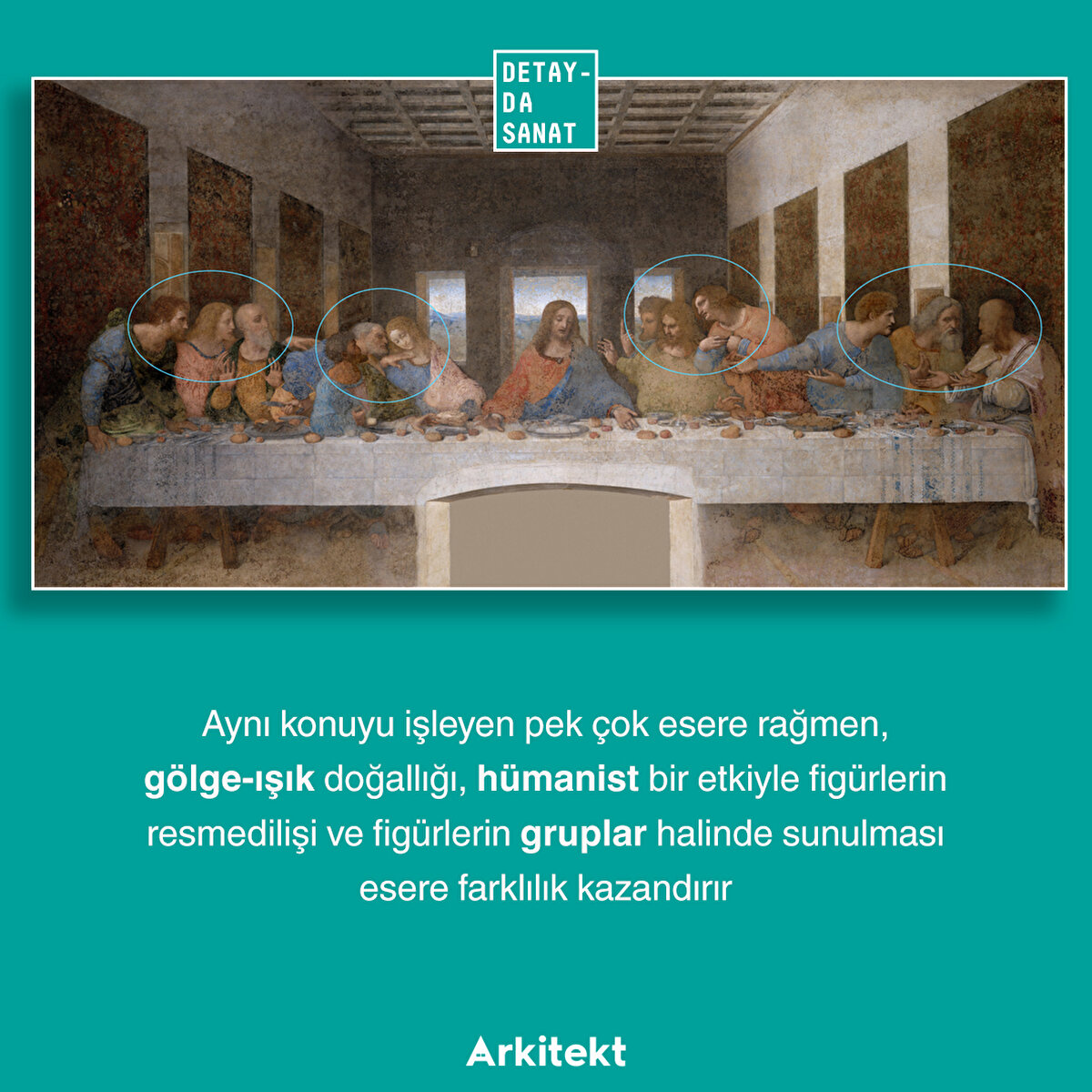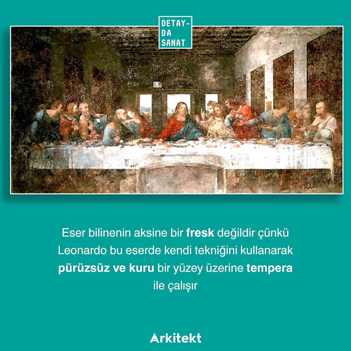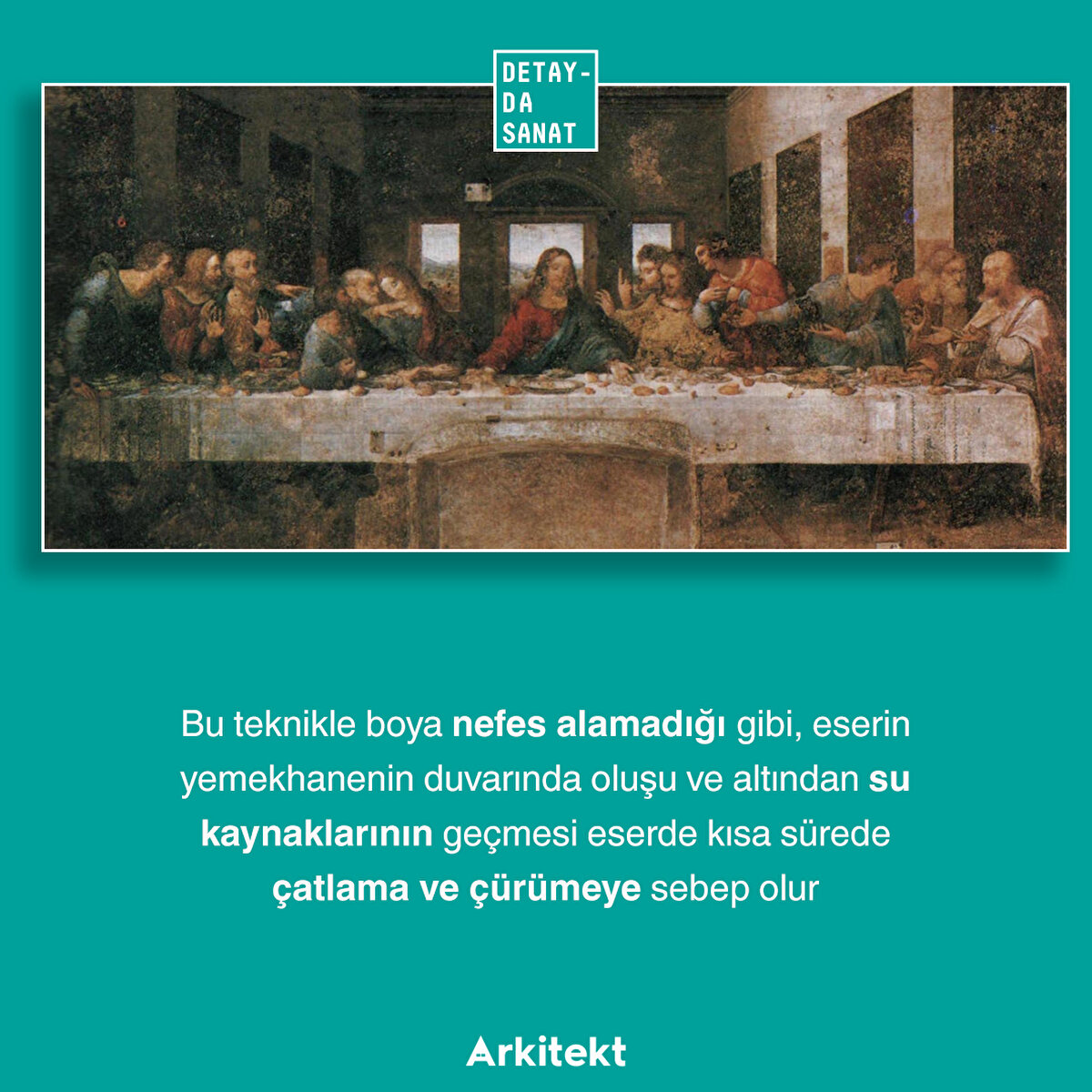 Leonardo'nun tekniğinin başarısızlığına, eseri nemden kurtarmak için eseri tahrip etme pahasına tam ortasına bir kapı açılmasına, 17. yüzyılda bulunduğu manastırın Fransız birlikler tarafından ahır olarak kullanılmasına, geçirdiği pek çok berbat restorasyona ve II. Dünya Savaşı'ndaki tahribat yüzünden neredeyse 3 yıl basit bir branda altında korunmasına rağmen direnmeye devam eden Son Akşam Yemeği, bu hafta Detayda Sanat'ta!