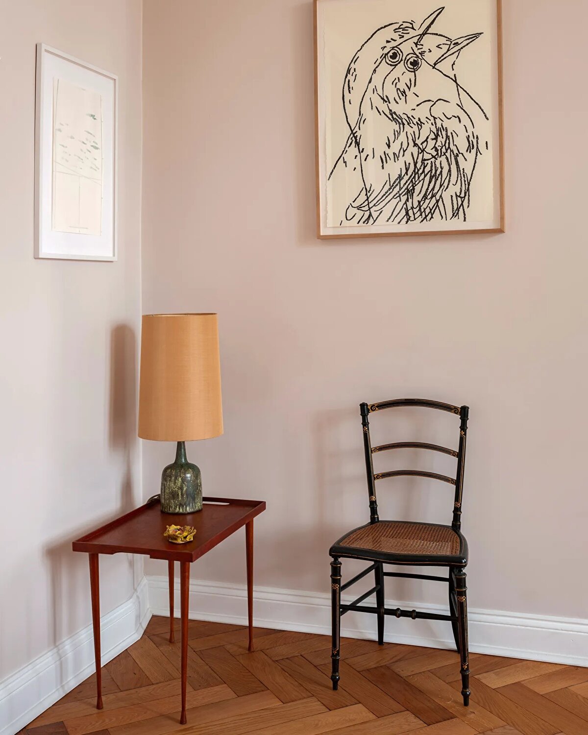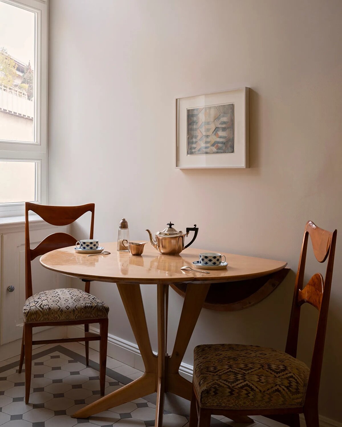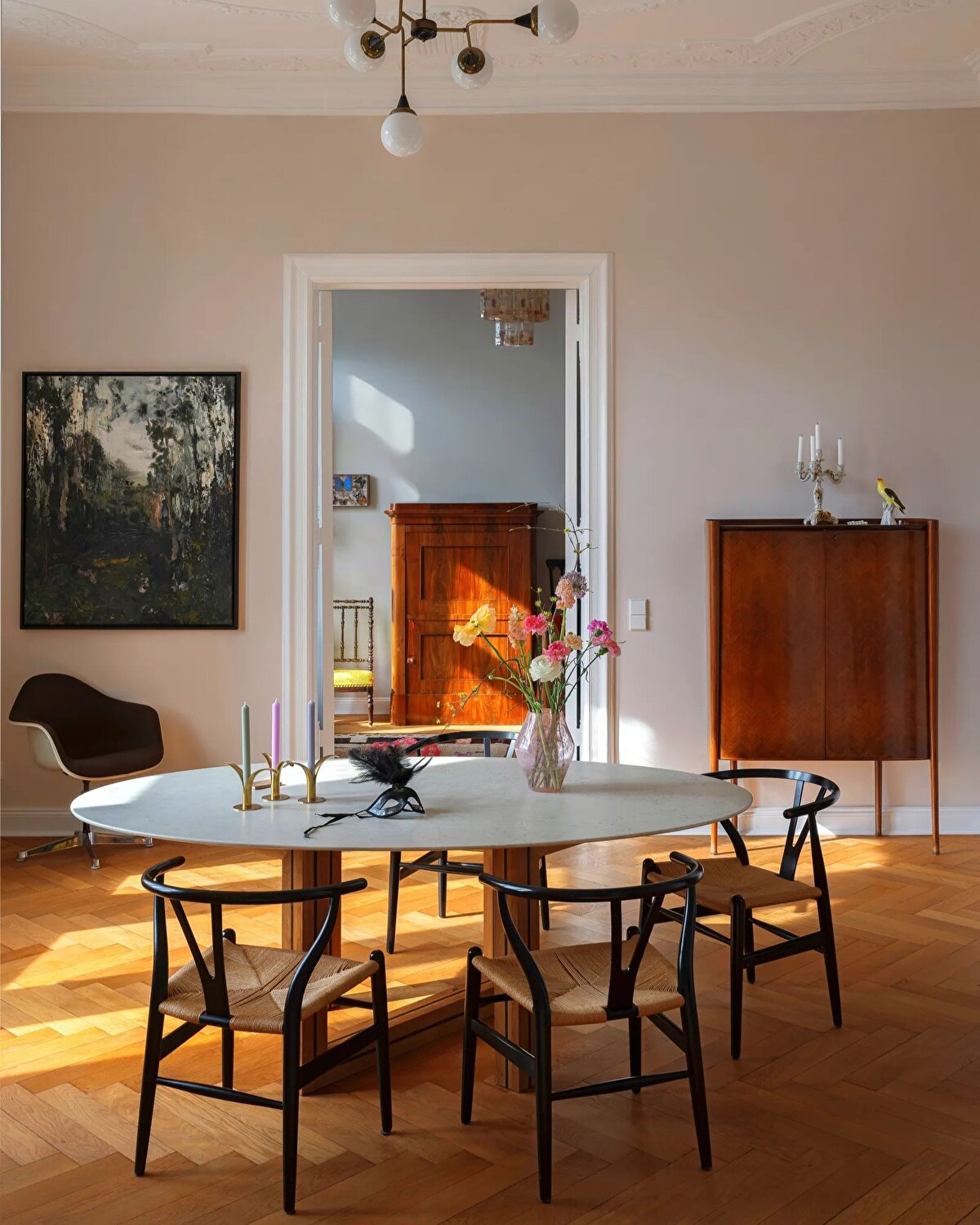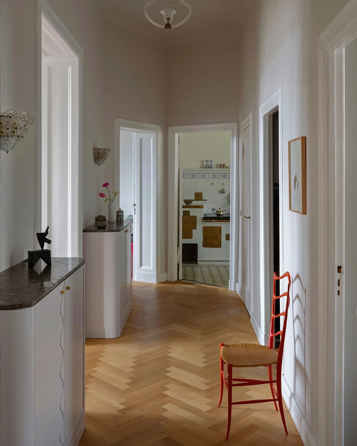 Vintage mobilyalar mekânın karakterinde önemli bir rol oynuyor: Wishbone ve Eames sandalyeleri, Murano cam lambalar ve Corradi Dell'Aqua tasarımı bir koltuk, yerleştirildikleri alanlara nostaljik bir sıcaklık katıyor. Sanat eserleri ve mimarın uzun yıllardır biriktirdiği objeler de bu atmosferi zenginleştiriyor. Schmitz, orijinal parkeleri, kapı ve pencere kollarını, porselen fırını özenle korurken; yaşam alanında eskiden bölünmüş olan oturma ve yemek odasını birleştirerek daha akıcı ve ferah bir düzen oluşturuyor.