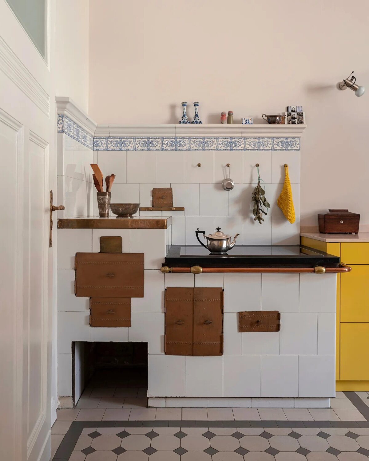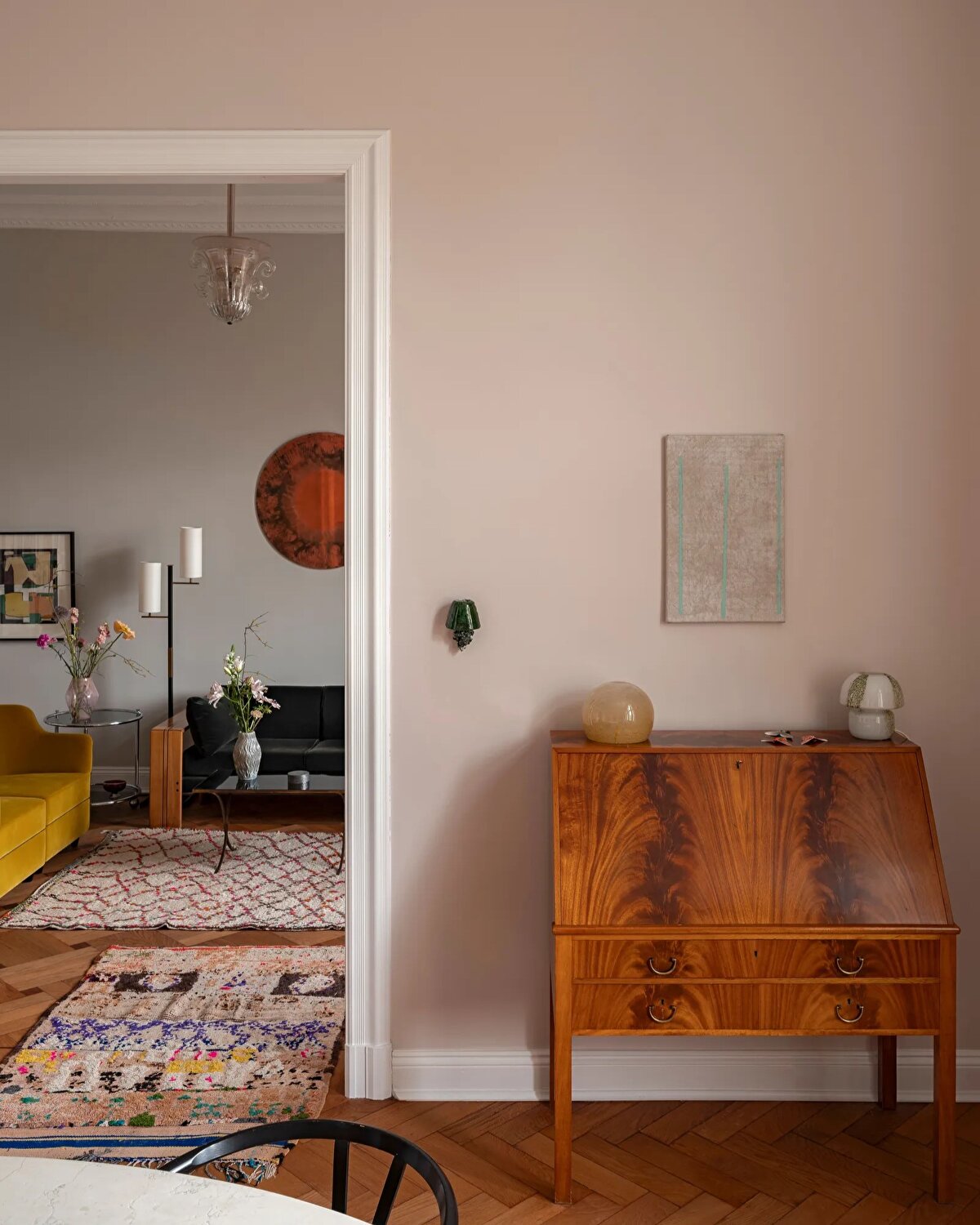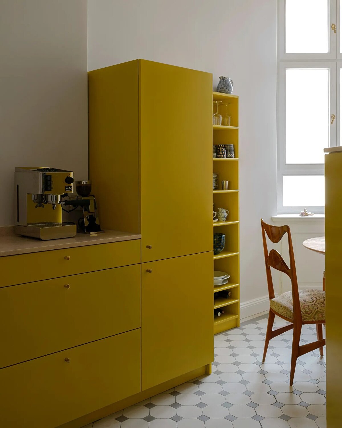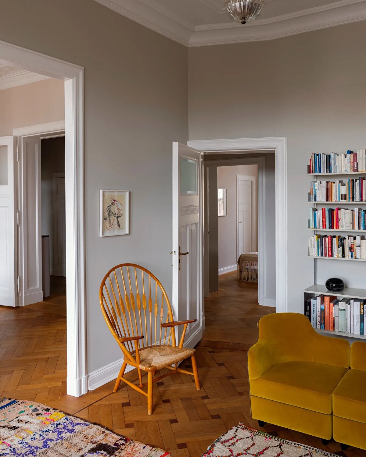 Christiane Schmitz'in Berlin-Charlottenburg'daki Lietzensee yakınlarındaki 120 metrekarelik eski dairesi, mimarın kişisel estetiğini ve mesleki birikimini yansıtan sofistike bir iç mekân deneyimi sunuyor. 1905 tarihli binada yer alan daire hem orijinal mimari unsurları koruyor hem de çağdaş ve kişisel dokunuşlarla yeniden yorumlanıyor. Schmitz, mekânı tasarlarken duvarlarda graurosa (gri-pembe) ve koyu mavi gibi zarif renk tonlarını tercih ediyor; bu tonları ise canlı detaylarla dengeliyor. Özellikle sarı mutfağı, güne enerjik bir başlangıç vadeden bir “dopamin-kick" olarak tanımlıyor.