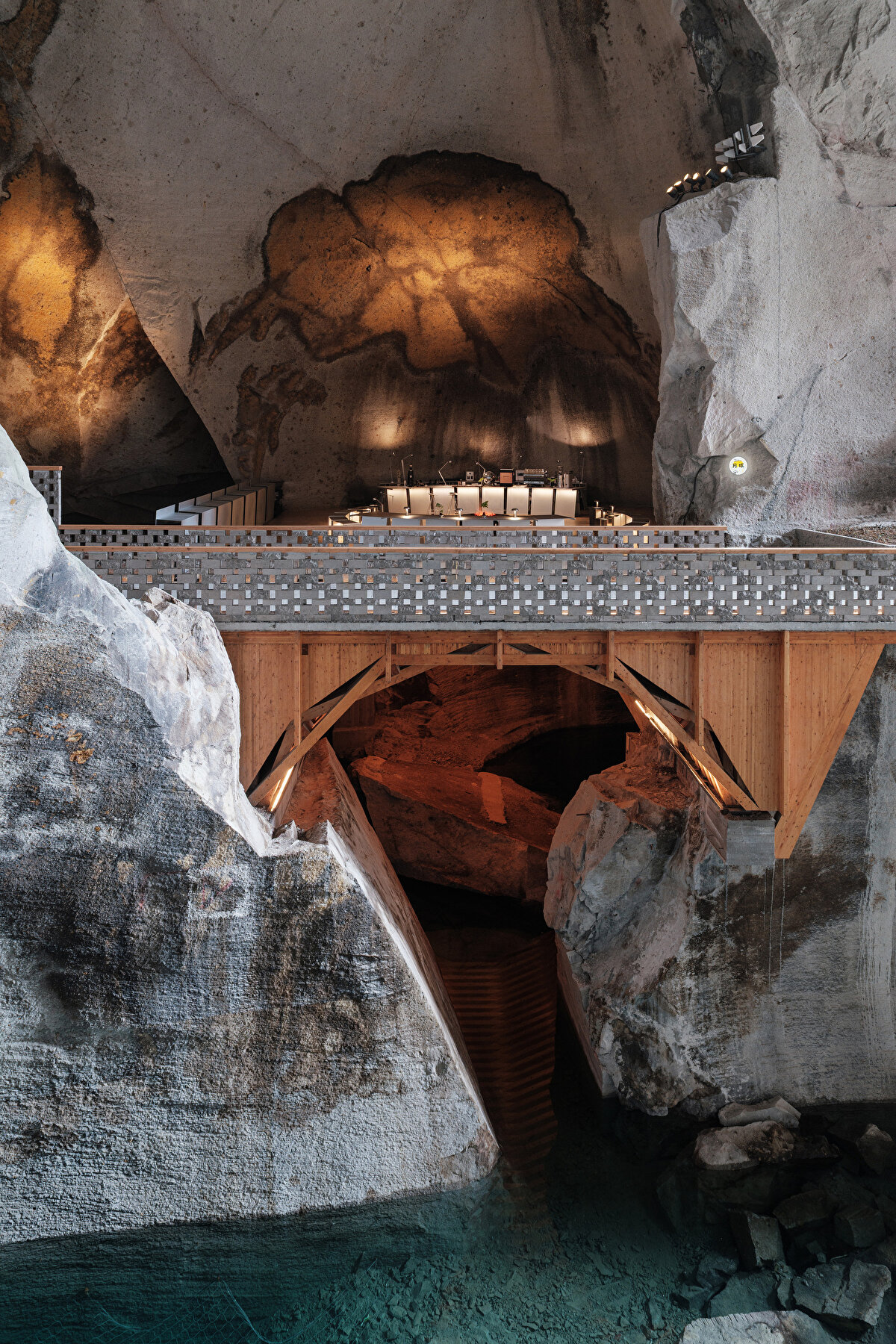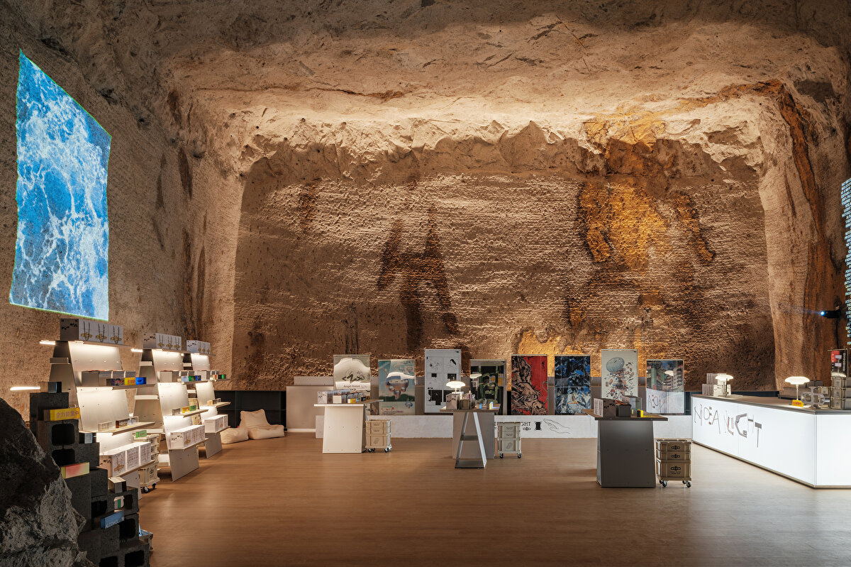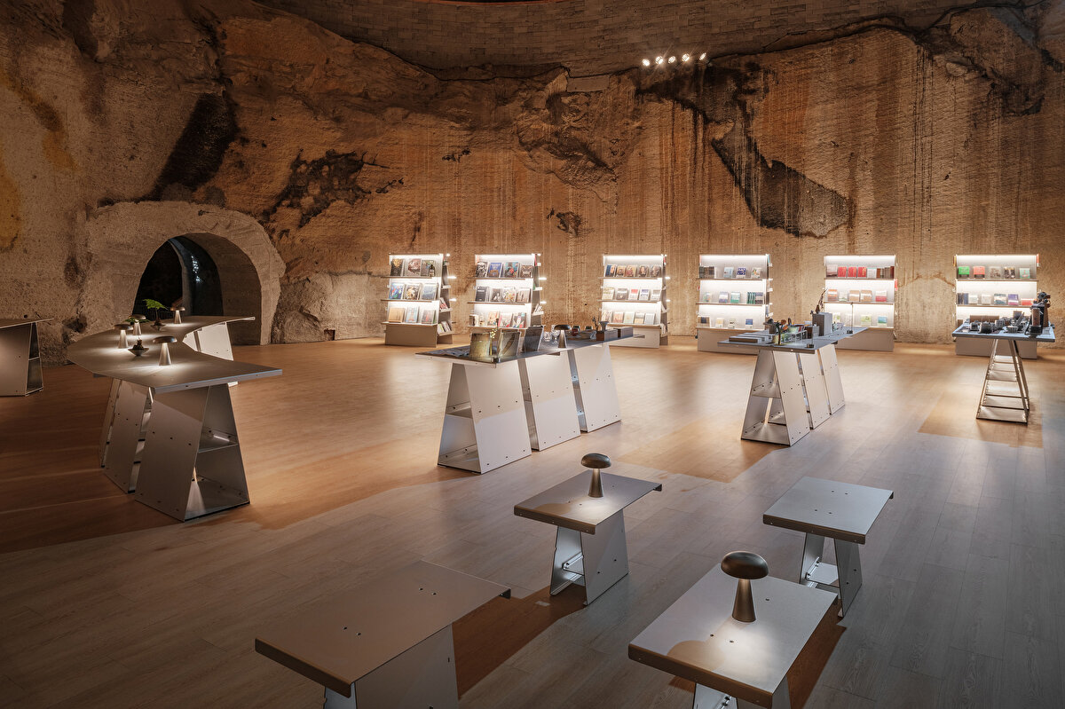 The first area, planned as a café, is shaped around the density created by natural mineral deposits on the stone wall, giving the space a strong focal point. The second space offers a more permeable scenario, defining a flexible open space in the centre with bookcases, a bar and a reception unit. The pop-up store located in the third area is positioned on a platform opening onto a narrow courtyard formed by high stone walls. Atelier Moo's design prioritises the physical presence of the surrounding context while placing spatial flexibility at the core of its design principles.