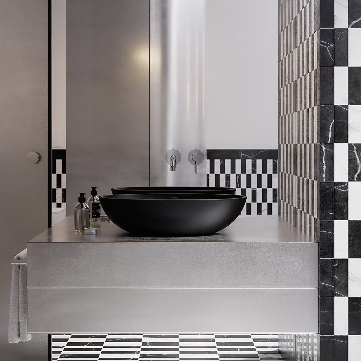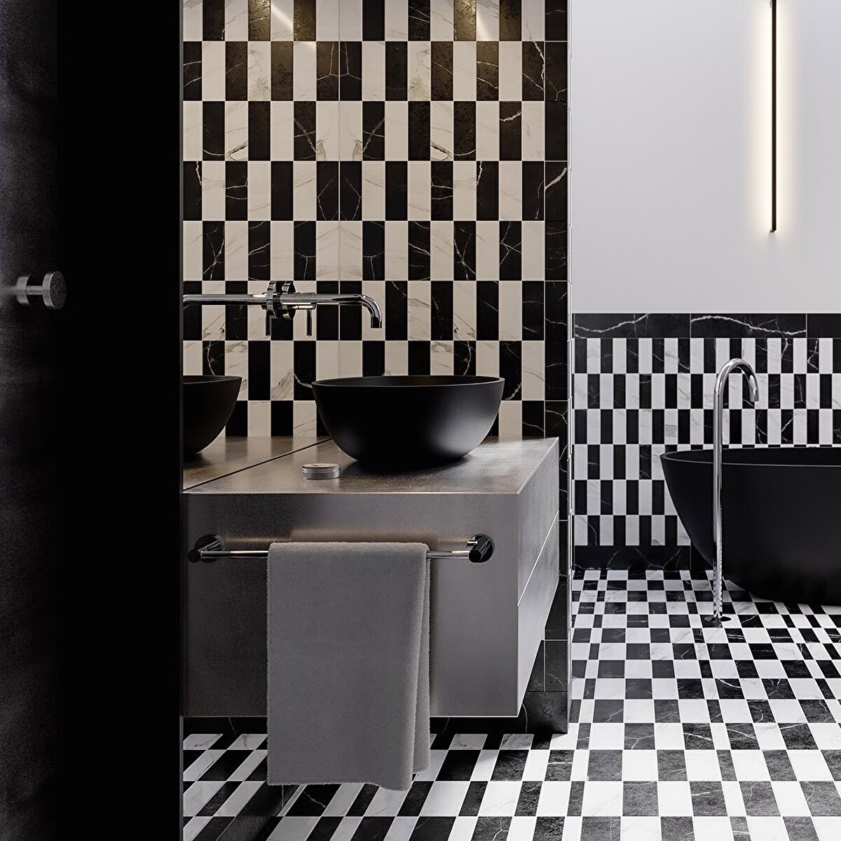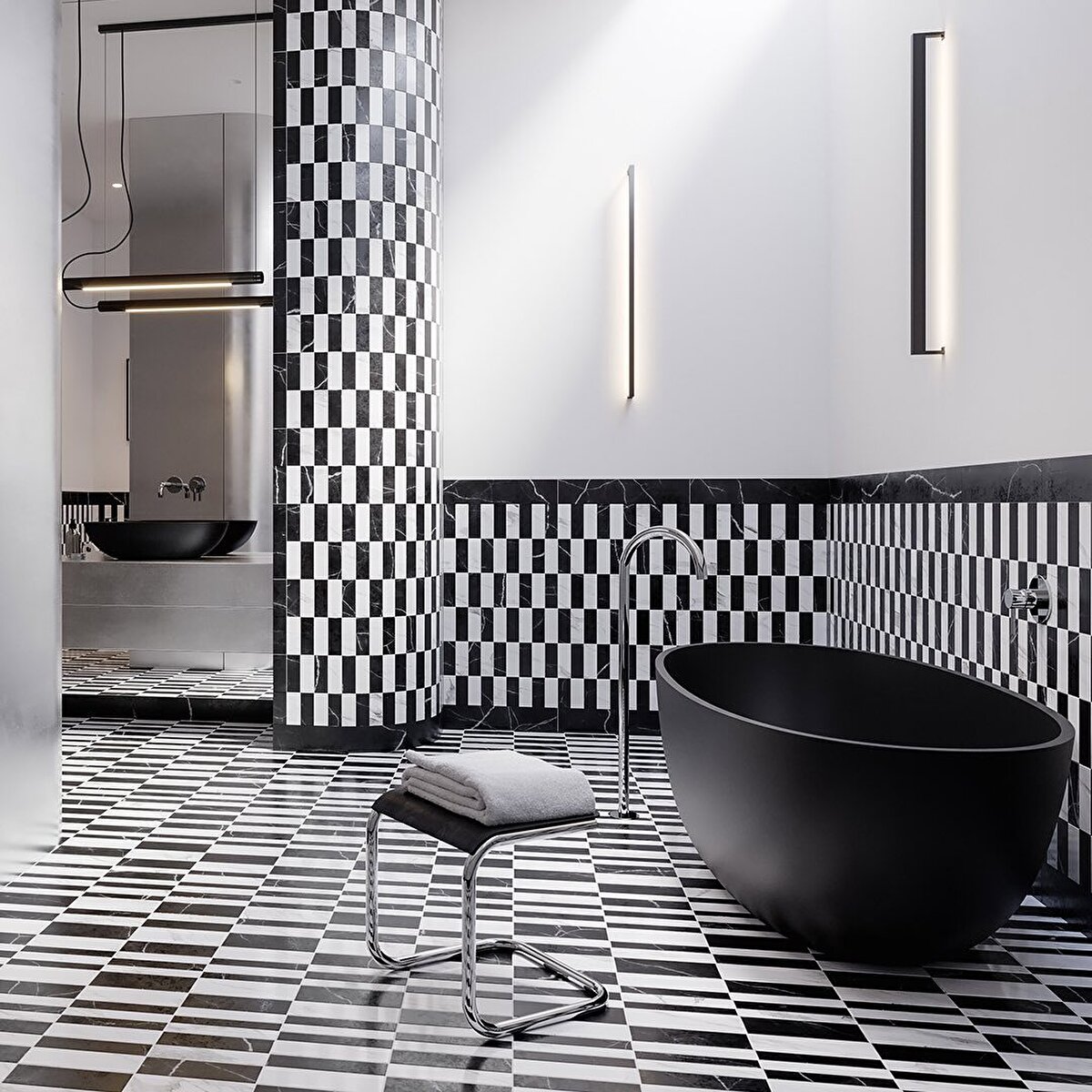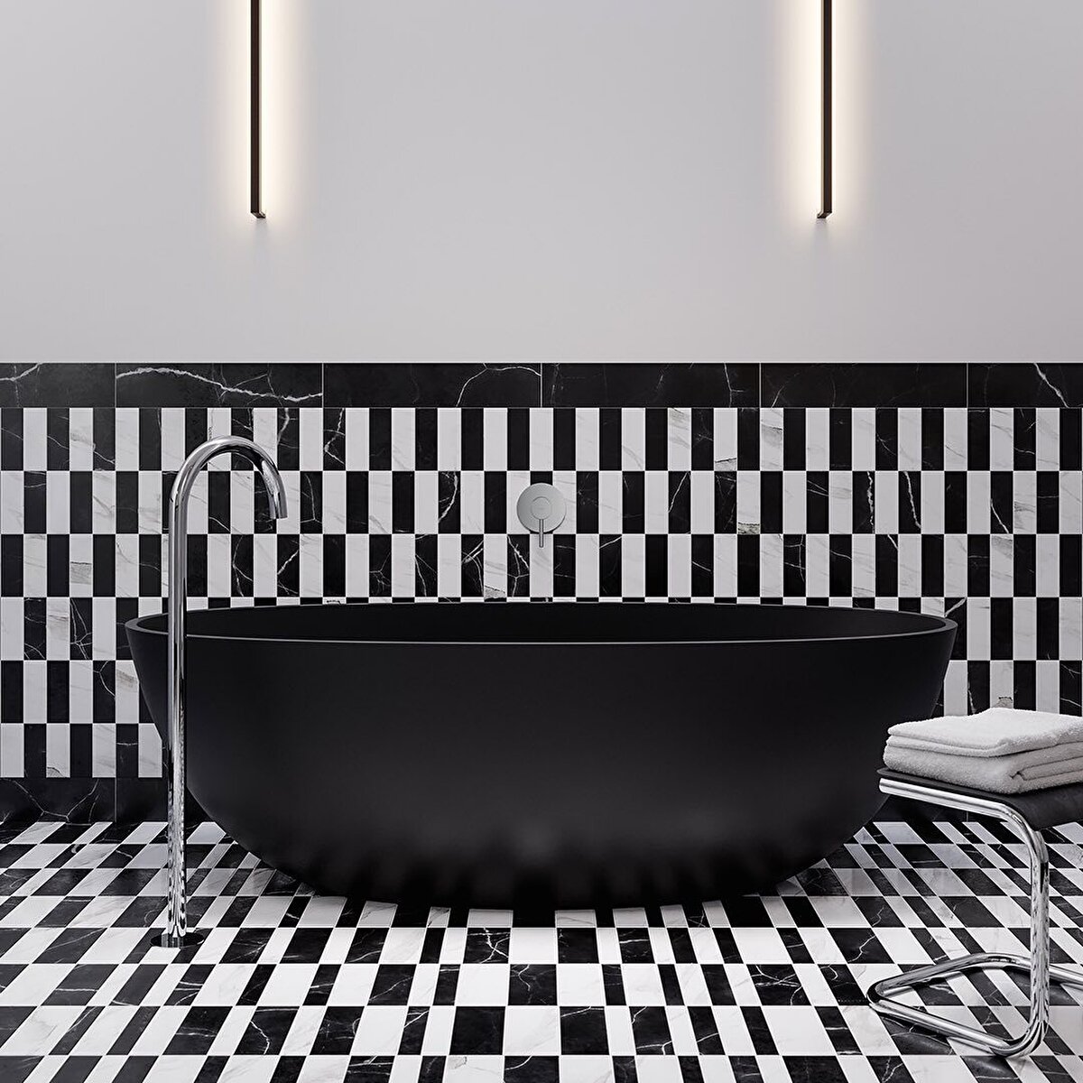 Banyonun belirleyici unsurlarından biri hem duvarları hem de zemini süsleyen siyah-beyaz mozaik karolar oluyor. Bu zıt renk dengesini, eliptik formlardaki lavabo ve küvette tercih edilen mat siyah materyal takip ediyor.