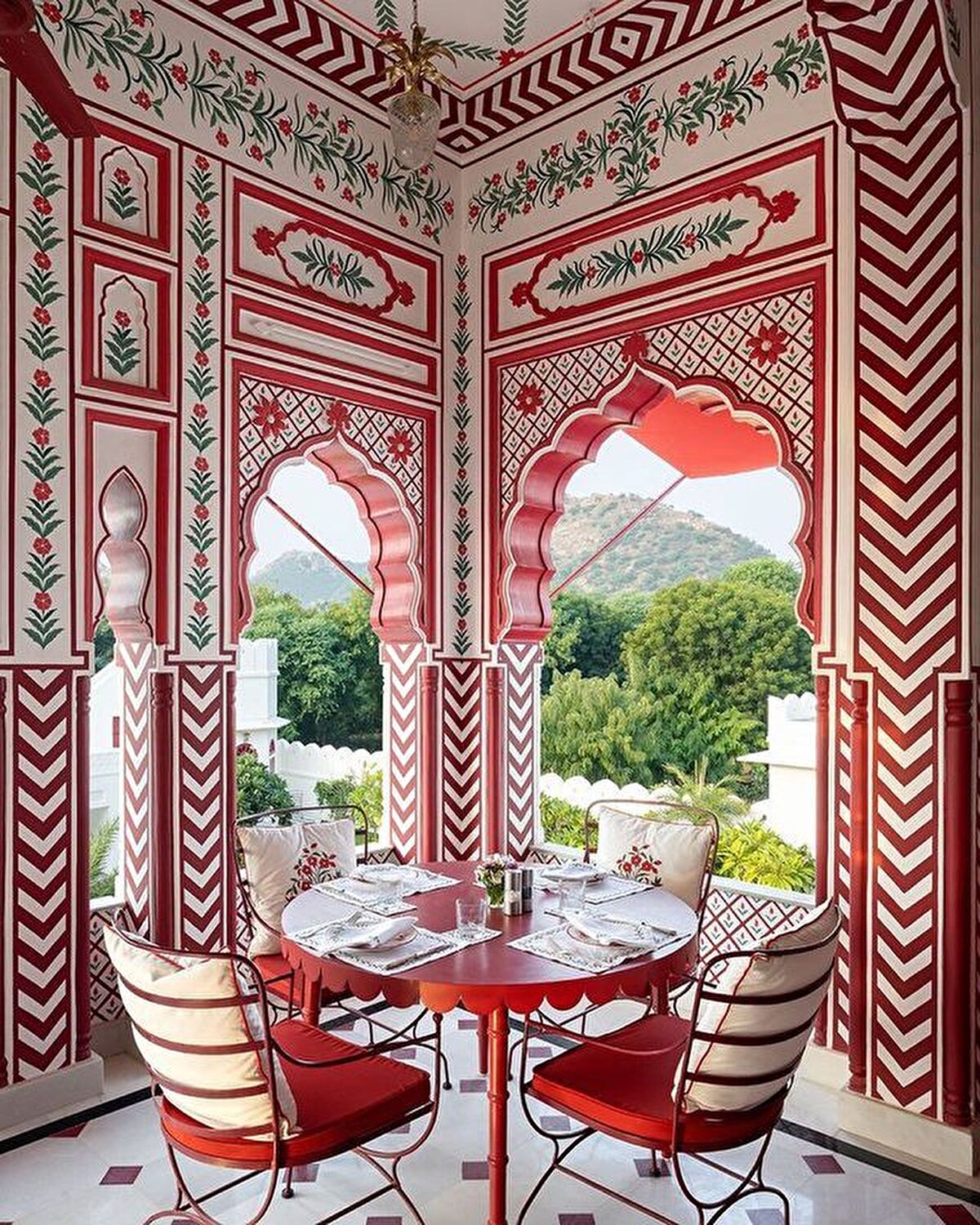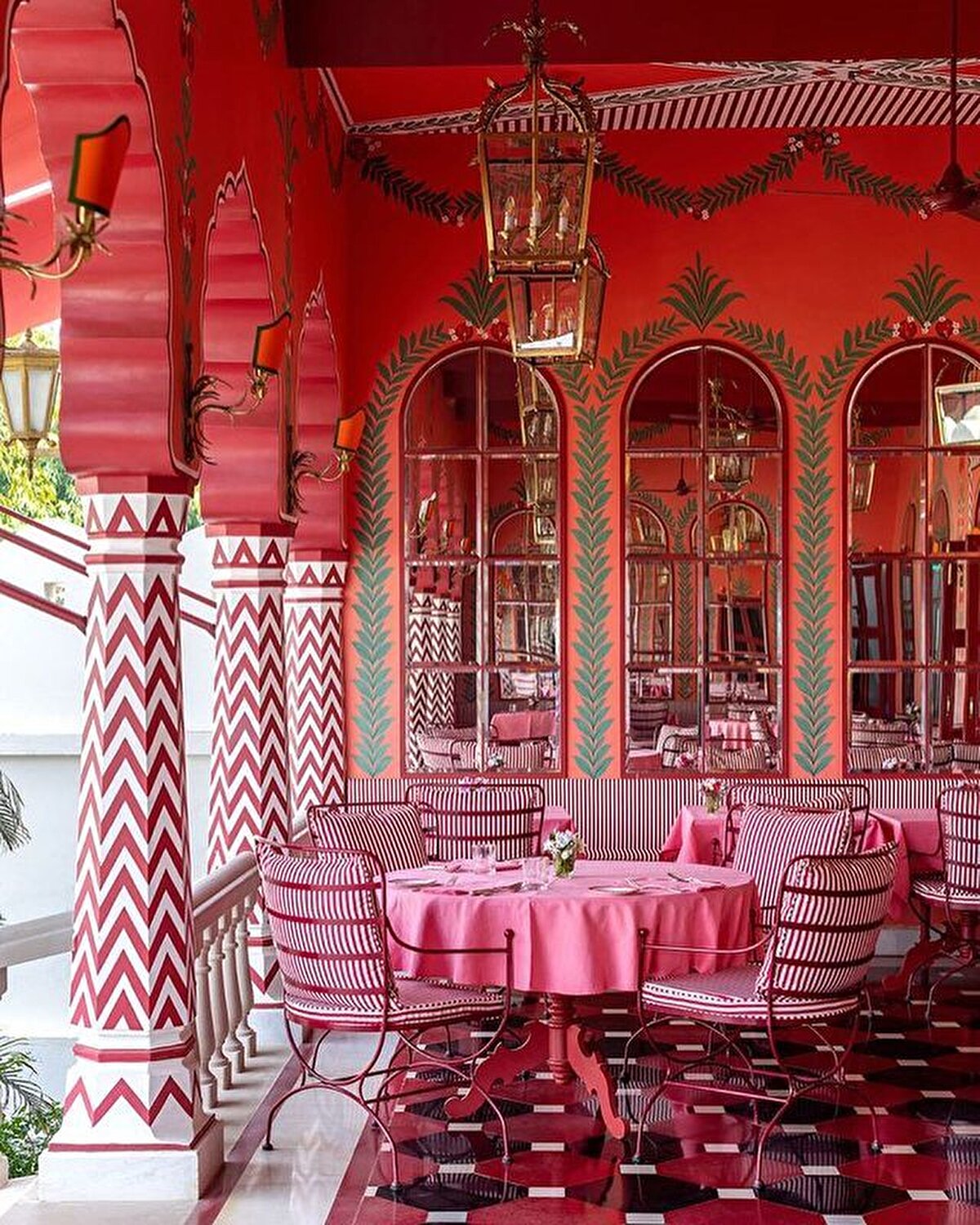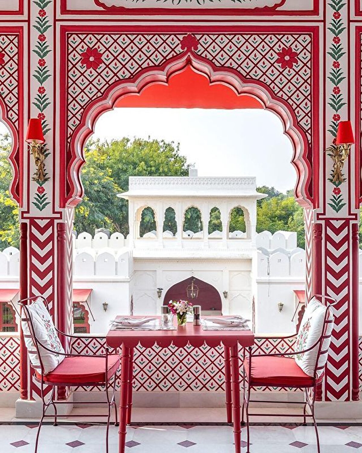 A living example of maximalism, the boutique hotel is located close to the Rajasthani capital. India's history inspired entrepreneur @barbara_miolini and Dutch designer Marie Anne Oudejans (@m.a.jaipur) to choose the colours and patterns for the interiors of the nine-room hotel. Built in the 1980s, it has been recently renovated and is now open to visitors, its structure characterised by multi-columned arches and layers of ornamentation.