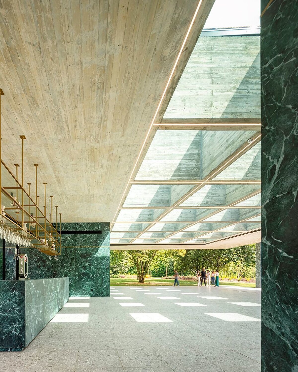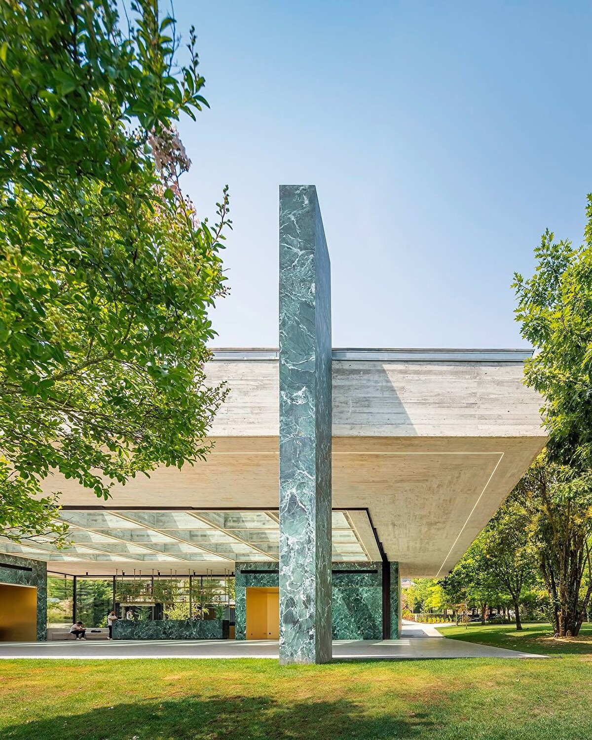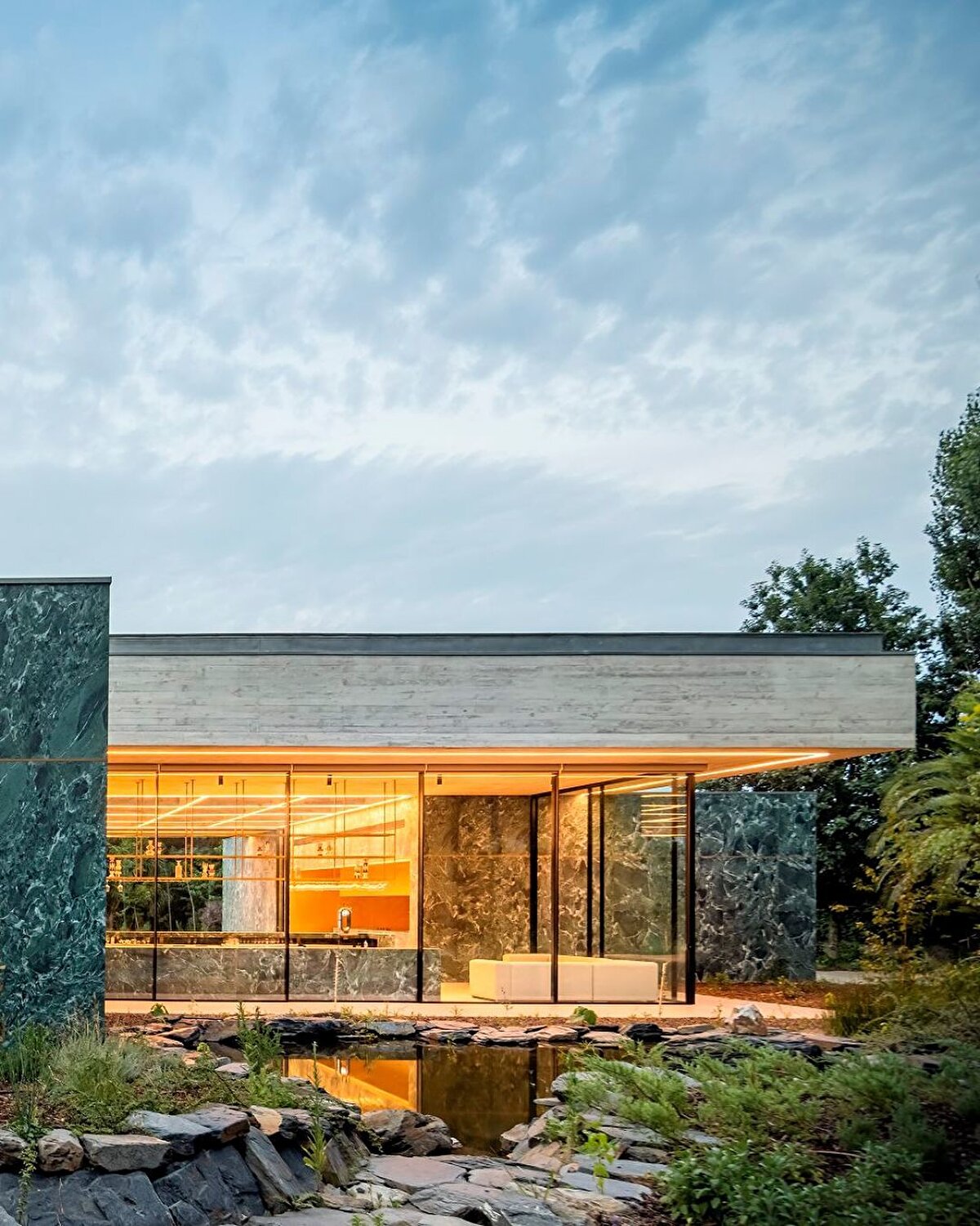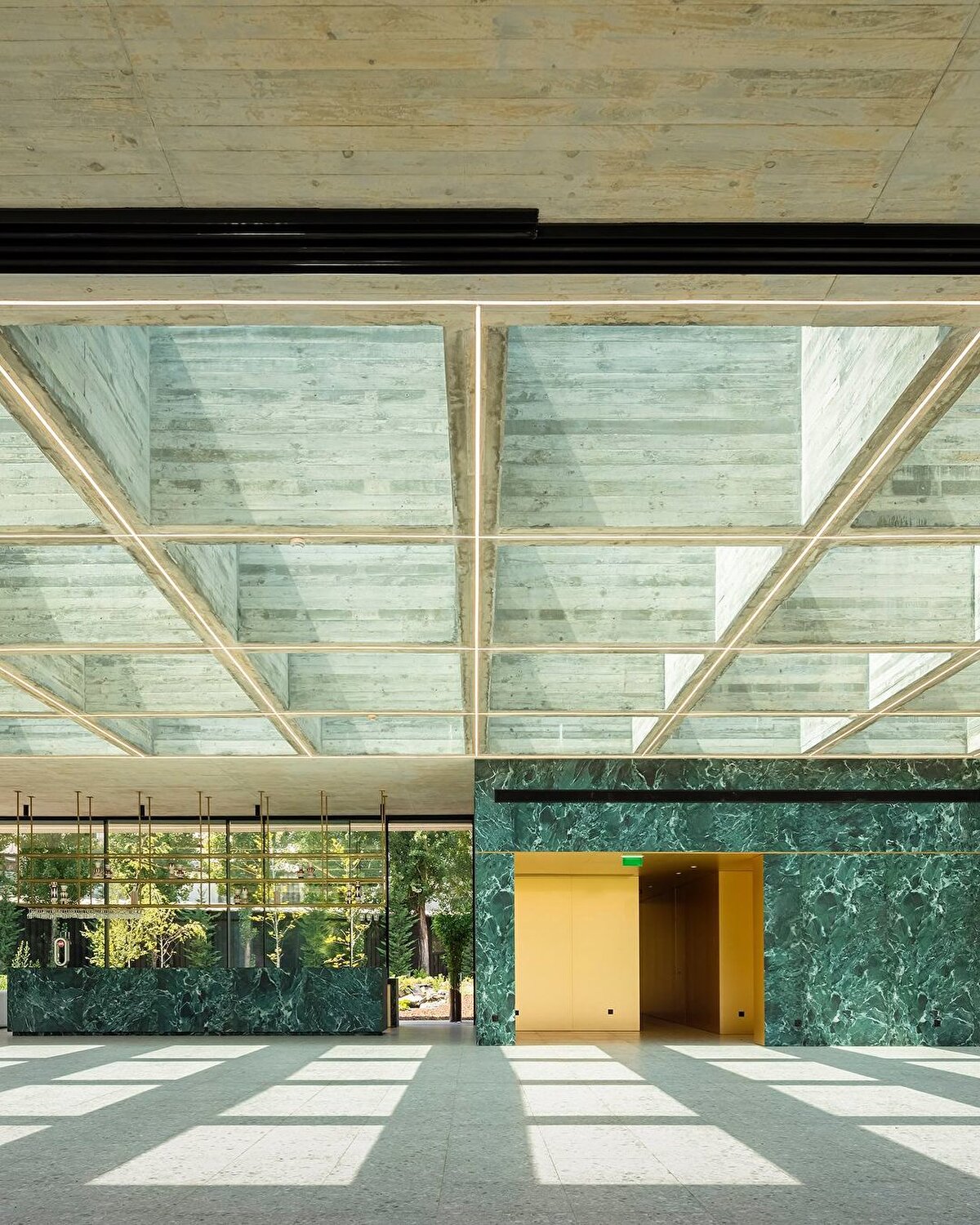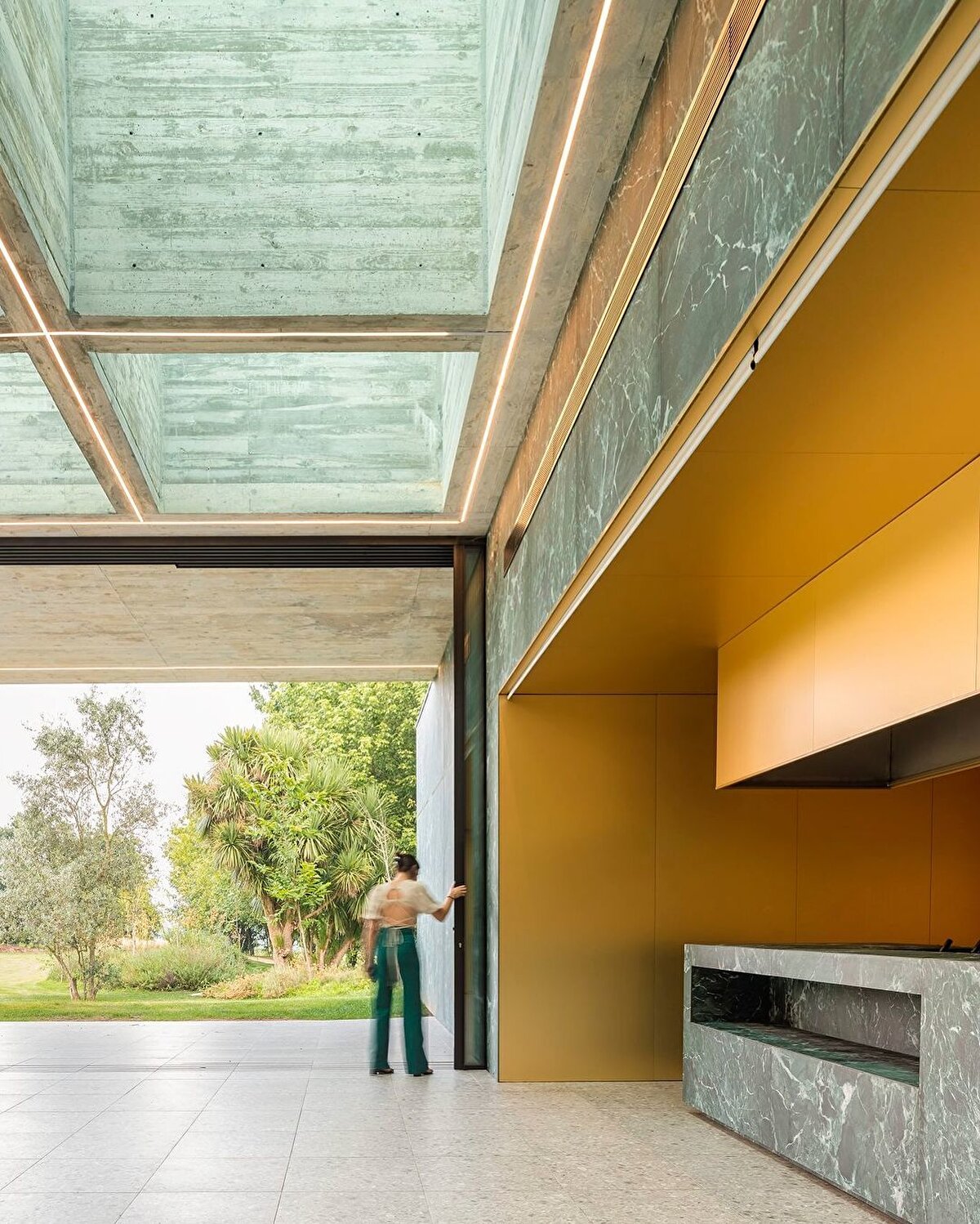 Kullanılan malzemeler de bu etkiyi destekleyerek ham betonun kaba dokusunu yeşil mermer, metal detaylar ve ahşap işçiliklerinden oluşan unsurlarla harmanlıyor.