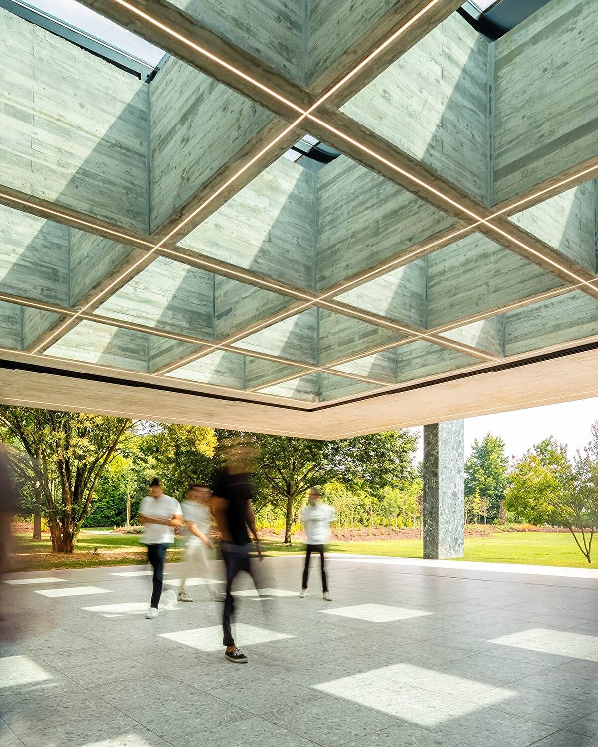 Modernist ve minimalist mimariyi bir araya getiren tasarım, betonarme kaset döşeme tavanı, sanatsal cephe kompozisyonları ve cömert genel oranlarıyla yalın fakat etkileyici bir ambiyans sunuyor.