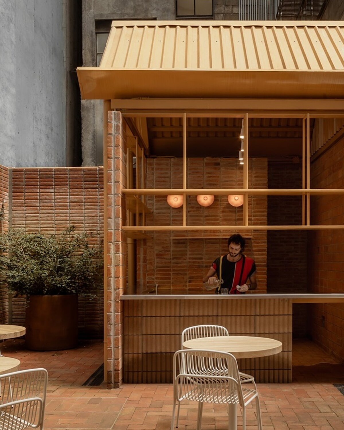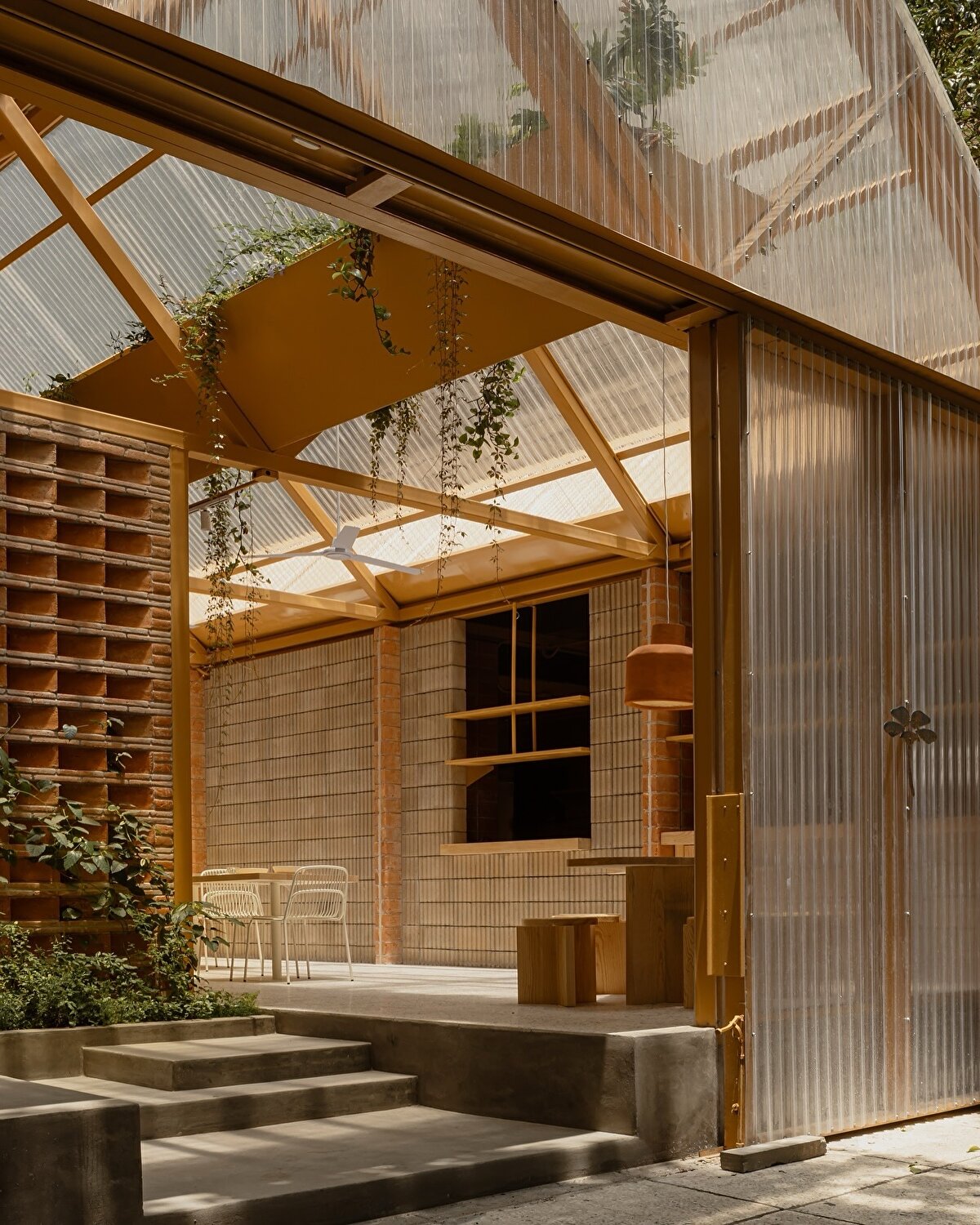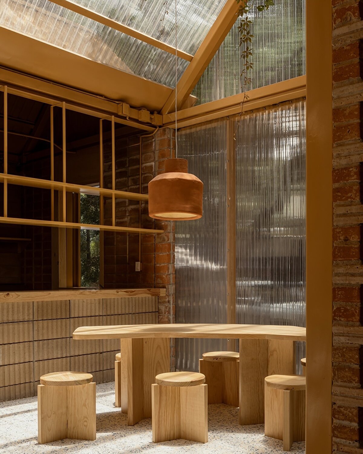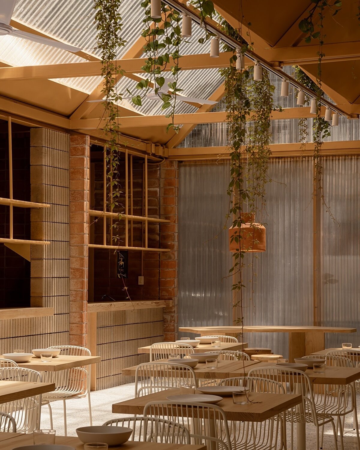 Plumbago Restaurant, located in Mexico City, offers a spatial setup where local materials are used in a contemporary language. Translucent polycarbonate panels create a balance between privacy and light transmission, supporting a sense of openness in the interior. Exposed wooden trusses and brick walls highlight the material texture by making the structural system of the building visible.