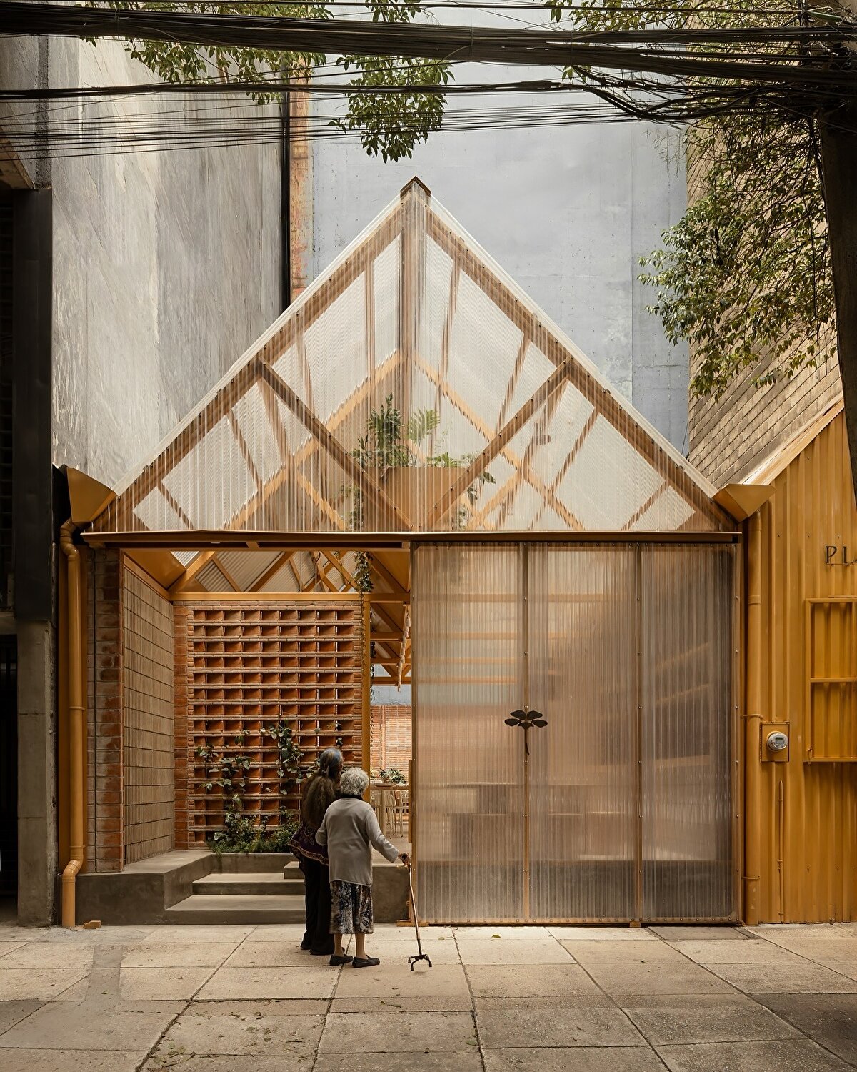 Mexico City'de konumlanan Plumbago Restoran, yerel malzemelerin çağdaş bir dille kullanıldığı bir mekânsal kurgu sunuyor. Yarı saydam polikarbonat paneller, mahremiyet ile ışık geçirgenliği arasında bir denge oluştururken, iç mekanda açıklık hissini destekliyor. Açıkta bırakılan ahşap makaslar ve tuğla duvarlar, yapının taşıyıcı sistemini görünür kılarak malzeme dokusunu öne çıkarıyor.