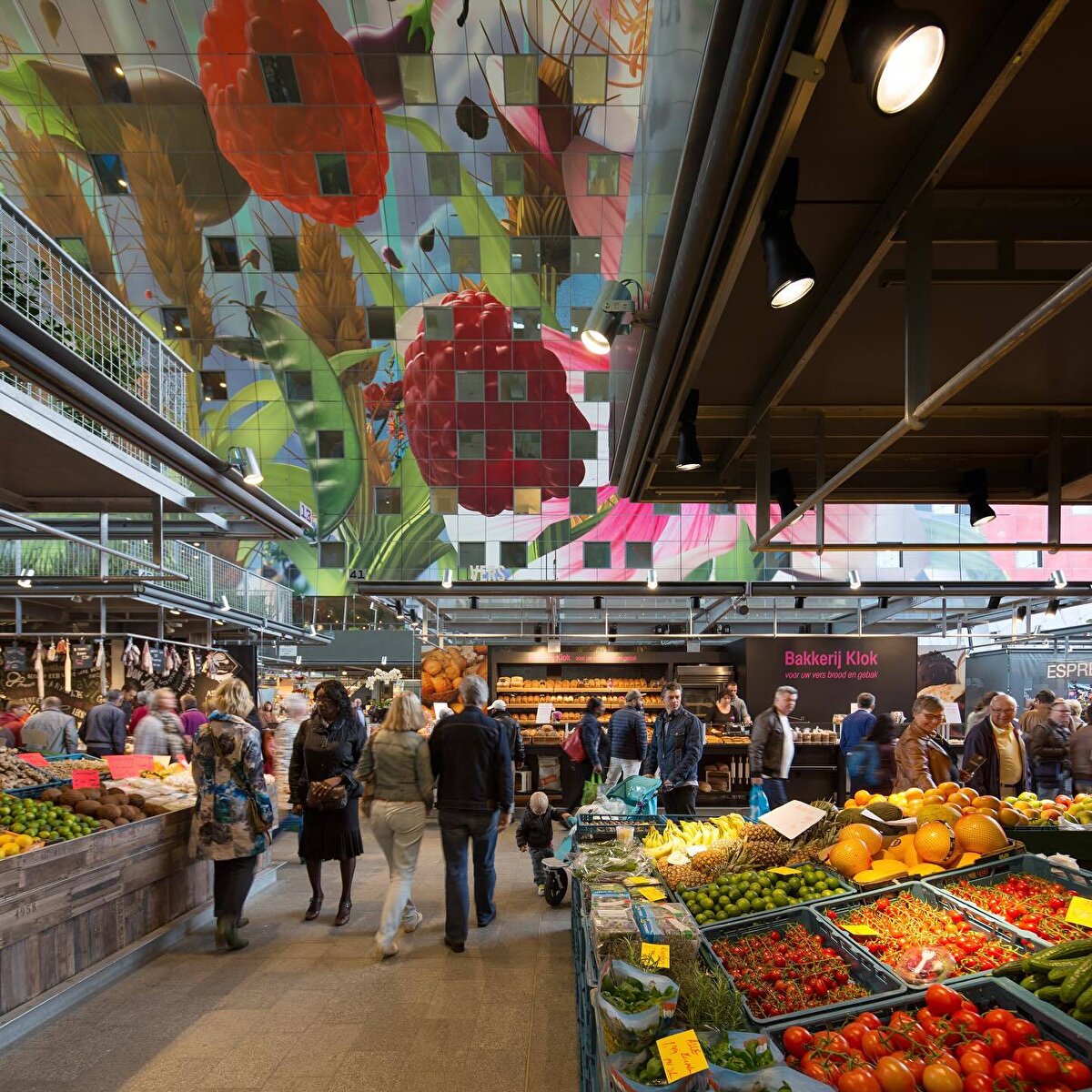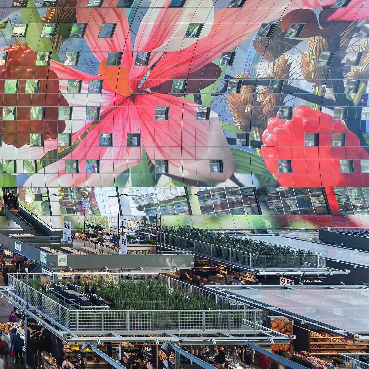With 228 apartments and 1,200 underground parking spaces on 95,000 square meters, it houses 96 fresh food stalls, restaurants, cafes, a supermarket and retail units. The huge mural “Cornucopia" by Arno Coenen and Iris Roskam, which adorns the interior of the building, references 17th-century Dutch still lifes with enlarged images of food, flowers and insects. This artistic work enhances the aesthetic appeal of the building and offers a visual feast.