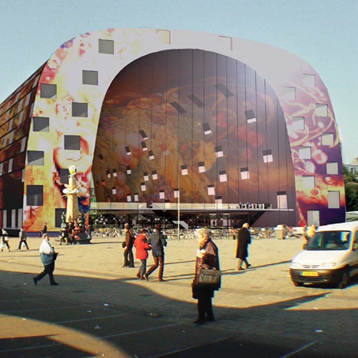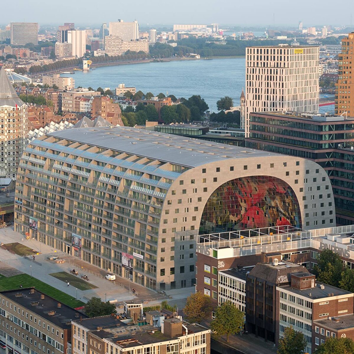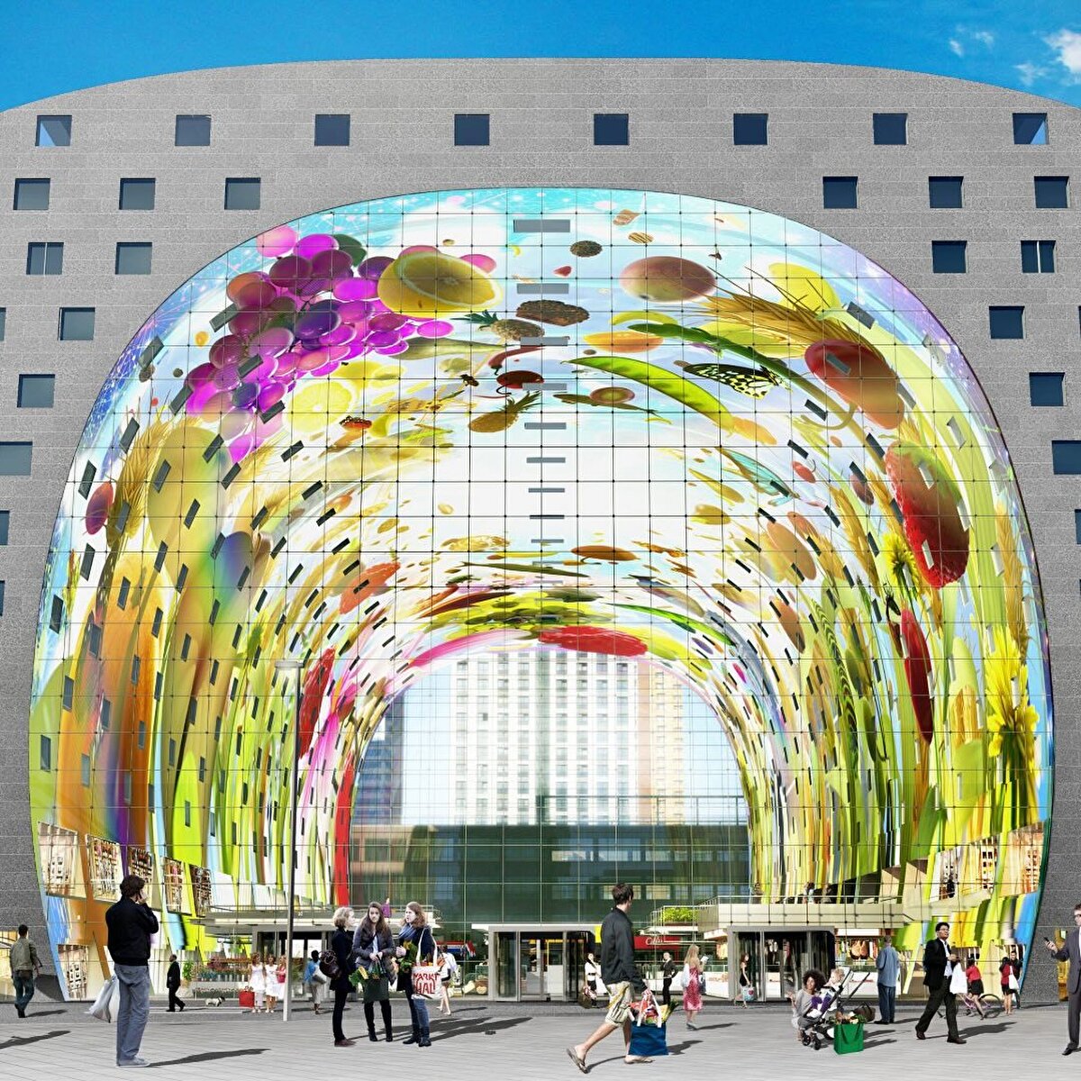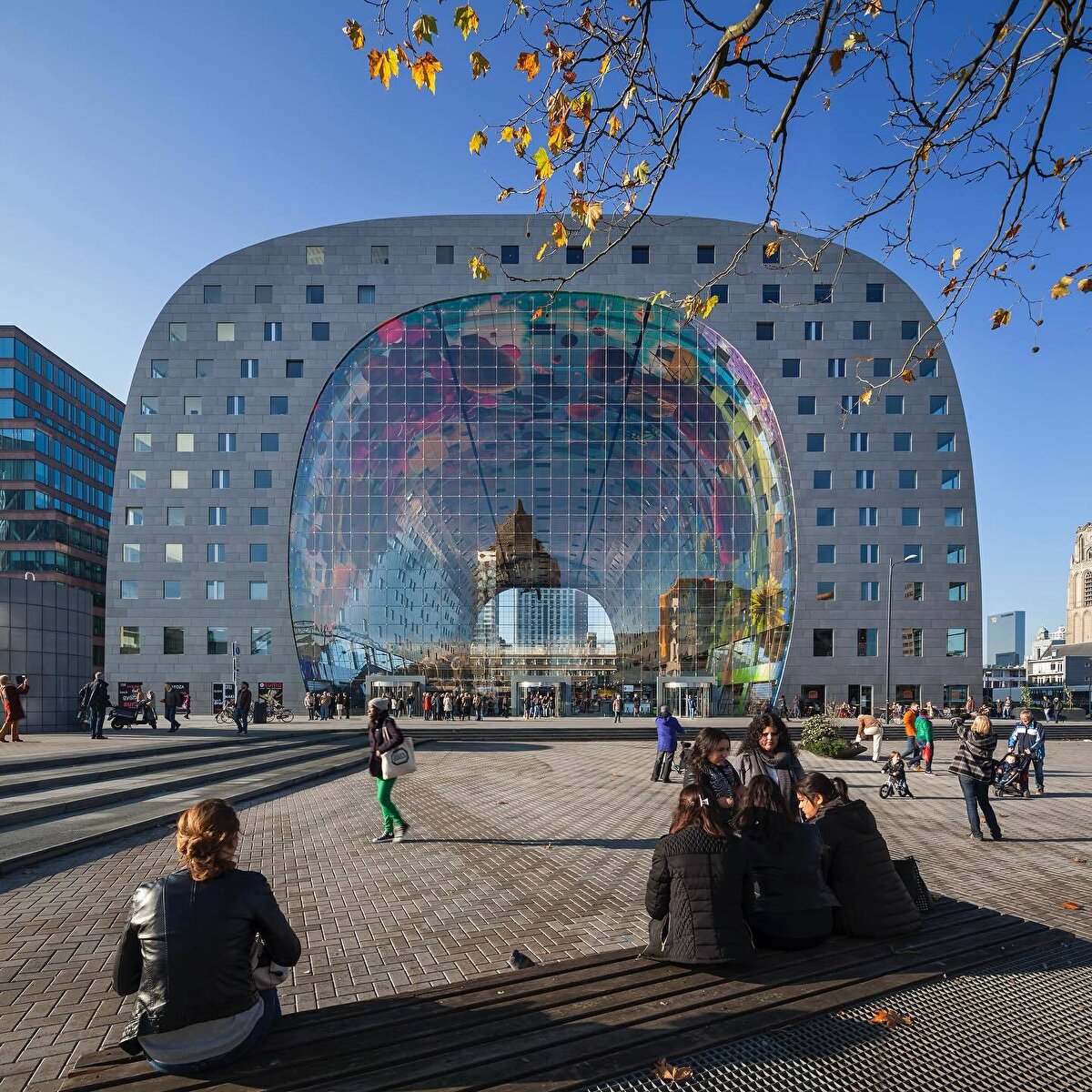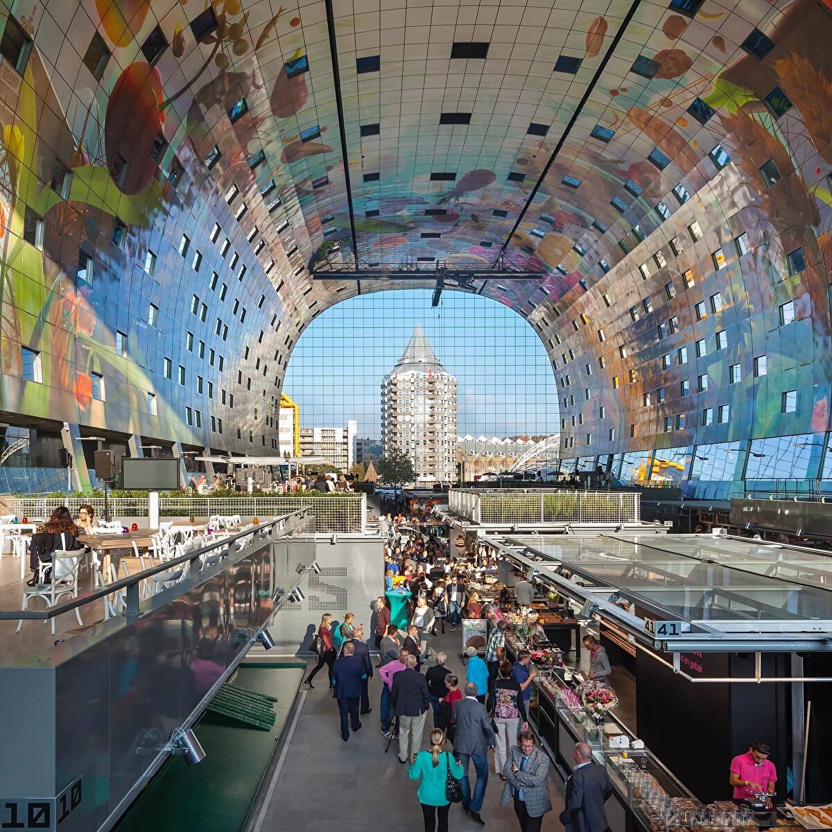 @mvrdv tarafından tasarlanan Markthal, Rotterdam'ın merkezindeki Laurenskwartier'de yer alan, yiyecek, eğlence, yaşam ve park alanlarını bir araya getiren sürdürülebilir bir yapı olarak öne çıkıyor. Yapı, büyük bir kemerin altında, ziyaretçilere alışveriş, yemek ve sosyal yaşam alanları sunan kapalı bir pazar meydanı olarak tasarlanıyor.