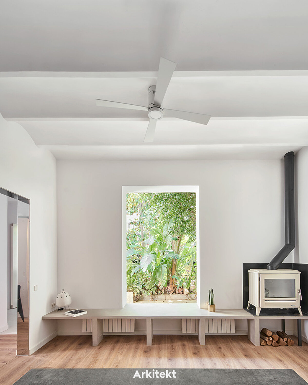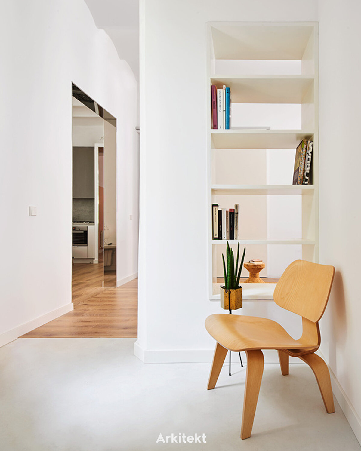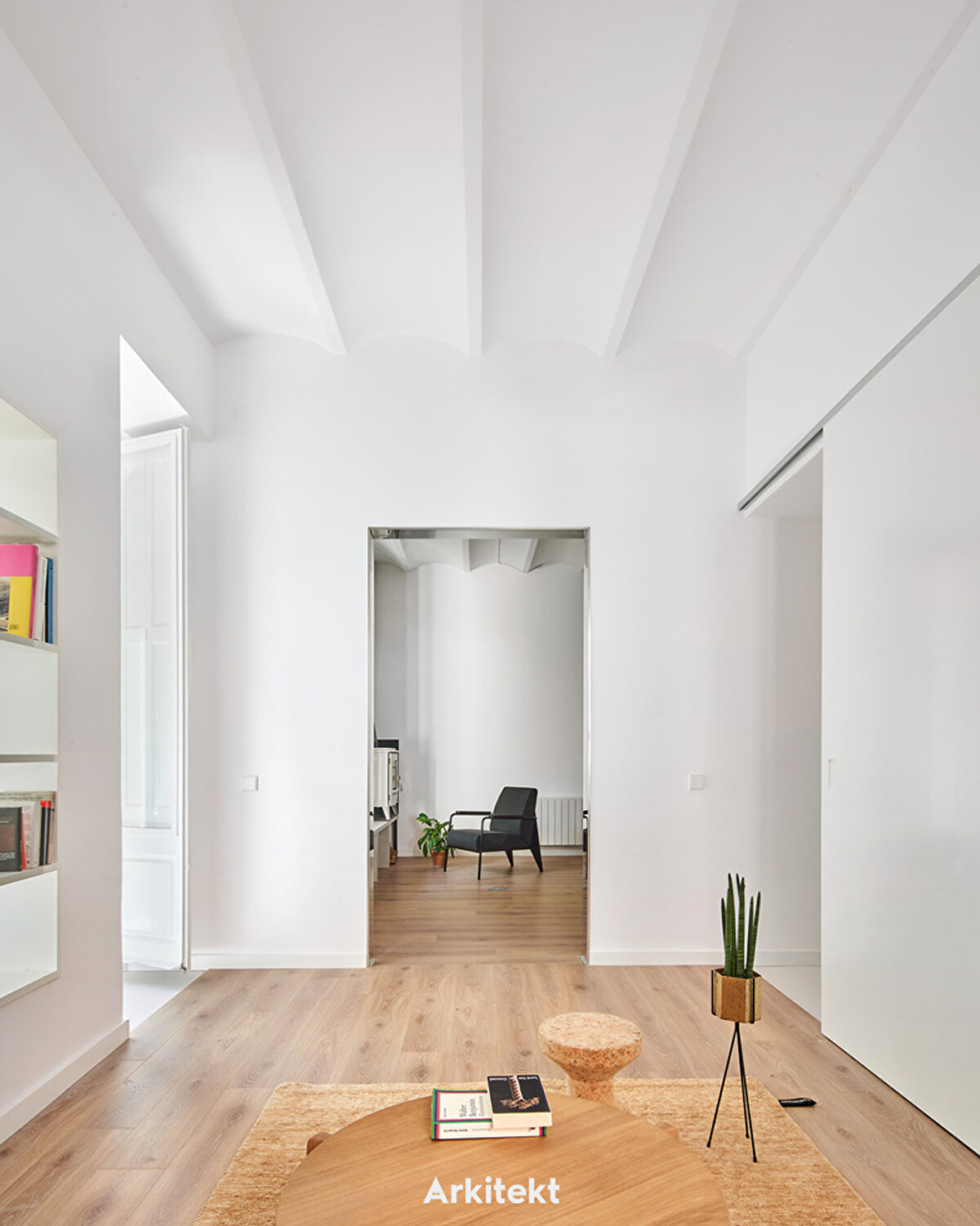 Taşıyıcı duvarların ve mekânsal boşlukların ön plana çıktığı proje, minimal bir tasarım anlayışına sahip.