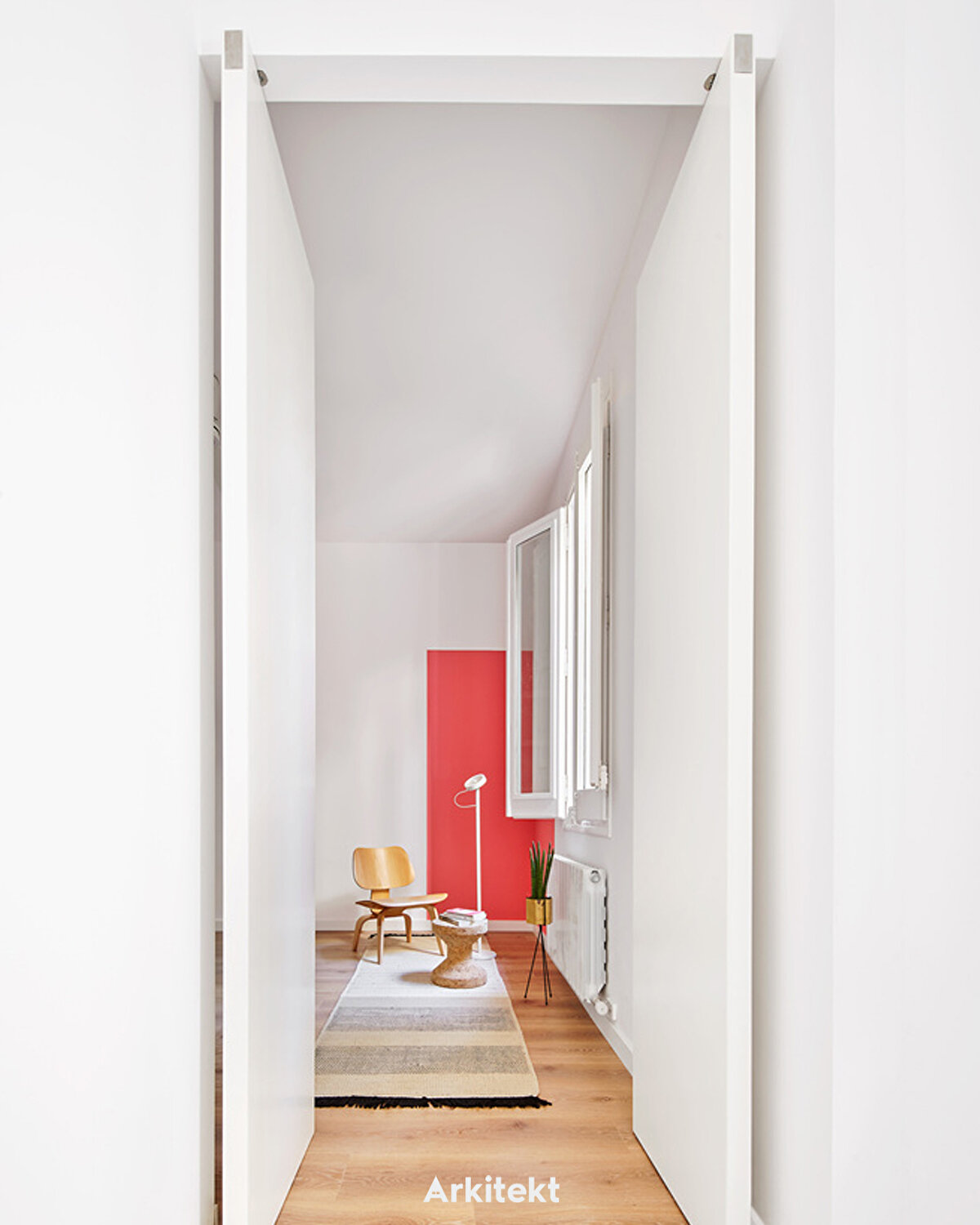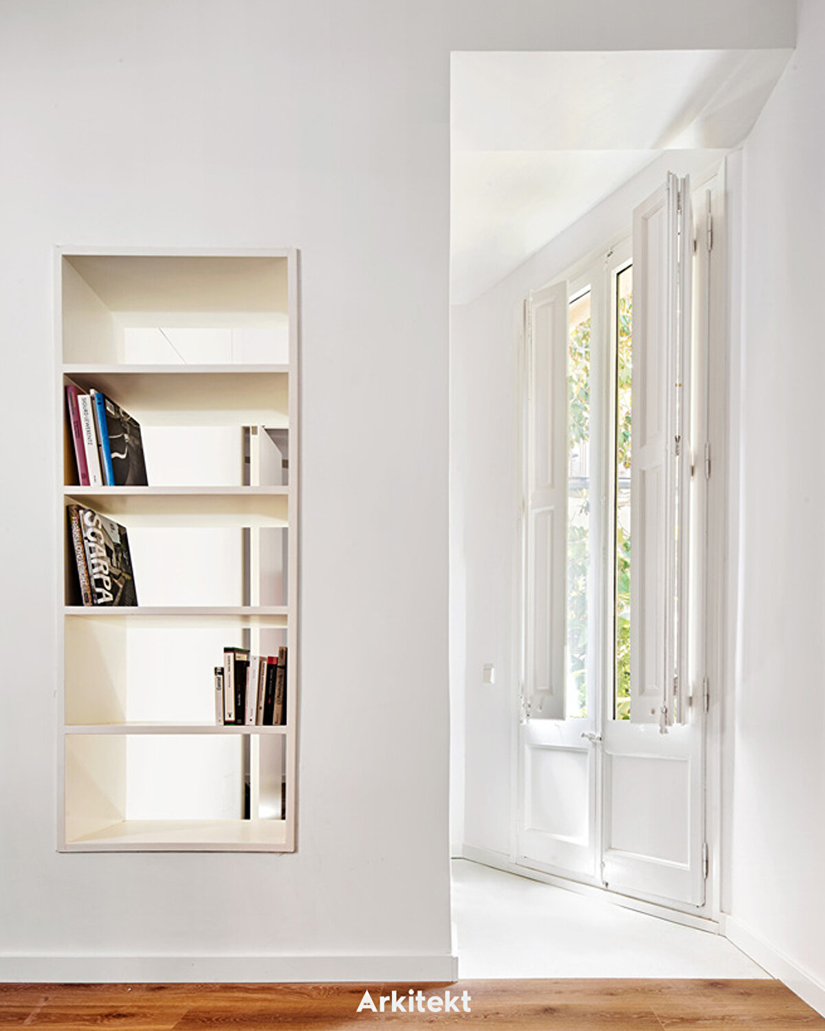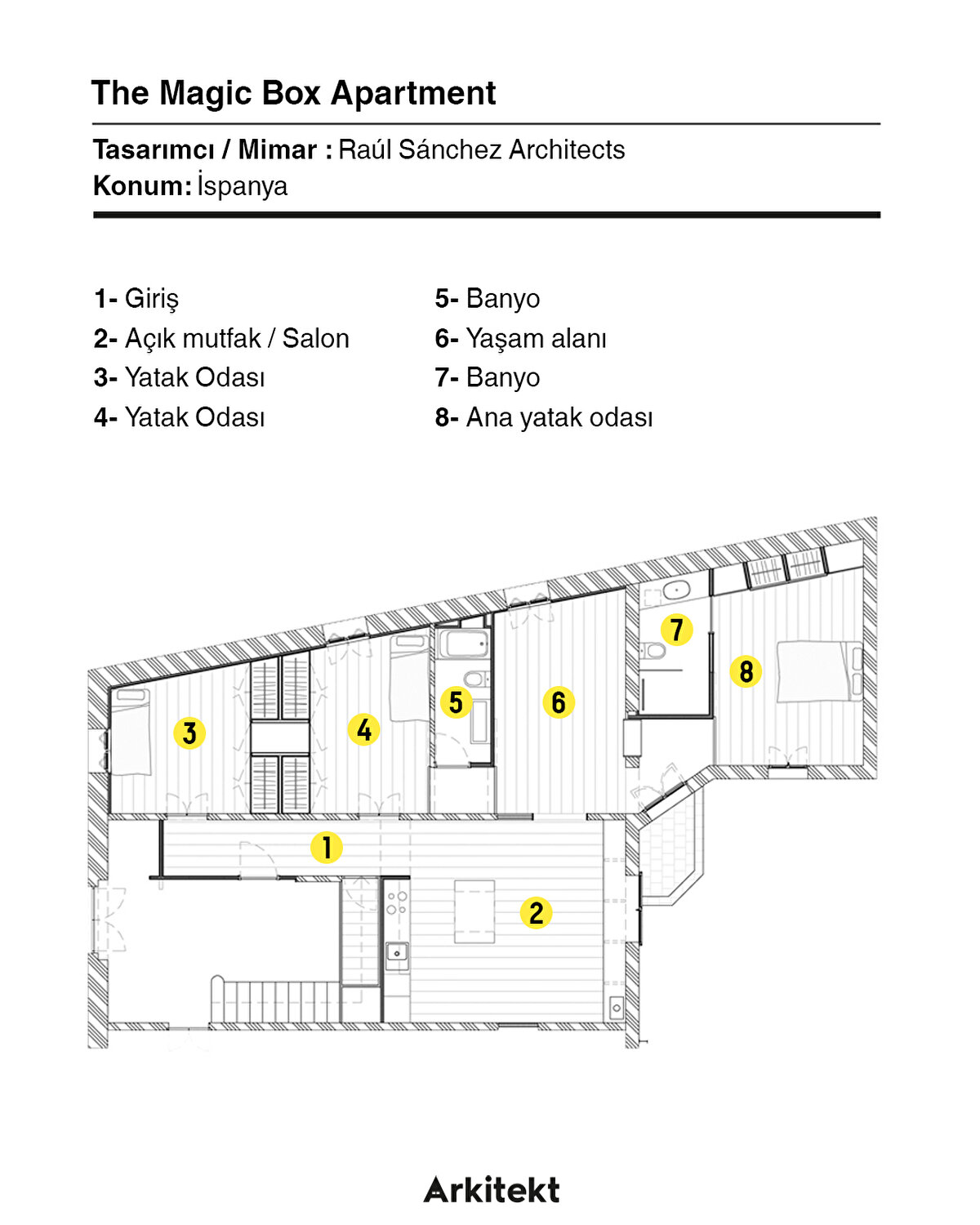 Taşıyıcı duvarların ve mekânsal boşlukların ön plana çıktığı proje, minimal bir tasarım anlayışına sahip.