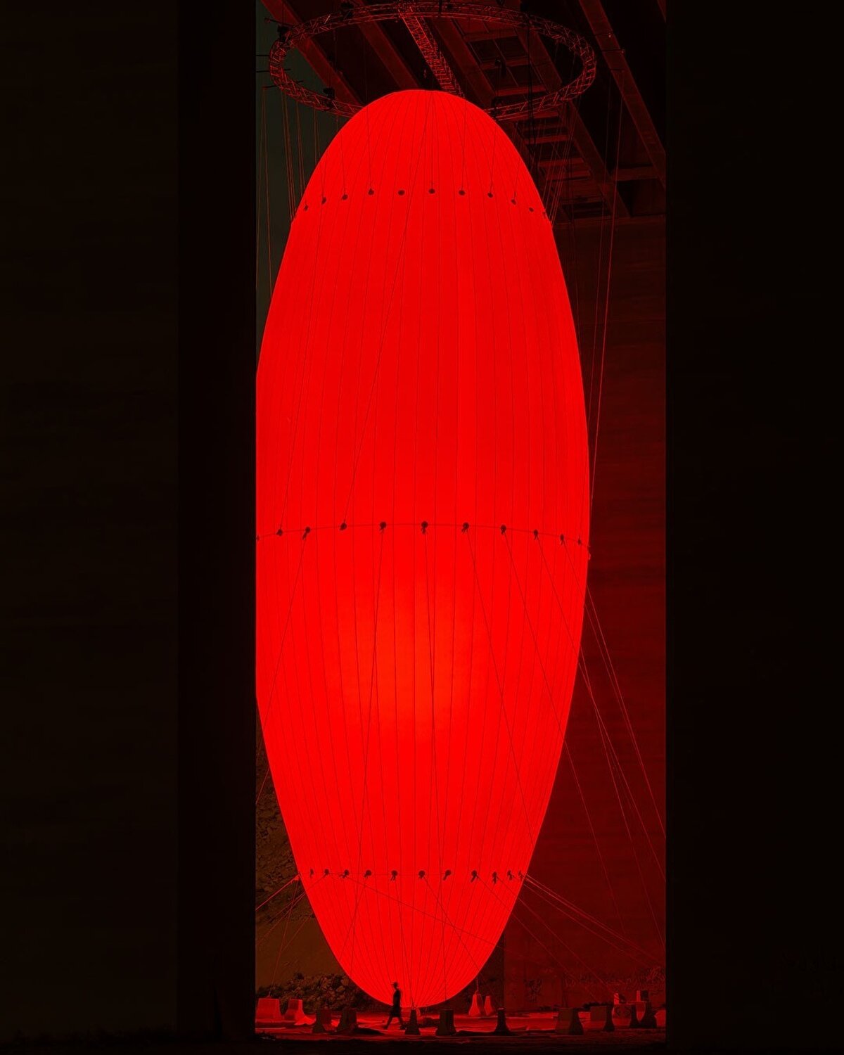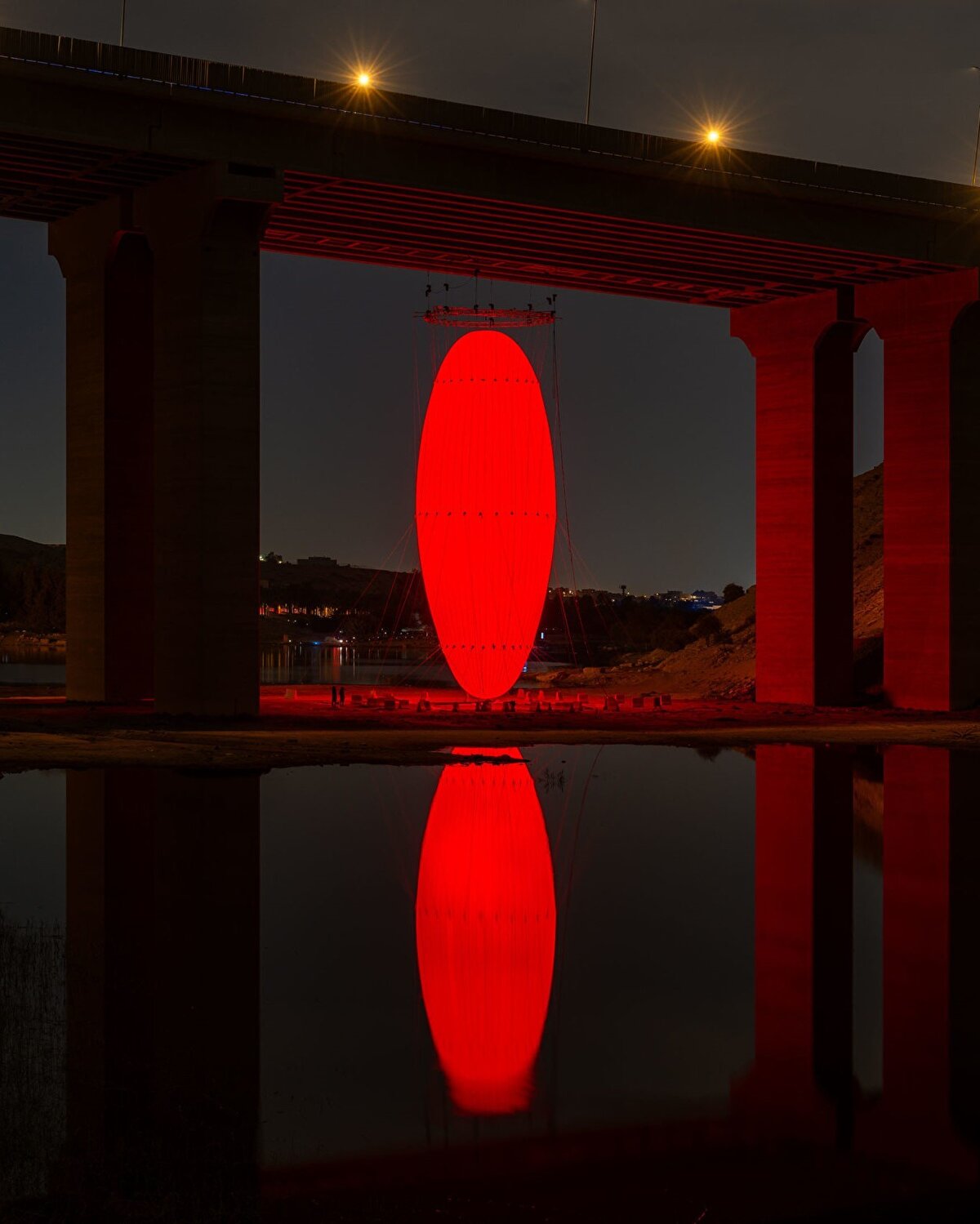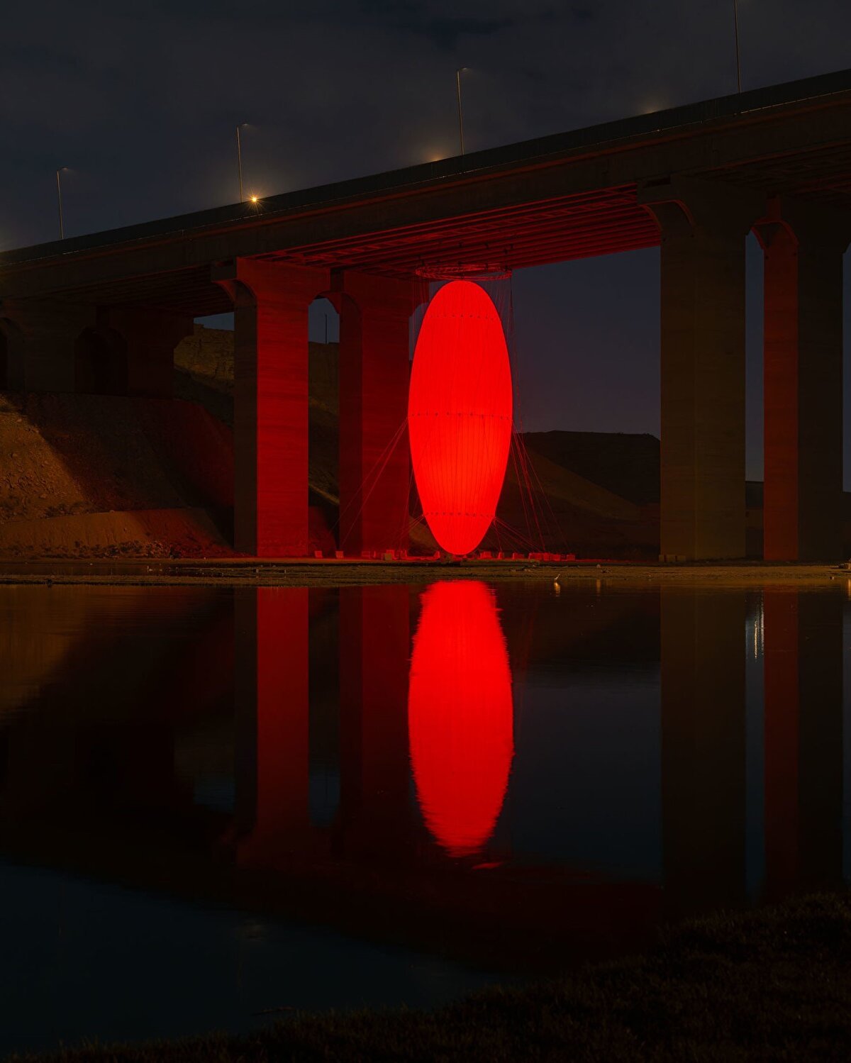 İçeriden yayılan ışık, çevresini sararak ortamı büyüleyici bir kırmızıyla dolduruyor. Aynı zamanda, köprünün altındaki sulara yansıyan oval, görsel ölçeğini iki katına çıkarıyor ve fiziksel varlığı ile yansımasının geçici yanılsaması arasında çarpıcı bir ikilik oluşturuyor.