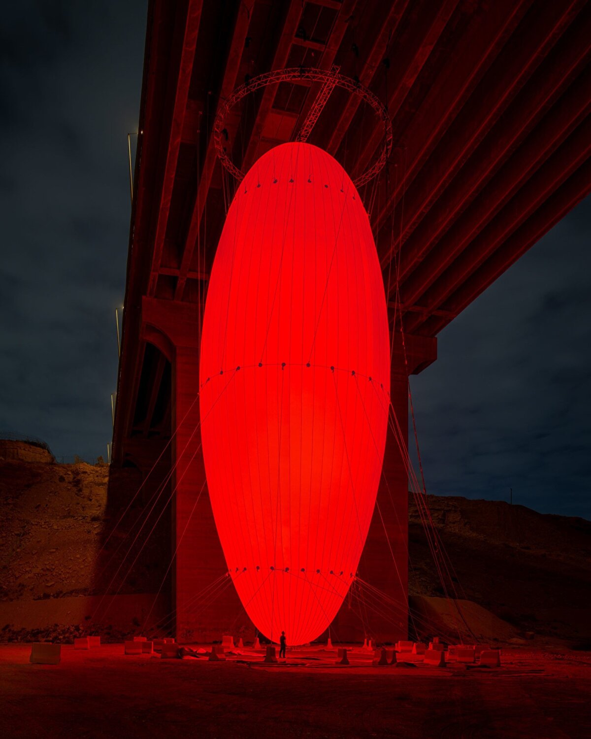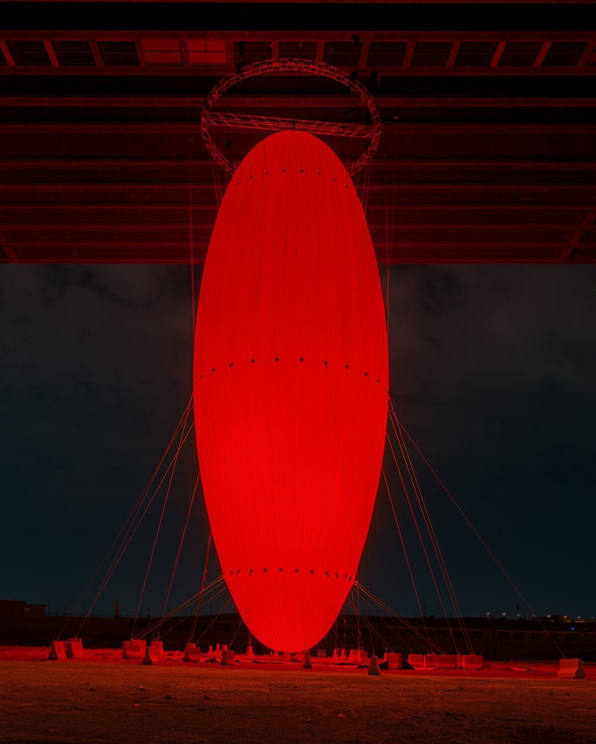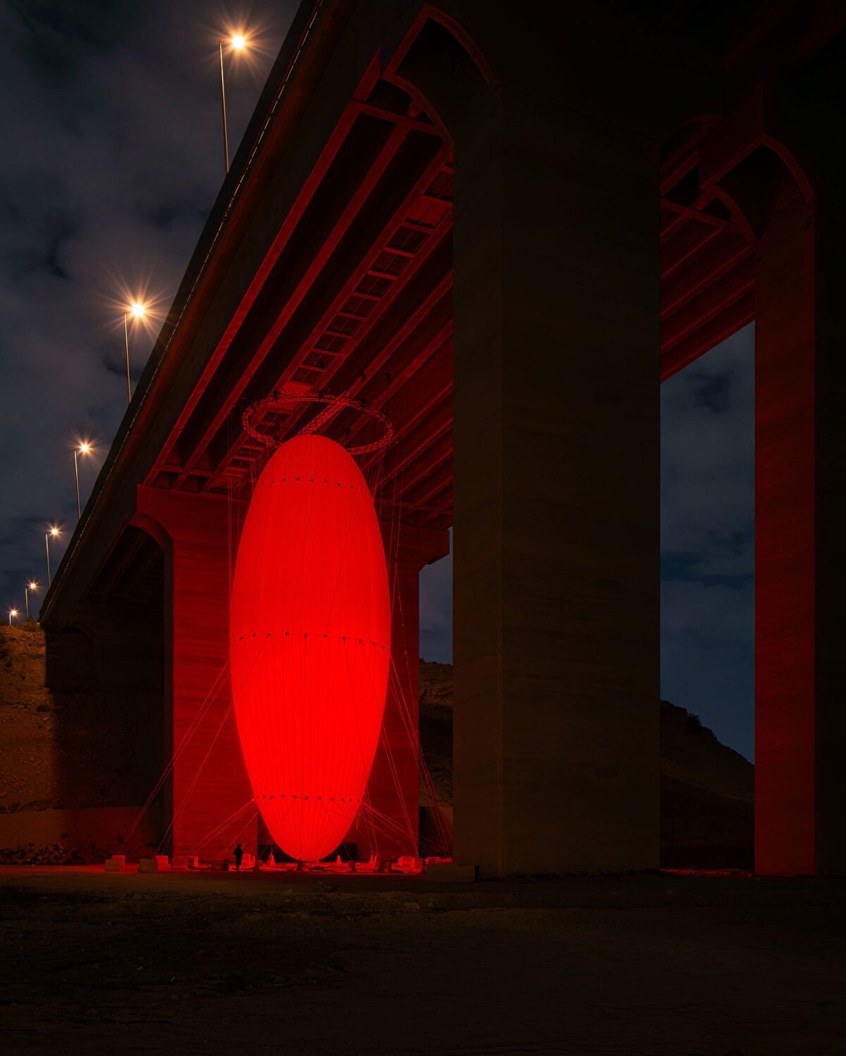 Suudi Arabistan'ın Riyad kentindeki Wadi Hanifah Köprüsü'nün altında, 35 metre yükseklikte asılı duran bu aydınlatılmış kırmızı oval, yalnızca çevresini dönüştürmekle kalmıyor; manzarayı harekete geçirerek ölçek ve somutluk kavramlarını sorgulatan bir alan oluşturuyor.