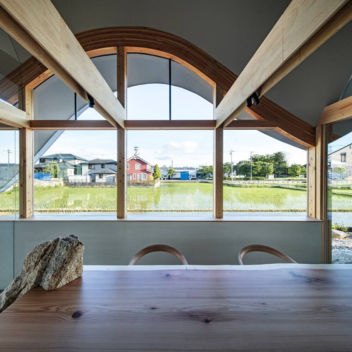 Proje, Japonya Hashima kentinde pirinç tarlalarıyla çevrili kırsal bir alanda konumlanıyor ve tasarım süreci çevredeki gündelik manzaranın mekânsal potansiyelini ortaya çıkarmayı amaçlıyor. Mevsimsel güneş hareketi, rüzgârda salınan bitkiler ve yağmurla oluşan su yüzeyi etkileri tasarımın temel referanslarını oluşturuyor. Doğuya doğru yükselen ve yere yaklaşarak alçalan çatı, hafif dalgalanmasıyla ışık, hava koşulları ve çevresel değişimleri yapının cephesine yansıtıyor. Yüksek giriş hacmi, avlular ve verandalar aracılığıyla iç ve dış mekân arasında geçirgen bir kurgu oluşturuluyor. Güneydeki geniş açıklıklar ve alçak saçaklar, bahçeyle kurulan ilişkiyi düzenleyerek doğal ışık ve rüzgârın kontrollü biçimde içeri girmesini sağlıyor. Yapı, kullanıcıların günlük faaliyetleri sırasında çevredeki mevsimsel değişimleri fark etmelerine olanak tanıyan ara mekânlar sunuyor.