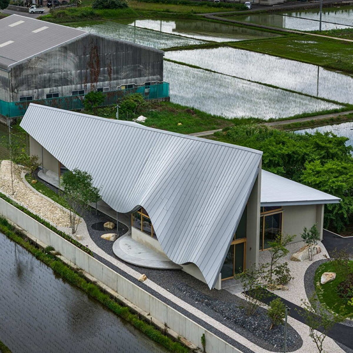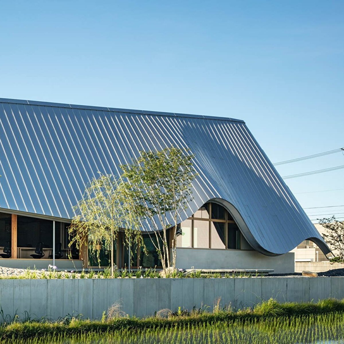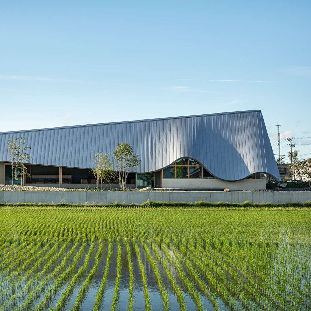 The project is located in a rural area surrounded by rice fields in Hashima, Japan, and the design process aims to reveal the spatial potential of the everyday landscape around the site. The seasonal movement of the sun, the motion of plants swaying in the wind, and the effects created on water surfaces during rain serve as key design references. The roof rises toward the east and descends close to the ground, and its gentle undulation reflects light, weather conditions, and environmental changes onto the building's façade. A permeable relationship between interior and exterior is established through the tall entrance volume, as well as courtyards and verandas placed throughout the structure. On the south side, large openings and low eaves regulate the connection to the garden, allowing natural light and wind to enter in a controlled manner. The building provides intermediate spaces that enable users to perceive the seasonal changes in the surrounding landscape during their daily activities.