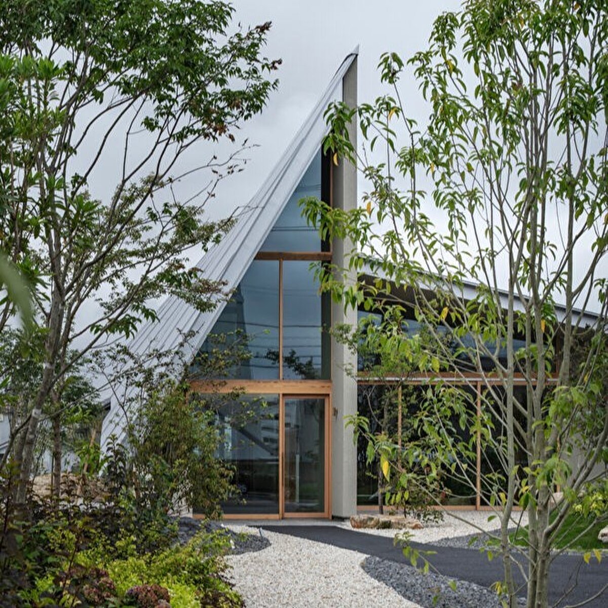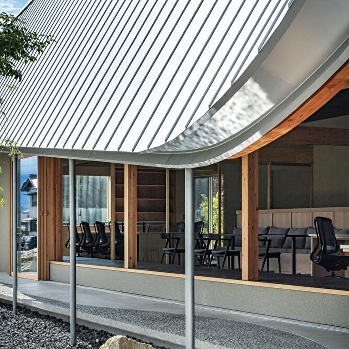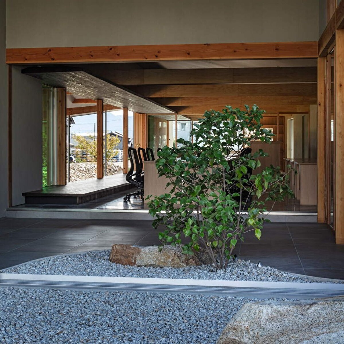 The project is located in a rural area surrounded by rice fields in Hashima, Japan, and the design process aims to reveal the spatial potential of the everyday landscape around the site. The seasonal movement of the sun, the motion of plants swaying in the wind, and the effects created on water surfaces during rain serve as key design references. The roof rises toward the east and descends close to the ground, and its gentle undulation reflects light, weather conditions, and environmental changes onto the building's façade. A permeable relationship between interior and exterior is established through the tall entrance volume, as well as courtyards and verandas placed throughout the structure. On the south side, large openings and low eaves regulate the connection to the garden, allowing natural light and wind to enter in a controlled manner. The building provides intermediate spaces that enable users to perceive the seasonal changes in the surrounding landscape during their daily activities.