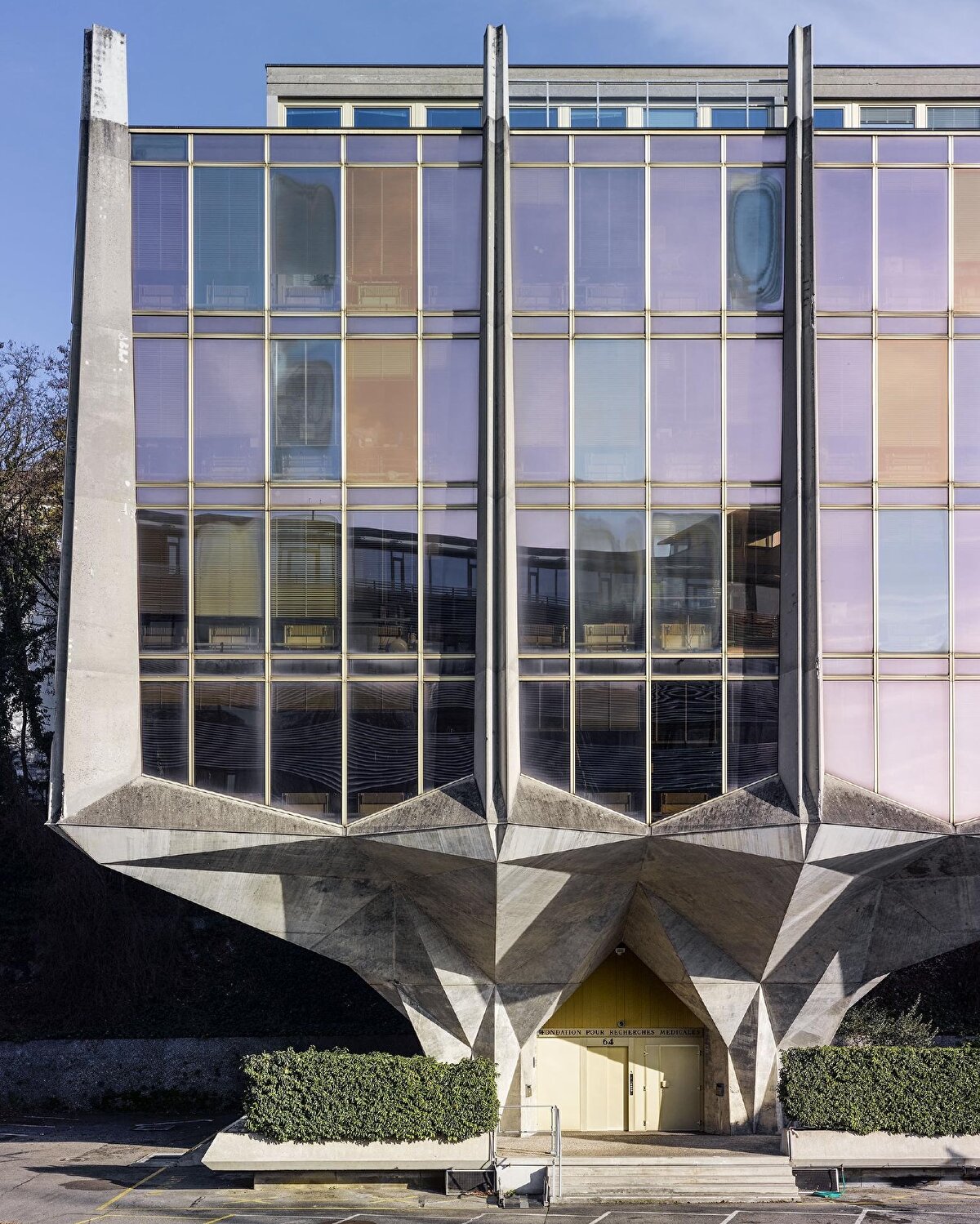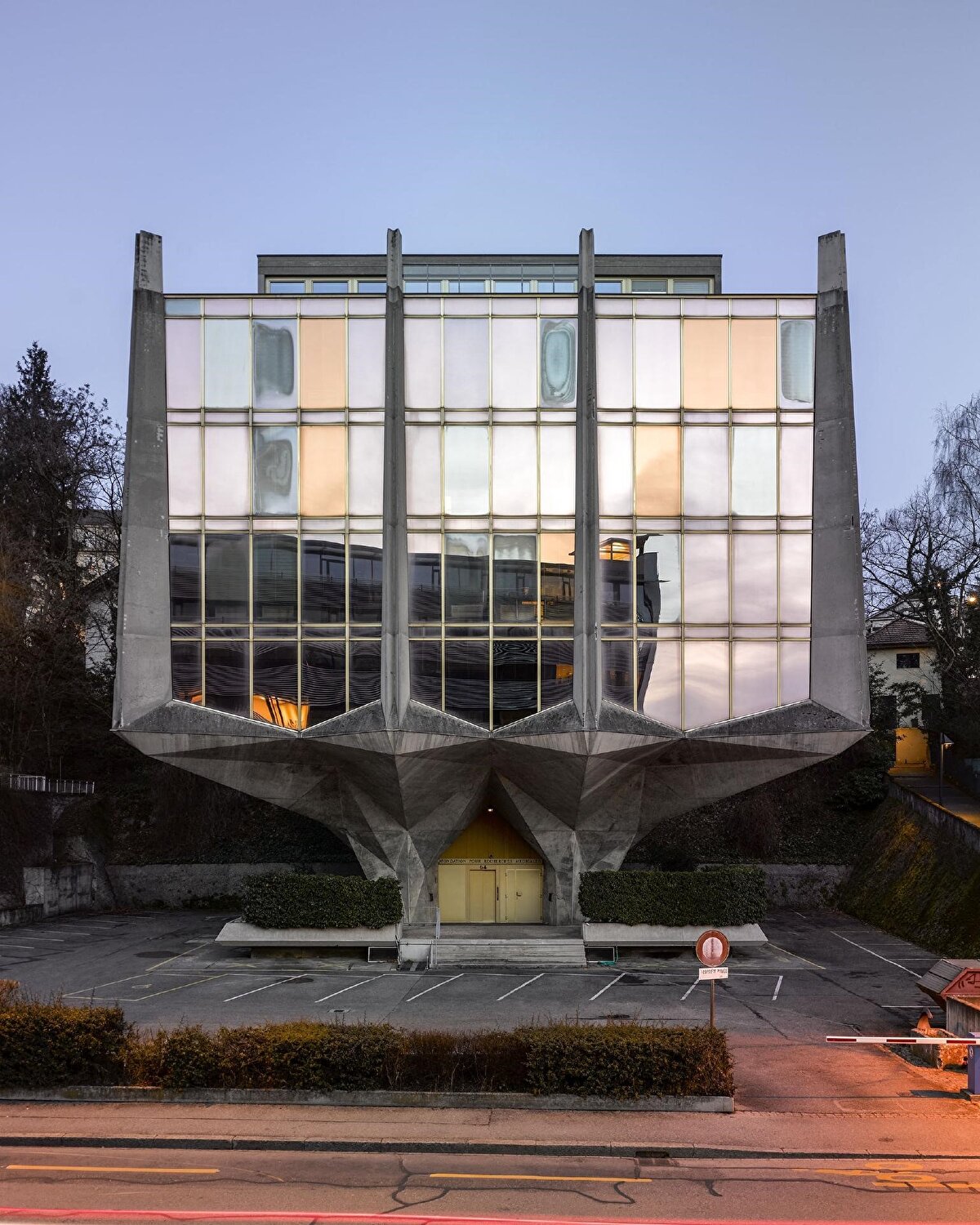Home to the Swiss Foundation for Medical Research, this building stands out with its combination of hard concrete and colored glass. Named “La Tulipe", this building is created with Bertoli's organic forms and nature-inspired aesthetics. The building has elegant and fluid lines that resemble the form of a tulip. This design approach allows the building to harmonize with its surroundings and integrate with nature.