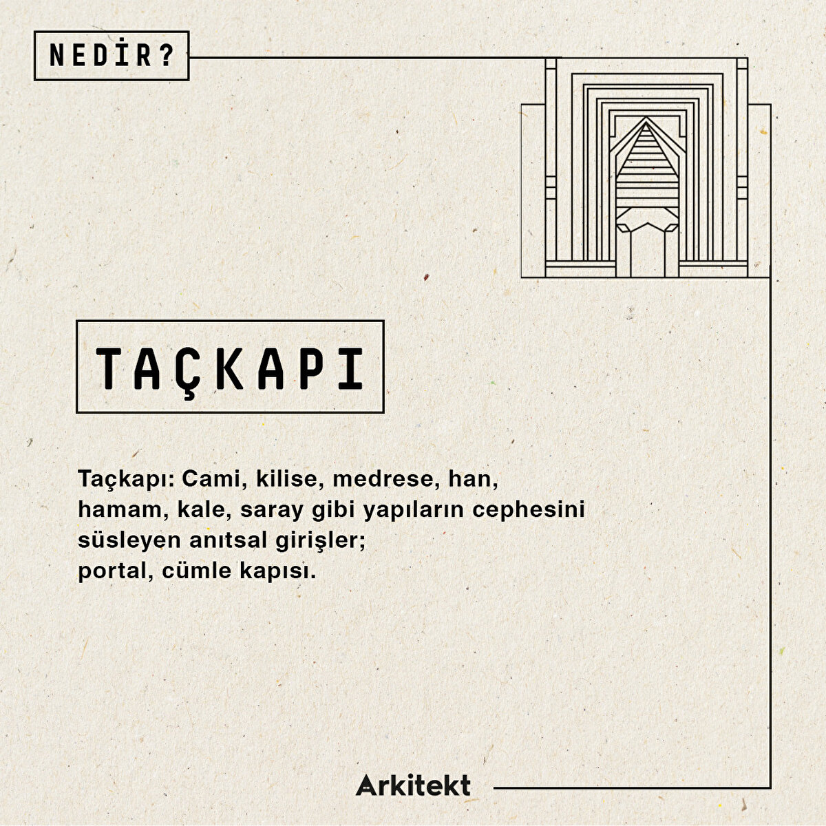 Mimarlık sözlüğünde bugün “taçkapı" var. Taçkapının sözlük anlamı ile beraber, uygulanmış örneklerini inceliyoruz.
