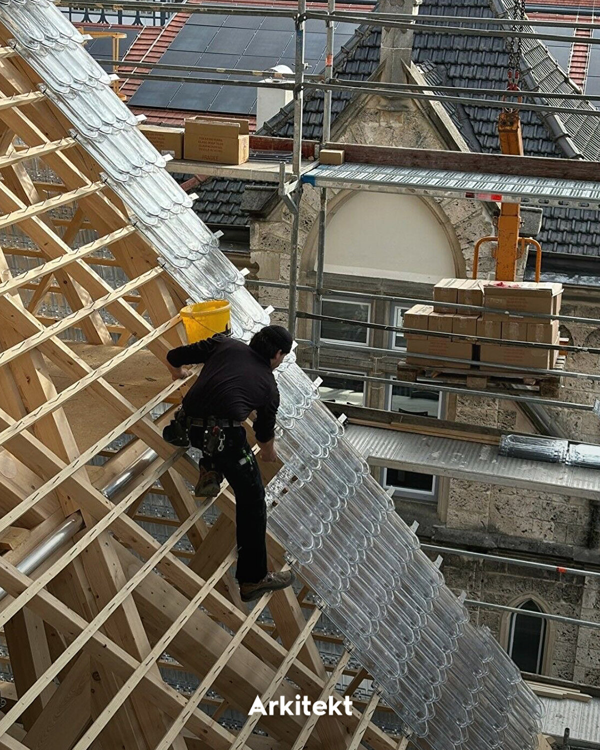 1972'de yıkılan Kule Ev'in (Oberamteistraße 34) ardından oluşan yapısal dengesizlik, yeni yapı önerisi ile gideriliyor. Yapı, bitişik ahşap karkas evleri statik olarak destekliyor. Yaklaşık 225 m²'lik alanda yükselen yeni strüktür, koruma altındaki orta çağ mahzeninin sınırları içinde glulam kirişler (yapıştırılmış lamine ahşap kiriş) ve CLT panellerle inşa ediliyor. Yarı saydam cam kiremitlerle kaplanan cephe, yerel Kara Orman göknarından üretilmiş ahşap taşıyıcı sistemi dışarıdan yalnızca bir siluet olarak gösteriyor. Hiperbolik paraboloid çatı geometrisi, alanın trapez planından türetilerek hesaplamalı araçlarla şekilleniyor. Müze, 2025'te yapısal birimlerin, 2028'de ise tüm tarihî yapı grubunun tamamlanmasıyla kentsel mirasın yeniden bütünleşmesini hedefliyor.