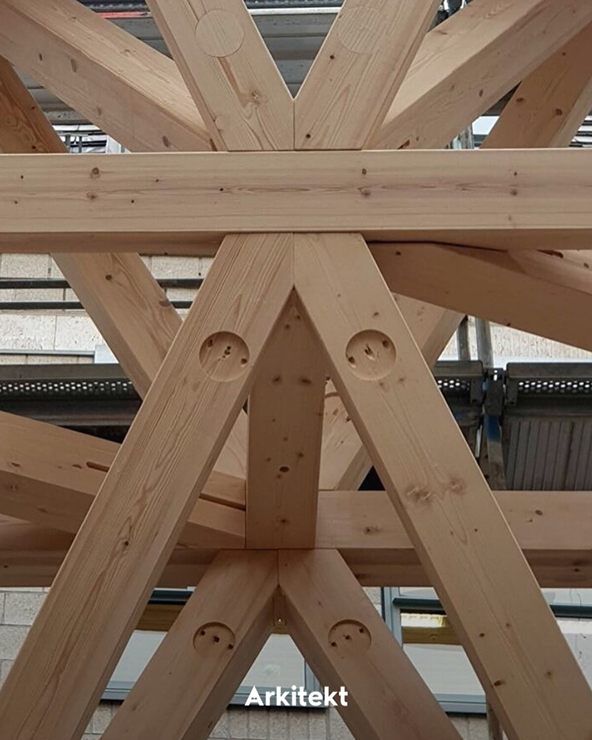 The structural imbalance created after the demolition of the Tower House (Oberamteistraße 34) in 1972 is addressed with the new building proposal. The structure provides static support to the adjacent timber-framed houses. Rising over an area of approximately 225 m², the new structure is built within the boundaries of the protected medieval cellar using glued laminated timber (glulam) beams and CLT panels. Clad with semi-transparent glass shingles, the façade allows the timber load-bearing system, made from locally sourced Black Forest fir trees, to be visible only as a silhouette from the outside. The hyperbolic paraboloid roof geometry is derived from the trapezoidal plan of the site and shaped using computational tools. The museum aims for the structural units to be completed by 2025, with the full renovation of the historic building ensemble finalized by 2028, facilitating the reintegration of the urban heritage.