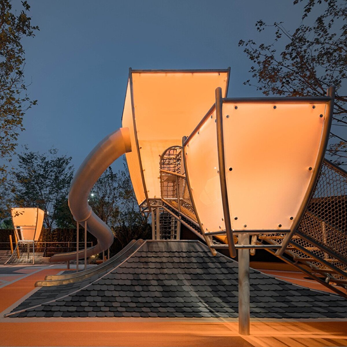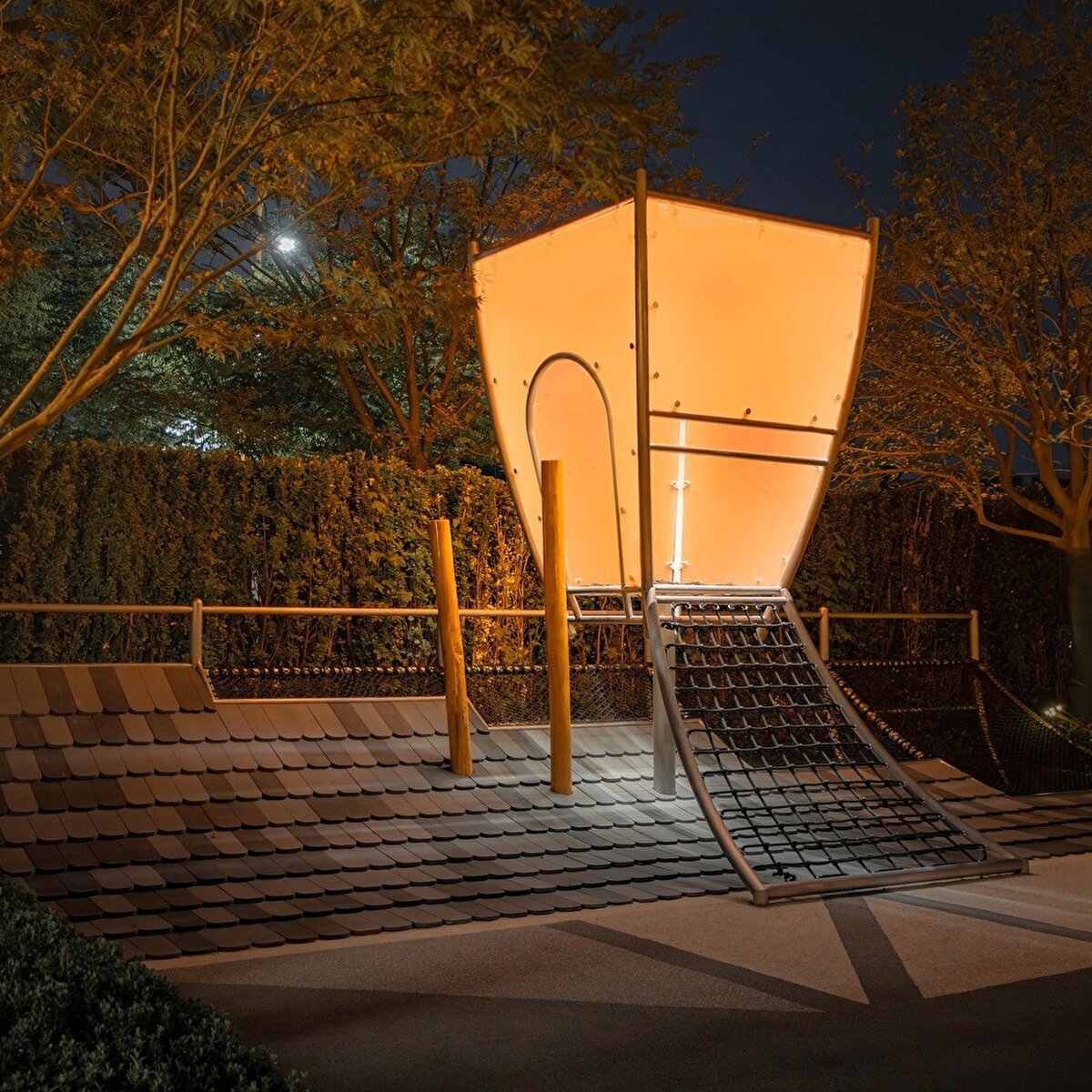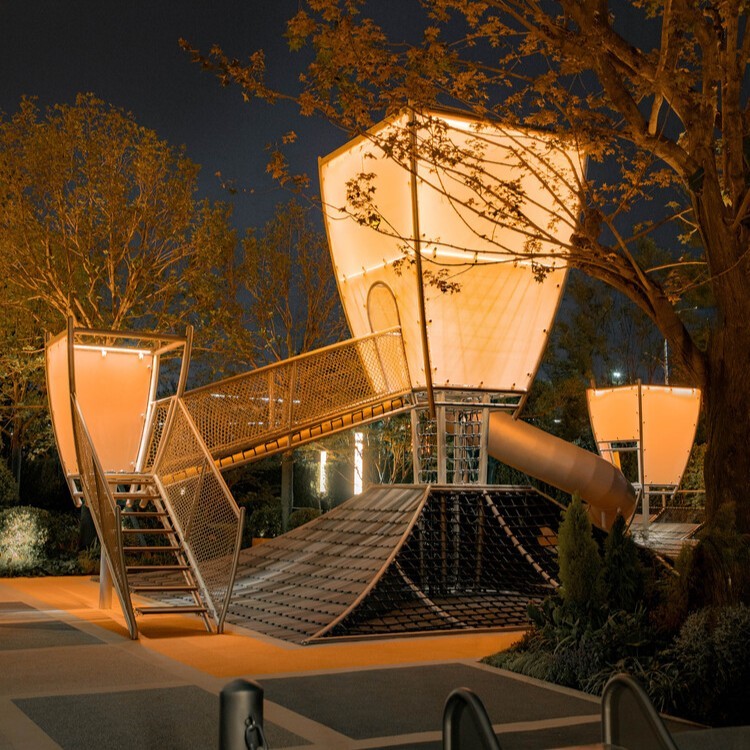 The 530 m² children's play area at Nanyang Huilong is designed with inspiration from local cultural elements. The design uses Zhuge Liang's Straw House, Kongming lantern, and a folk saying describing children's curious and mischievous play behavior as key references. The linear architectural language of neo-Chinese courtyards is transferred to the area's different functional sections, and the Kongming lantern theme is integrated into the playground with sloping tiled roof elements. The main installation connects to slides and balance beams from a two-story platform. The children's area varies according to different age groups, featuring a light-and-shadow tunnel, vertical climbing poles, and sloped roof platforms. The area designed for younger children is planned with safety and aesthetics as priorities and provides an open view suitable for parents to interact with their children. All facilities are made safe by rounding the edges and create a visual environment consistent with the Kongming lantern theme through night lighting.