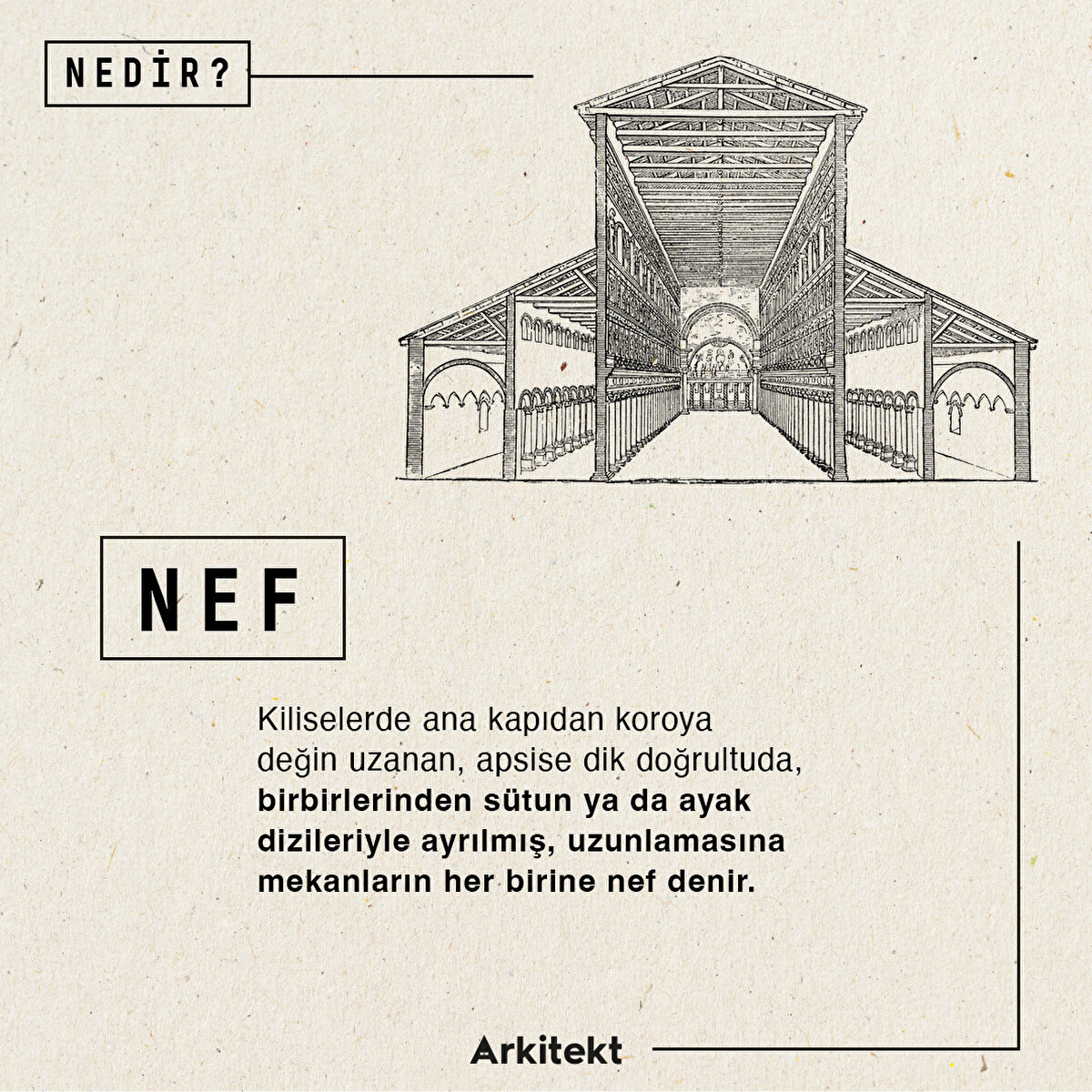 Mimarlık sözlüğünde bugün “nef" var. Nefin sözlük anlamı ile beraber, uygulanmış örneklerini inceliyoruz.
