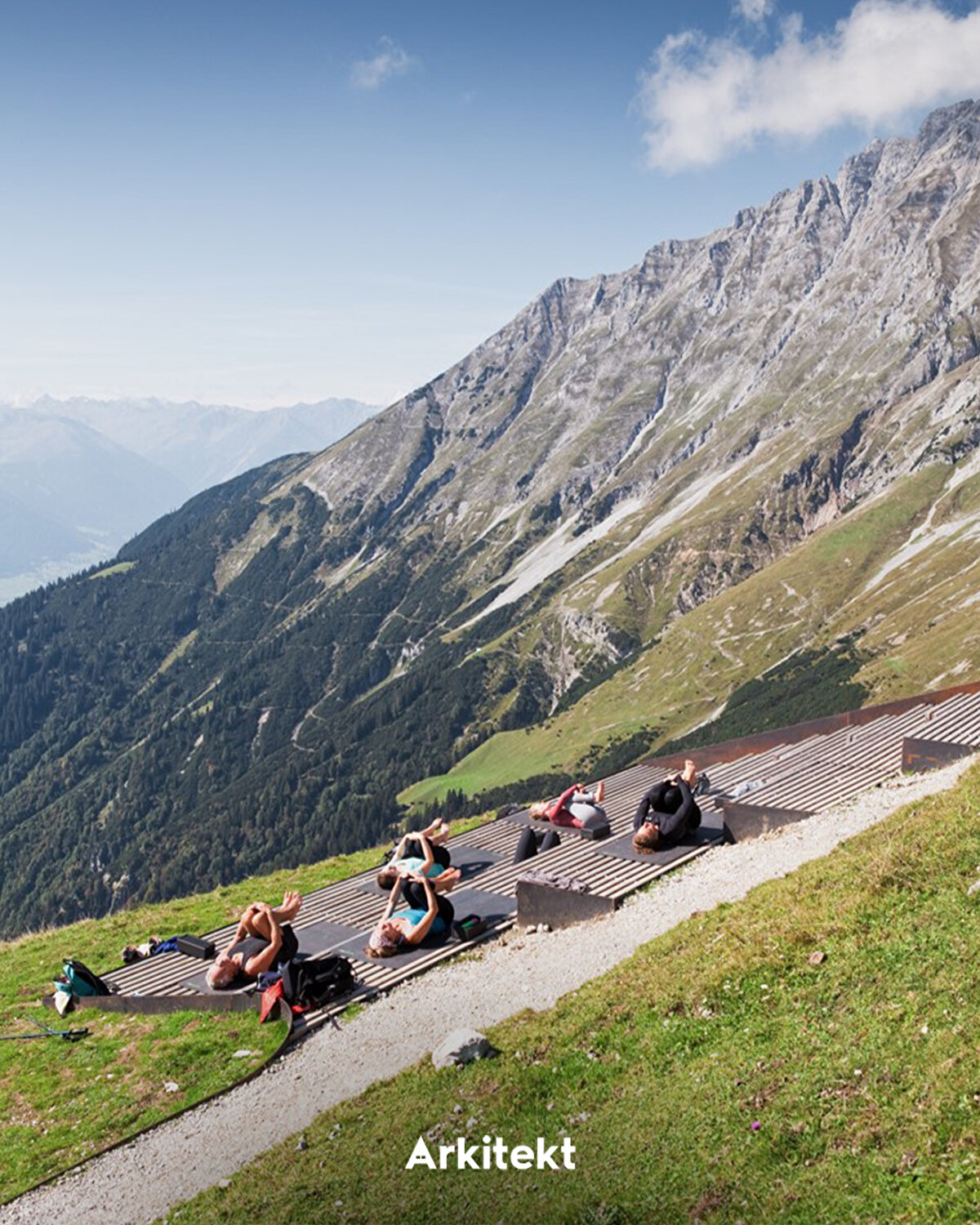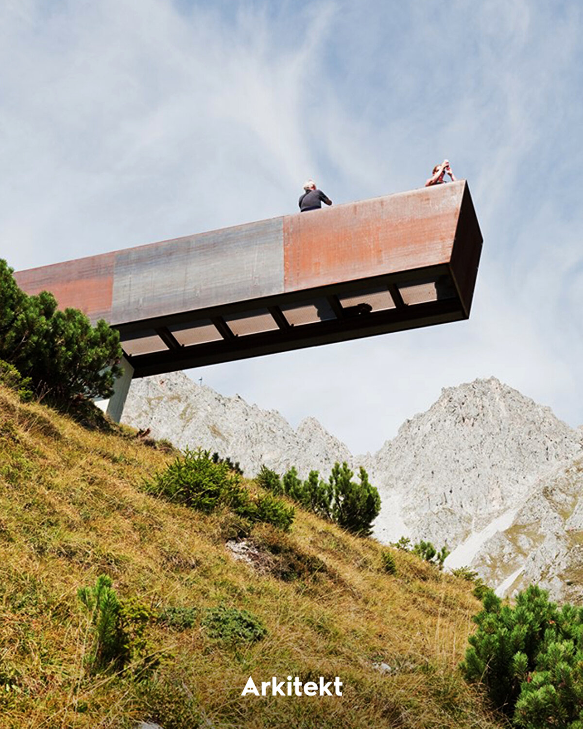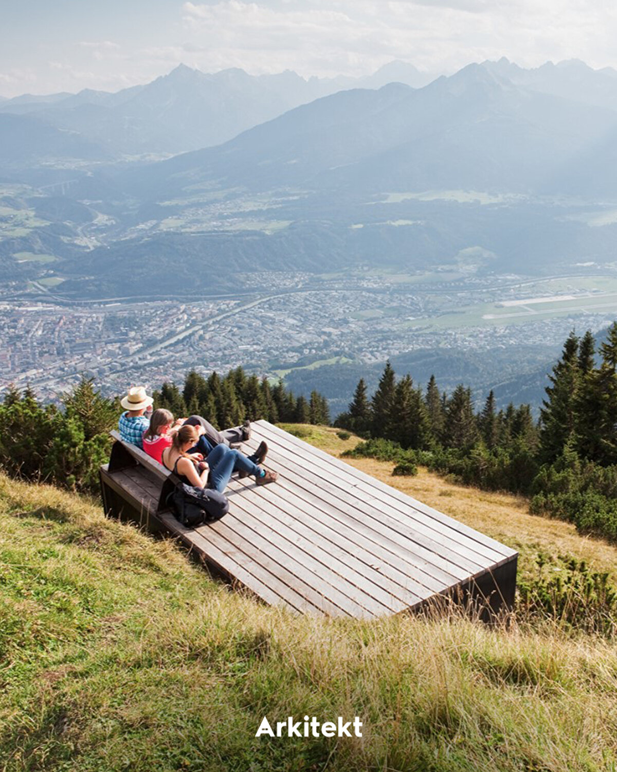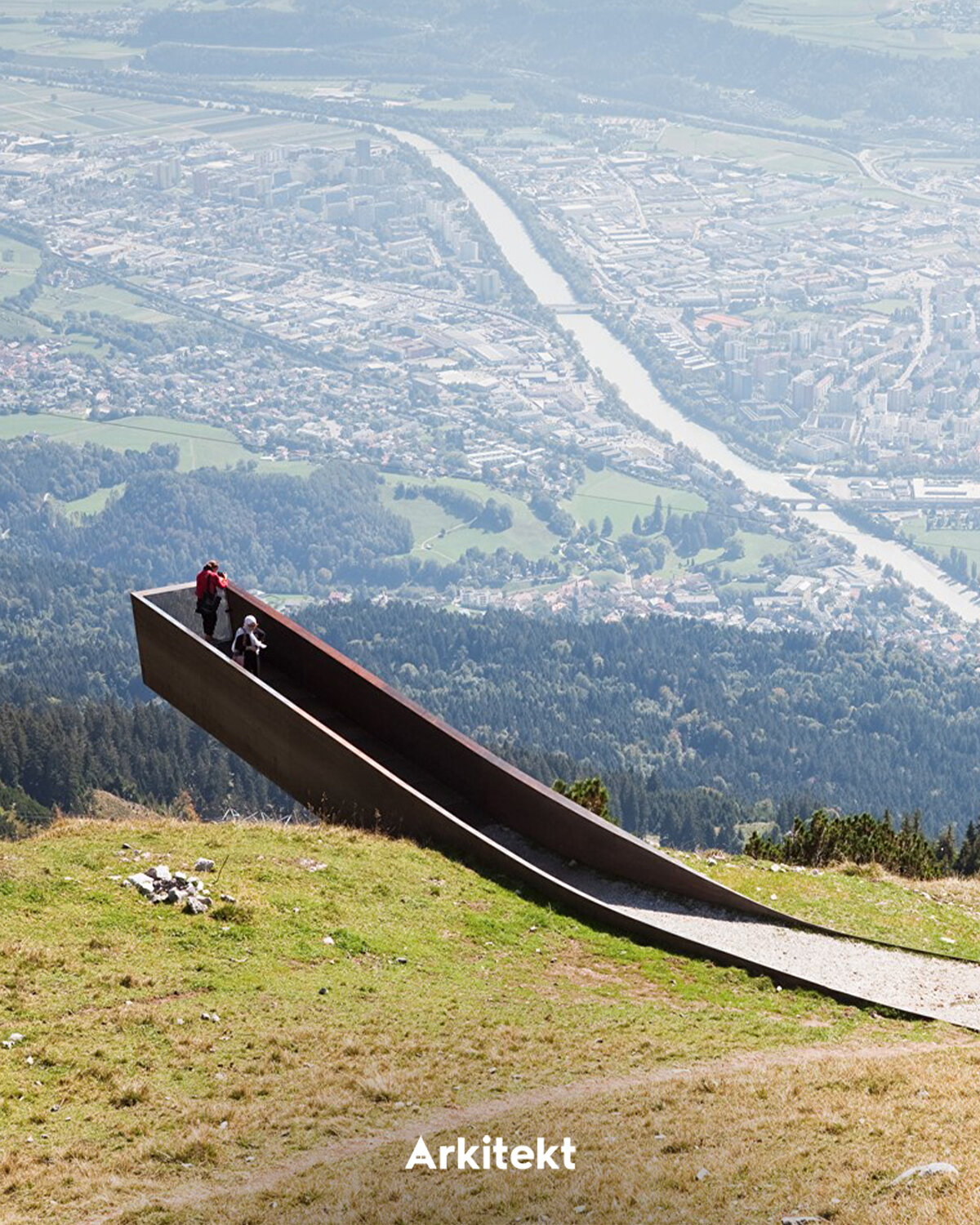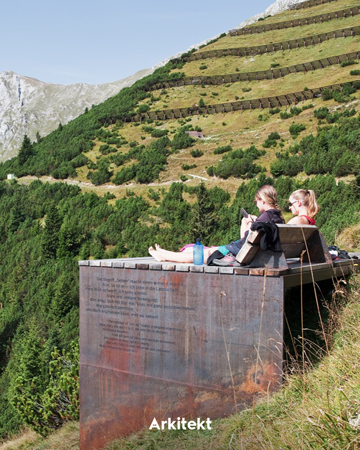 “Path of Perspectives" (Bakış Açıları Yolu), Alpler boyunca uzanan yürüyüş rotasında Nordkette dağlarının öne çıkan özelliklerini vurguluyor. Perspektivenweg rotası, 2,8 kilometre uzunluğu ve 142 metrelik bir yükselti farkıyla Seegrube istasyonundan başlayarak on mimari öğe boyunca ilerliyor. Corten çeliği ve karaçam ağacından üretilen bu öğeler, bazen oturma alanı bazen de seyir noktası işlevi görüyor. Seyir terası, topoğrafyadan uzanarak ziyaretçilere Inn Vadisi'ne doğru bakış imkânı sunuyor. Ahşap basamaklarla oluşturulan platformlar, dinlenme alanı ya da amfitiyatro olarak kullanılıyor. - “Path of Perspectives" unfolds along a hiking trail in the Alps, highlighting the distinctive features of the Nordkette mountains. The Perspektivenweg trail begins at the Seegrube station and extends over 2.8 kilometers with an elevation difference of 142 meters, marked by ten architectural elements. Made of Corten steel and larch wood, these elements function alternately as seating areas or viewing points. The viewing platform projects from the terrain, offering visitors views of the Inn Valley. Wooden steps shape platforms that serve as resting areas or as an amphitheater.