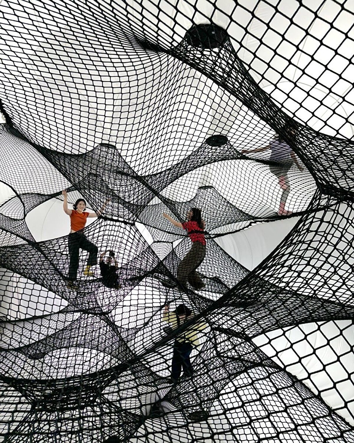 Designed by Numen/For Use for the CMP Inspiration Museum, the Net Taichung and String Taichung installations were conceived specifically for the space, in harmony with Kengo Kuma's architectural language. Both structures rely solely on rope and net systems that gain their load-bearing capacity through tension, thereby establishing their own spatial integrity without the need for additional support structures.