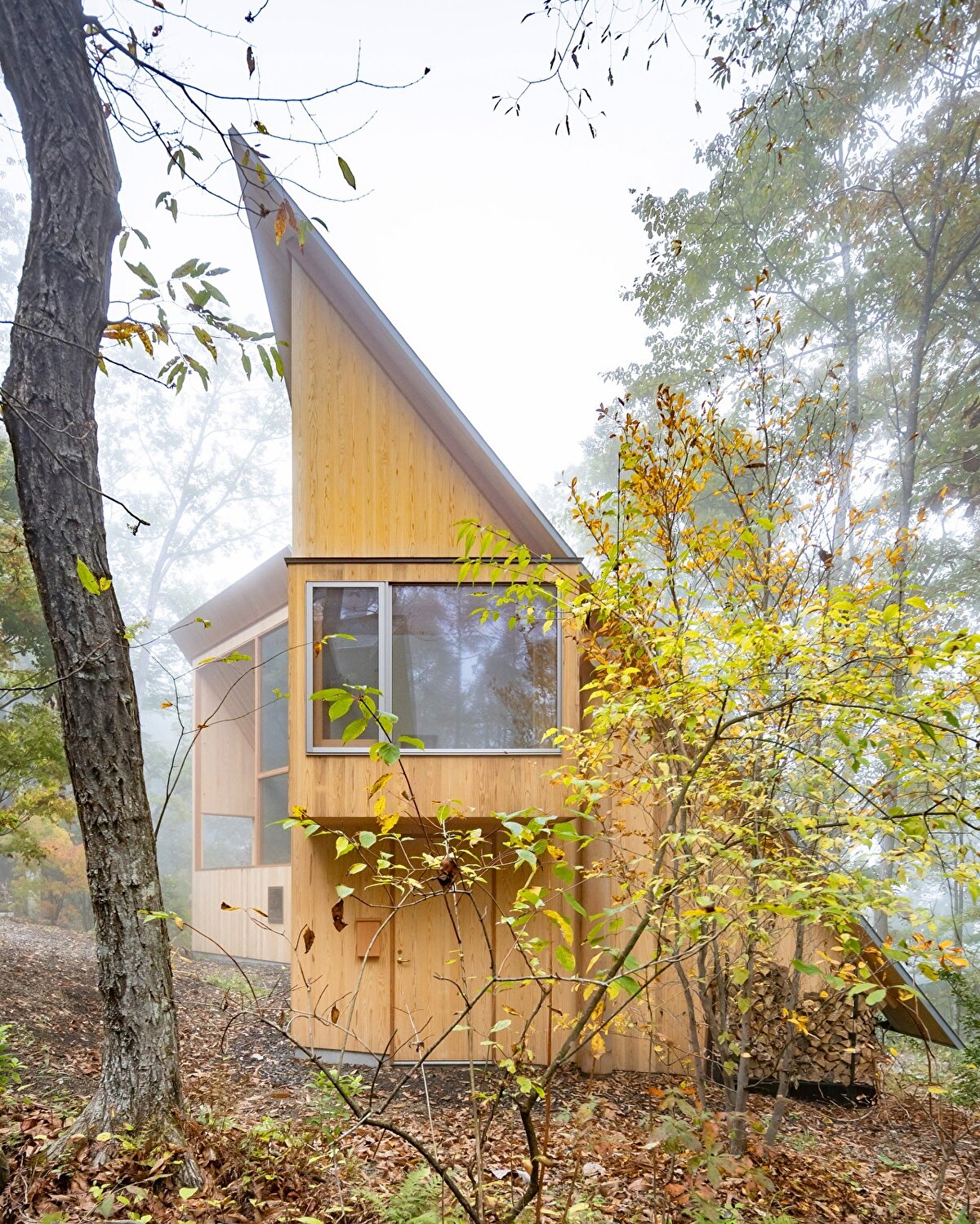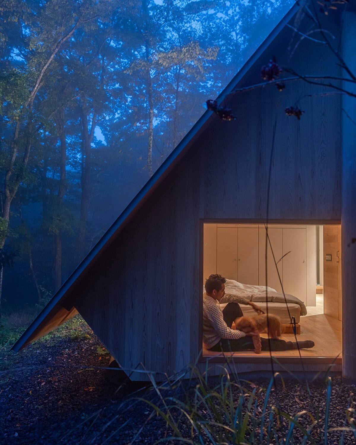 Located at the foot of the Okayama mountains, this country house was designed by Rei Mitsui, former partner of Shigeru Ban, for Rob and Junko. The approximately 100-square-meter structure consists of two multi-story wings connected by a living area. Despite contrasting with the surrounding natural landscape with its large glass surfaces and sharp geometry, the structure becomes part of the forest landscape.