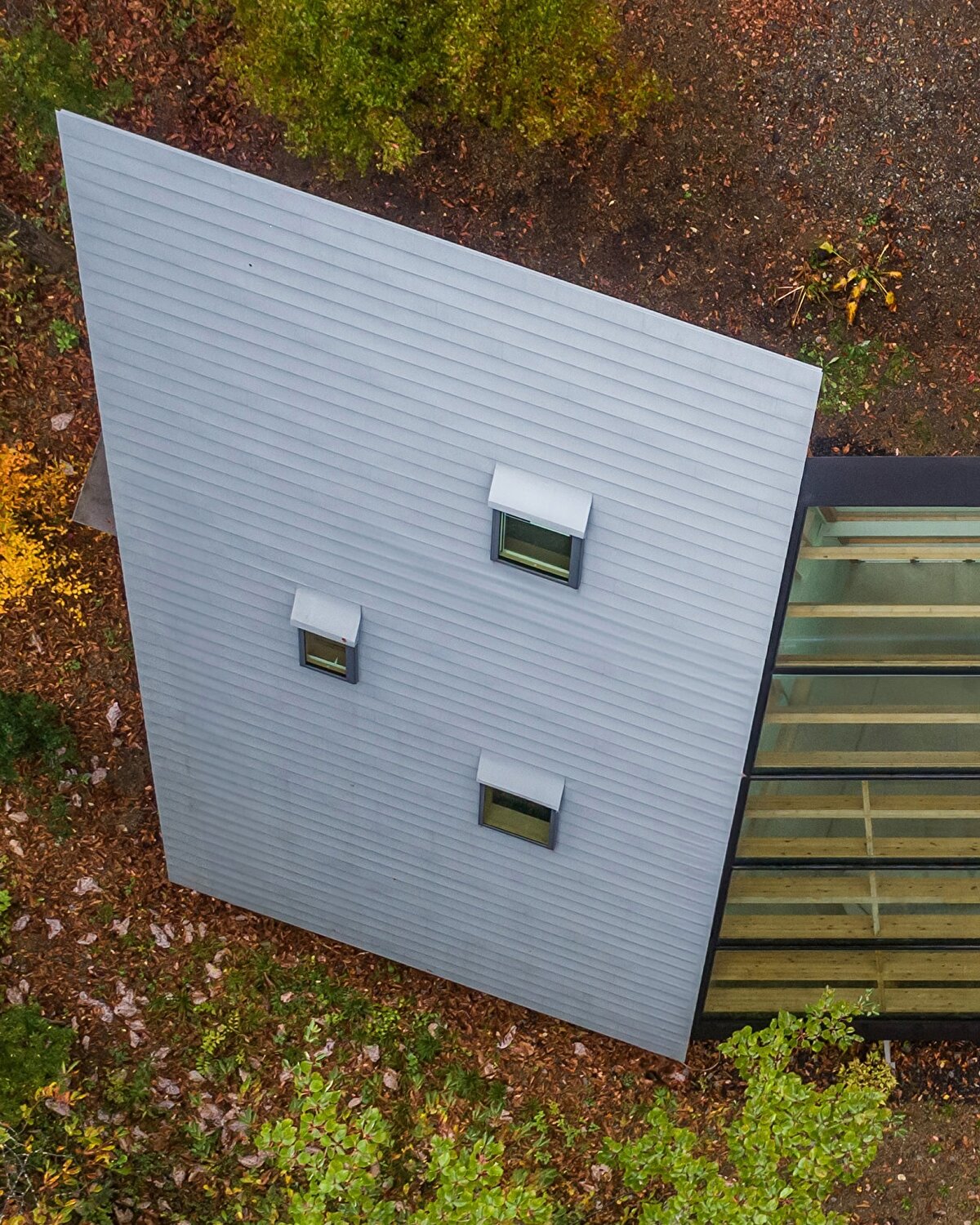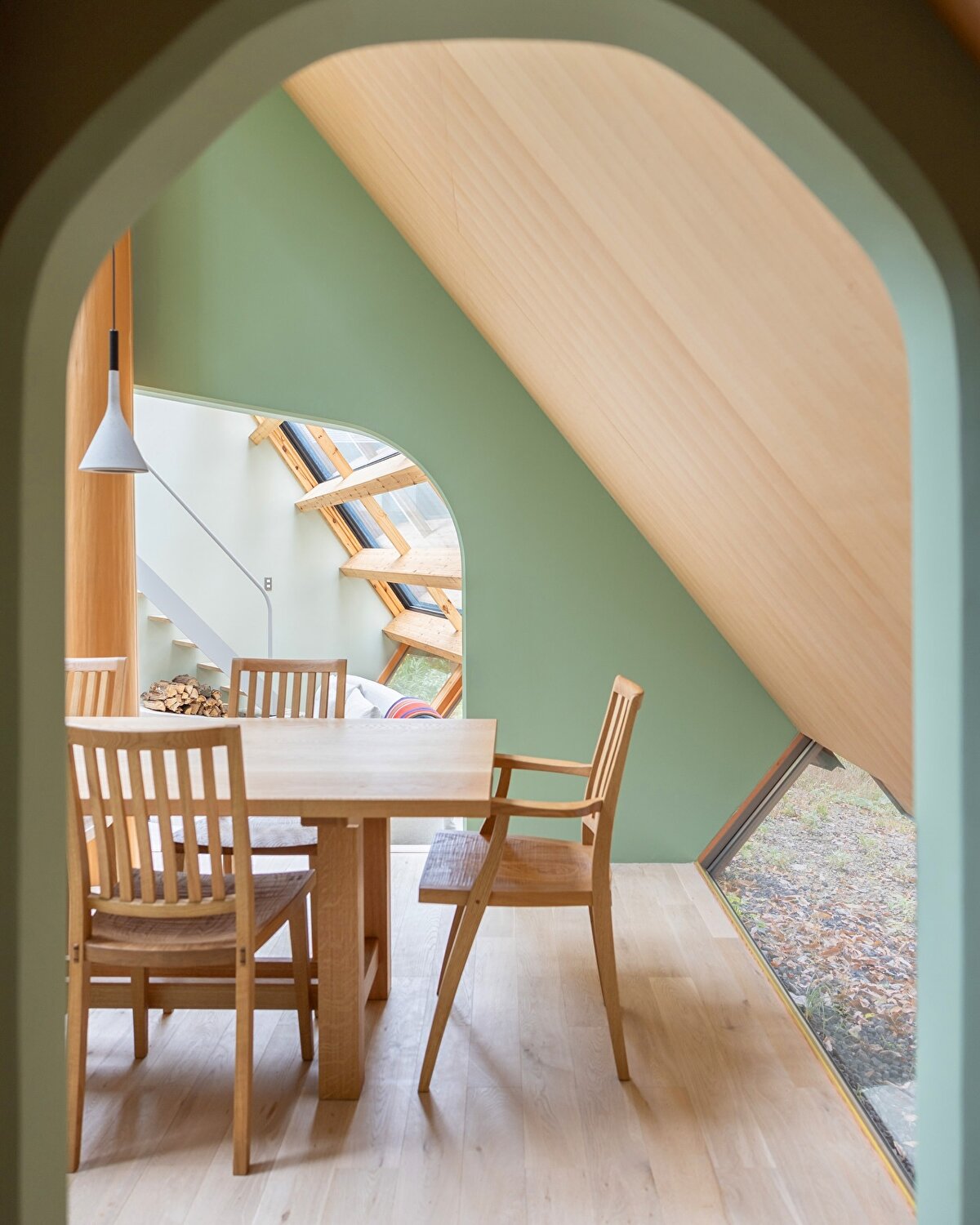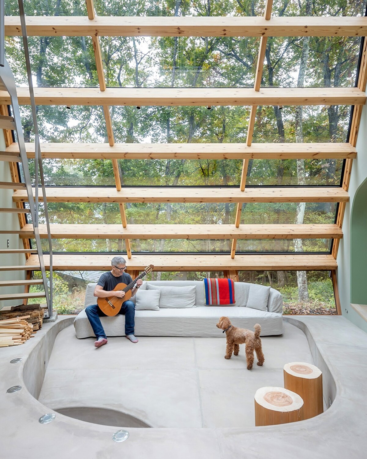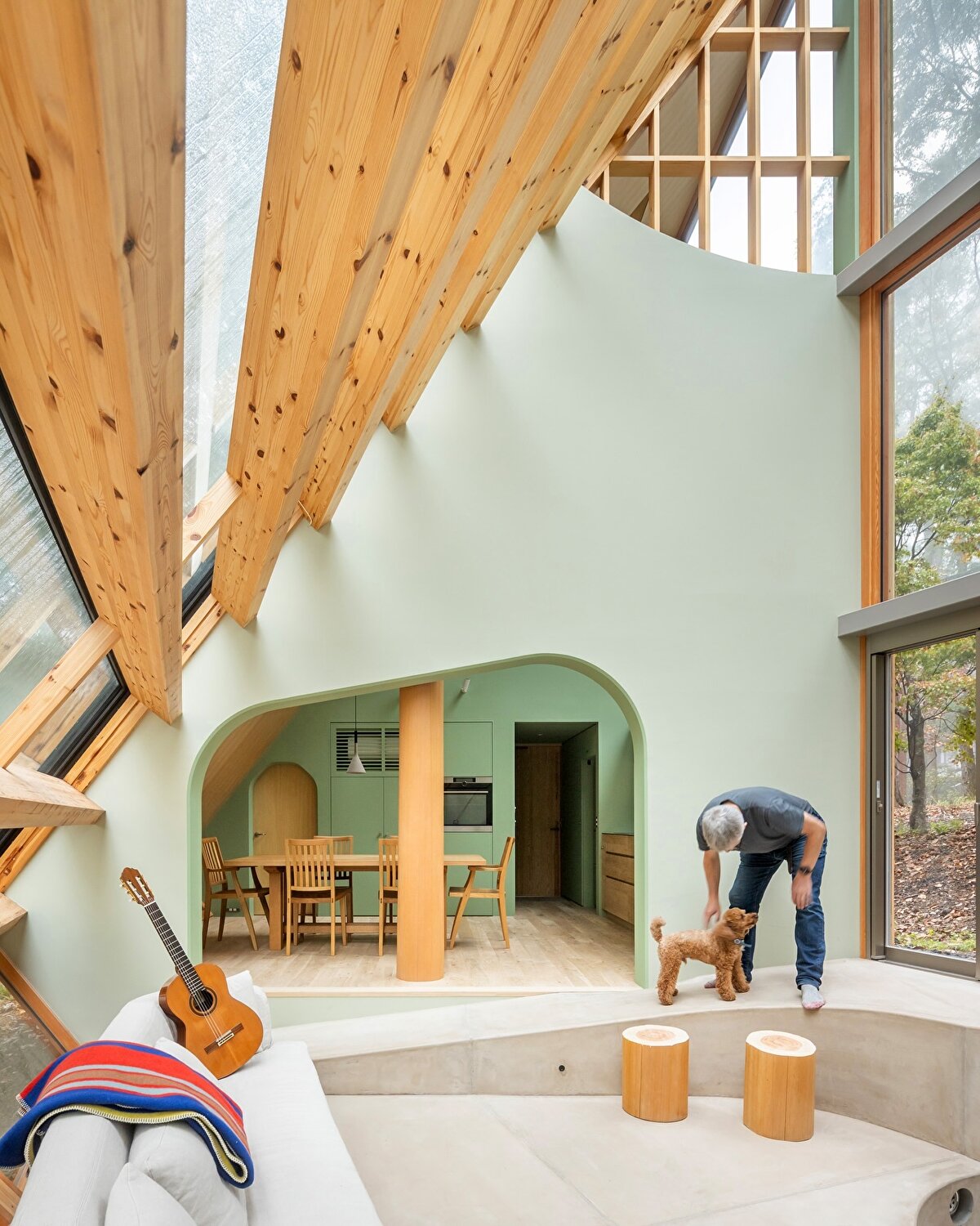 Okayama dağlarının eteklerinde konumlanan bu kır konutu, Shigeru Ban'ın eski ortağı Rei Mitsui tarafından Rob ve Junko çifti için tasarlanıyor. Yaklaşık 100 metrekarelik yapı, yaşam alanı aracılığıyla birbirine bağlanan iki çok katlı kanattan oluşuyor. Geniş cam yüzeyleri ve keskin geometrisiyle çevresindeki doğal dokuya zıt bir duruş sergilese de yapı, orman peyzajının bir parçası haline geliyor.