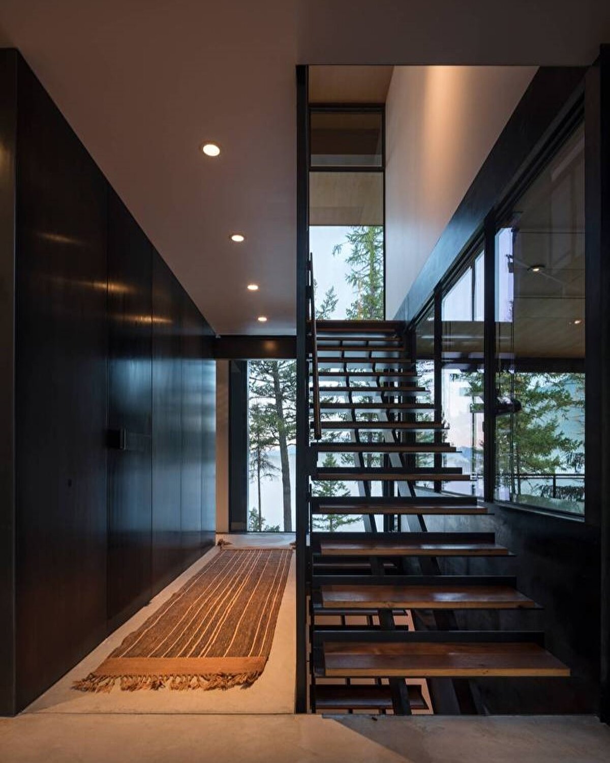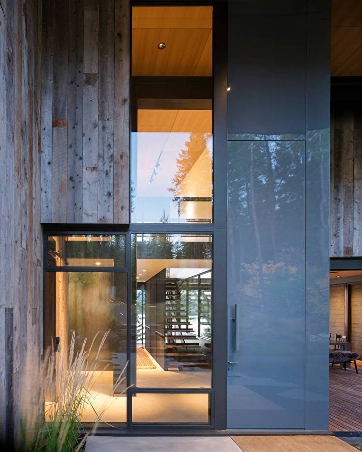 Evin dış kaplaması geri dönüştürülmüş ahır kerestesinden oluşuyor. Bu keresteler zamanla griye dönerek çevreyle uyum sağlıyor, yapının doğadaki varlığını daha belirsiz hale getiriyor. İç alanlarda ise geniş pencere duvarları kullanılıyor. Bu sayede iç mekânlar hem göl manzarasını hem de ormanı görmeye olanak veriyor. Pencere duvarlar açıldığında cam yüzeyleriyle doğrudan dış mekânla bağ kurulabiliyor ve ev neredeyse “orman zemininden yükselmiş bir platform" gibi hissediliyor.