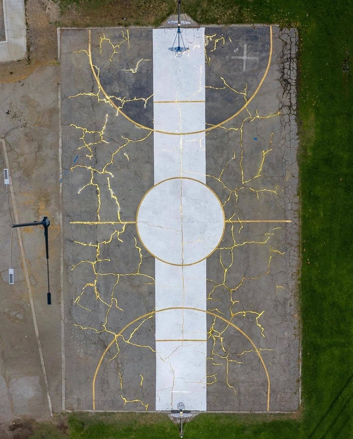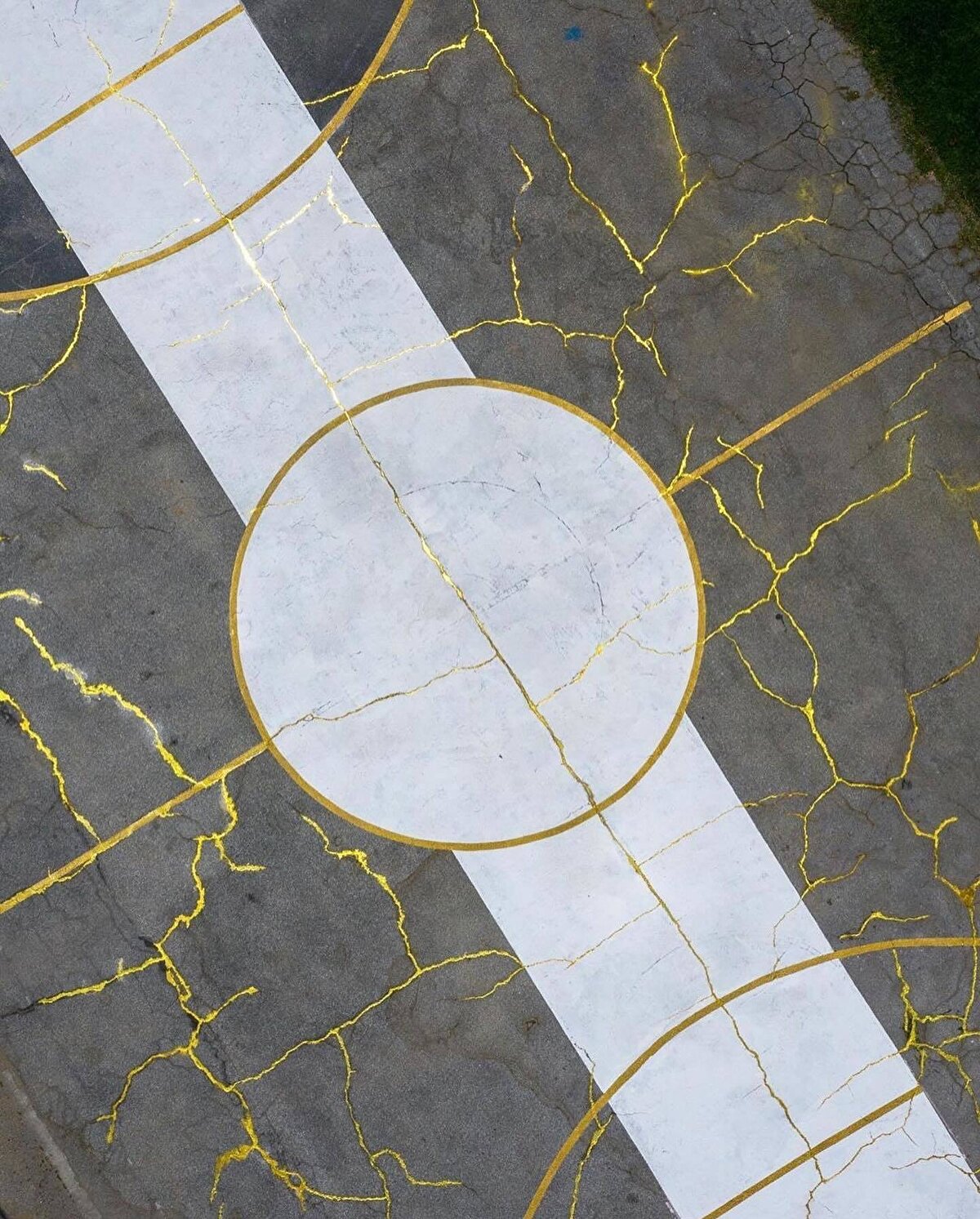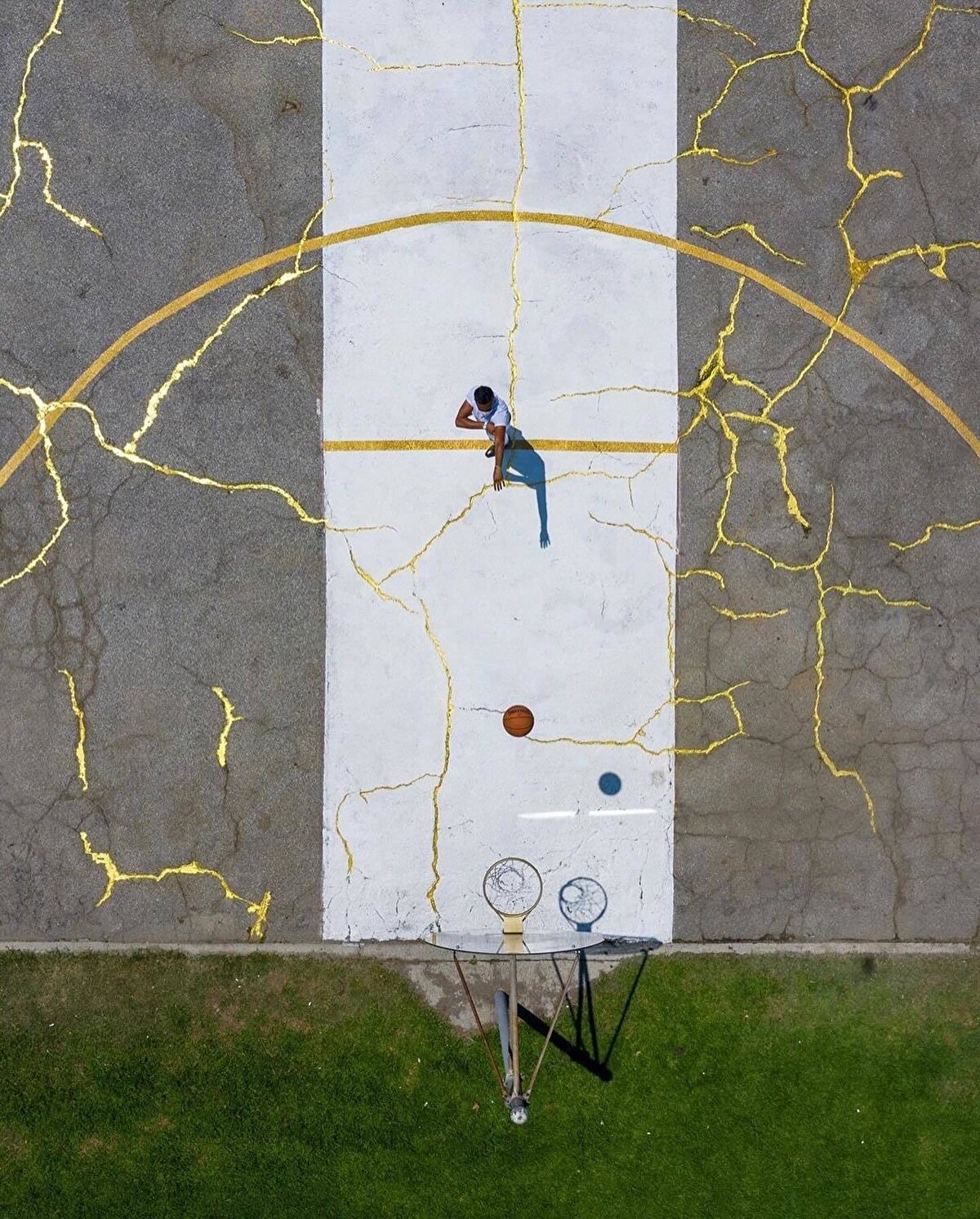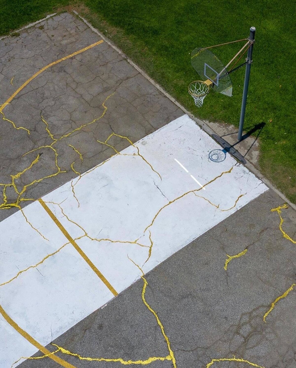 @victorsolomon, Kintsugu Sahası'nda Japon el sanatlarını ve basketbolu bir araya getiriyor. Japon Kintsugi pratiğinde kullanılan kırık çömlek parçaları gibi, Güney Los Angeles'taki bu sahanın çatlak zemini, Solomon'un sanatsal gözüyle tekrar birleştirildi.