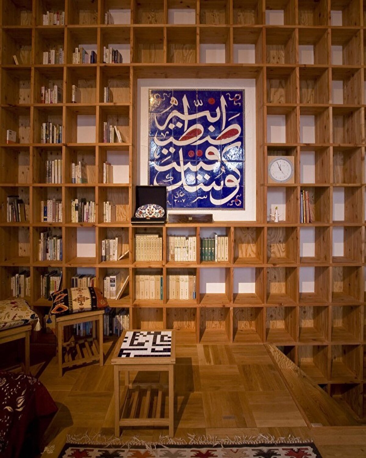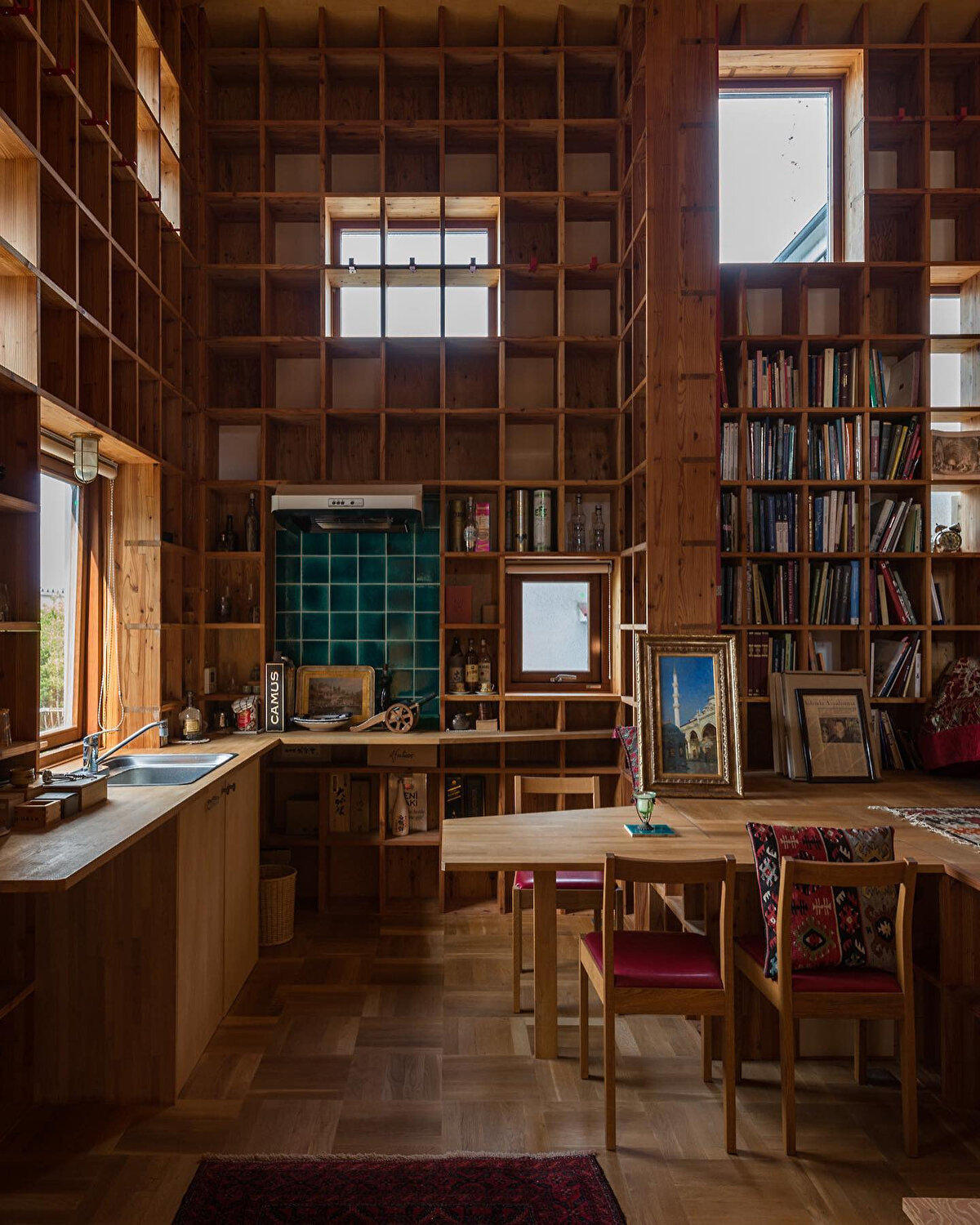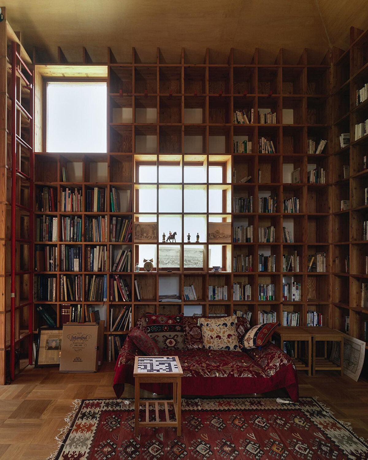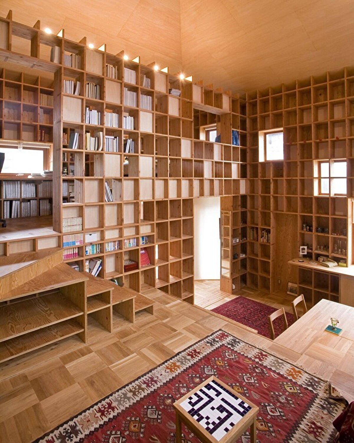 Shelf-Pod, Japonya'nın Osaka ilinde bulunan özel bir çalışma evi olarak öne çıkıyor. Müşteri, İslam tarihi konusunda geniş bir kitap koleksiyonuna sahip olduğundan, depolama ve sergileme için maksimum kapasiteye sahip bir yapı istiyor. Tasarlanan yapı, 25 mm kalınlığında lamine çam ağacından yapılan kitap raflarıyla donatılıyor. Her raf, 360mm yükseklik, 300mm genişlik ve 300mm derinlik ölçülerinde yapılıyor. Mimari unsurlar, bu raf ölçeği esas alınarak İslam Mimarisi ile uyumlu bir şekilde tasarlanıyor. Bu yapısal sistem, büyük miktarda kitap depolama imkanı sunmanın yanı sıra esnek zemin seviyelerine olanak tanıyor. Yapının görüntüsü, Japon ahşap işçiliği Kumiko'dan esinlenerek tasarlanıyor. Depreme karşı dayanıklılık için kontrplak levhalar kullanılıyor. Prefabrik ahşap çatı panelinden oluşturulan piramit şeklindeki çatı, caminin kubbesini andıran bir görünüm sunuyor. Dış duvarlarda geleneksel Japon deposu Dozou'nun inşaat teknikleri kullanılıyor. Bambu ağ duvarı, kafes yapıya tutturulmuş ve kil ve saman karışımı mala ile kaplanıyor. Kırmızı sedir paneller ve iç kil duvarlar ise yapıyı tamamlıyor. Duvarlarda Arapça İslam kaligrafisi kullanılıyor, ancak dili Japonca. Ana yazı Japoncada "kun-pu-tei" olarak "İstanbul evi" anlamına geliyor.