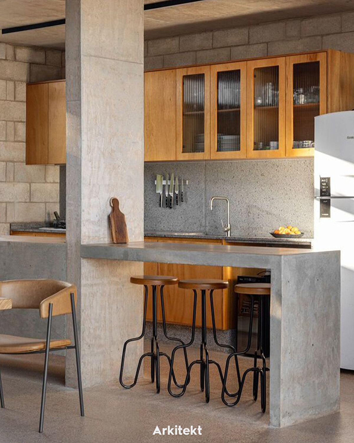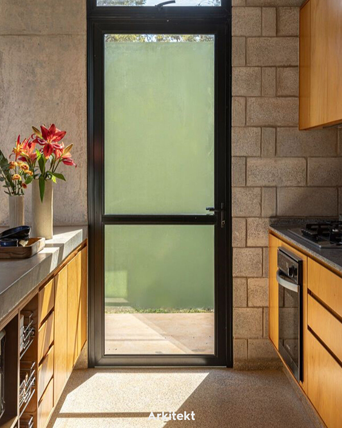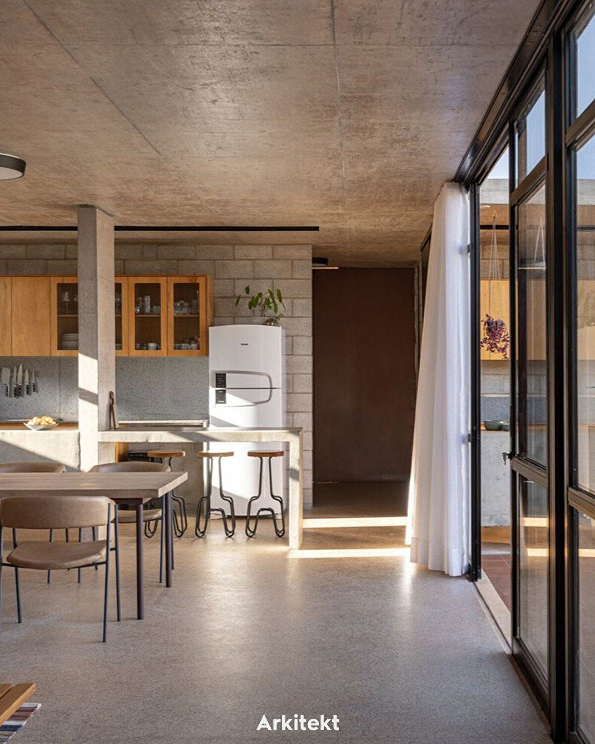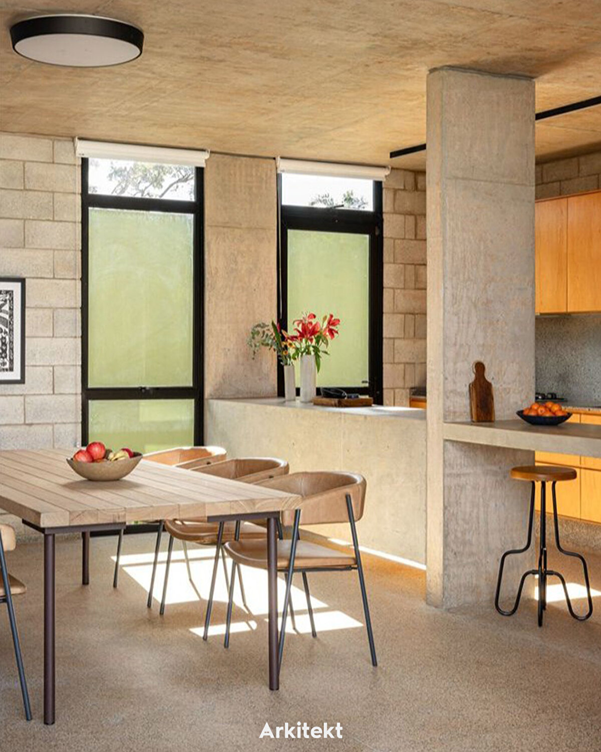 Oturma odası ve mutfak, evin kalbi olan büyük bir sosyal alan olarak birleştiriliyor ve geniş pencerelerle verandaya ve barbekü alanına açılıyor. Bu alan, yatak odalarının da odak noktası olan verandaya ve evin merkezindeki havuza doğrudan bağlanıyor.