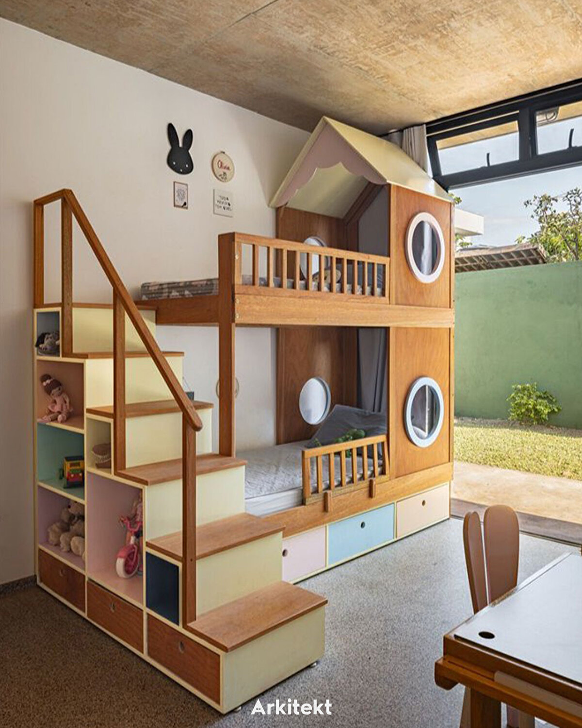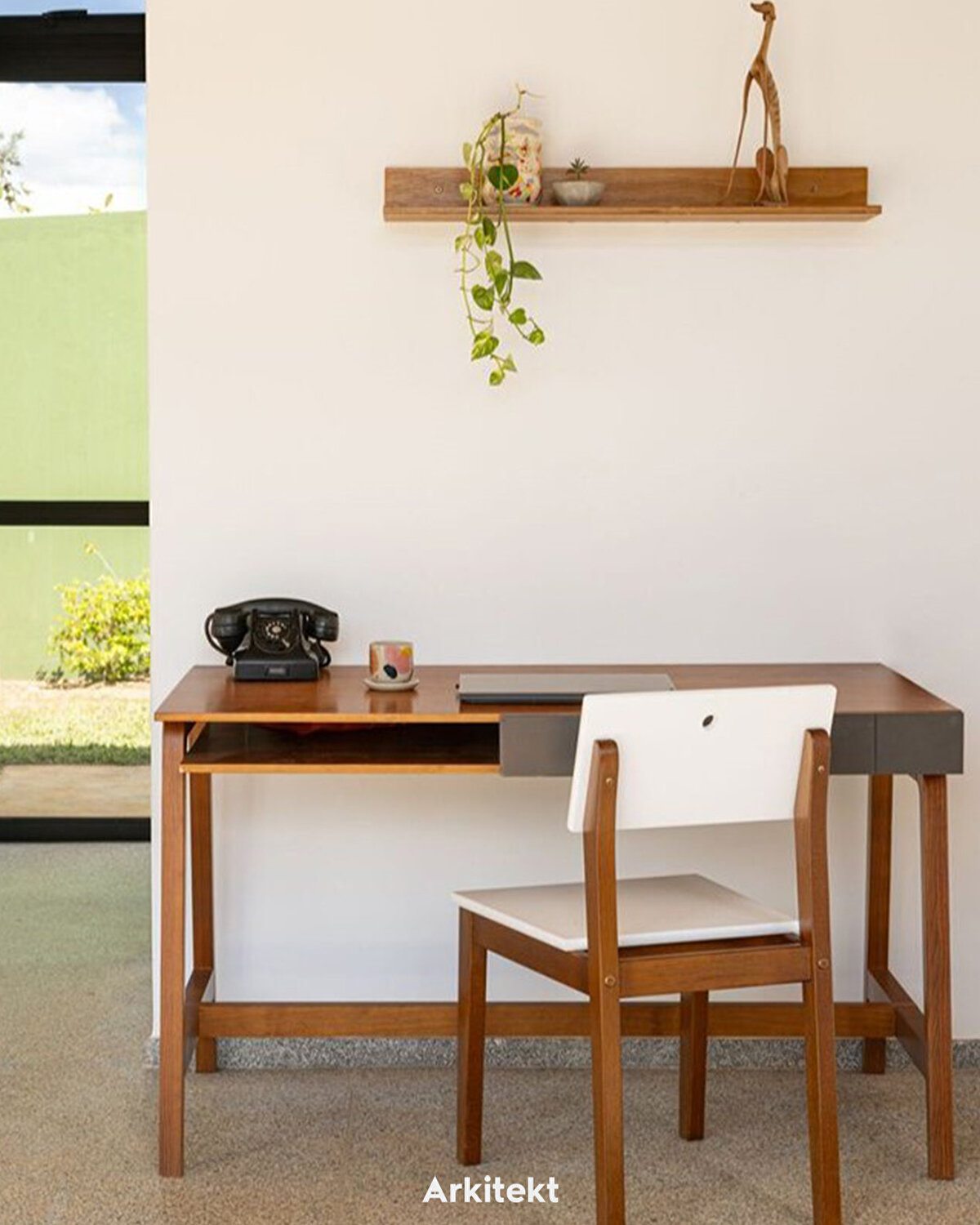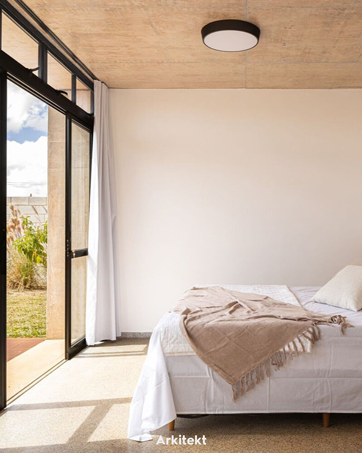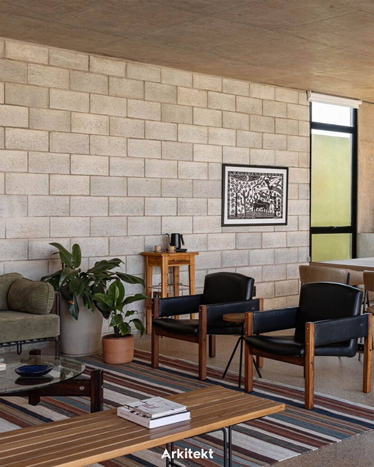 Projede dikkat çeken bir diğer unsur, sadece ilham aldığı bina ile değil, aynı zamanda evin bulunduğu kurak Cerrado bölgesinin doğal bitki örtüsüyle de güçlü bir bağ kuran renk paleti oluyor. Yerel doğanın kırmızı toprağıyla uyumlu olan pişmiş toprak tonları, modüler yapının ahşap detayları ve çıplak betonla mükemmel bir uyum içinde tasarlanıyor.