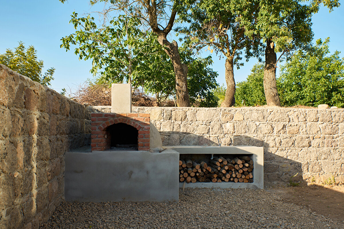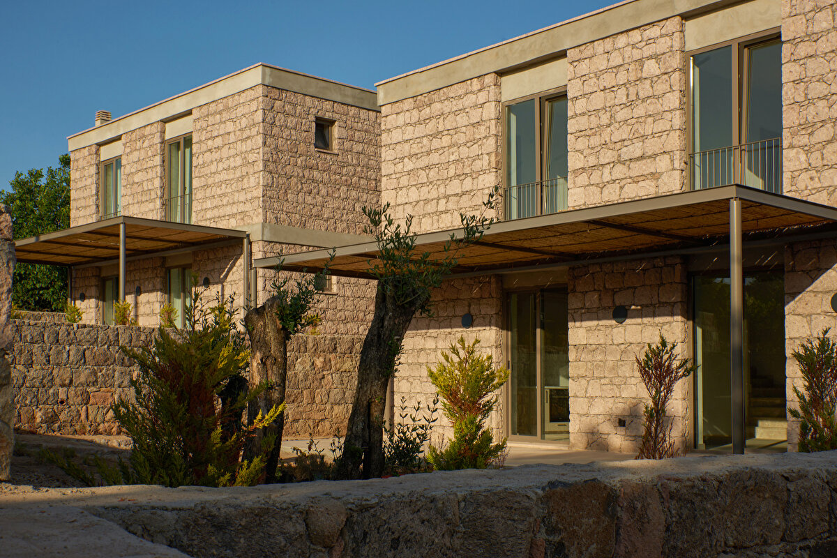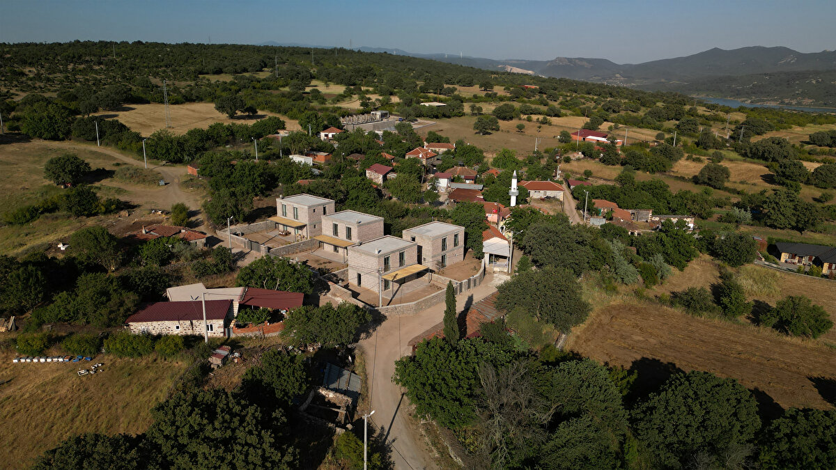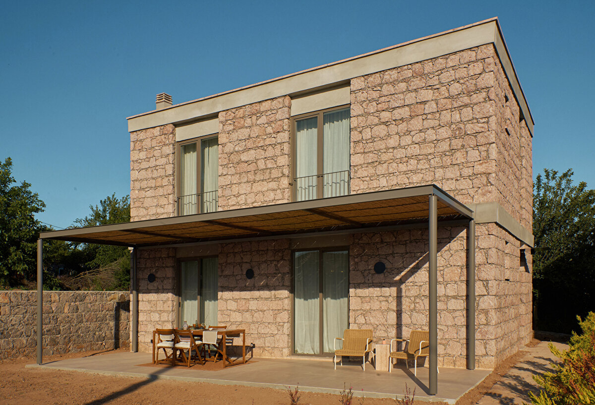 Evler doğal taş cepheleri ve yöreye özgü mimari unsurların sadeleştirilerek yeniden yorumlanmasıyla elde edilmiş detaylarıyla öne çıkıyor. Doğal taş cephe yüzeylerini bölen sıvanmış kat silmeleri arasında boydan boya açılmış pencereler, iç ve dış mekan arasında kontrollü bir ilişki kurulmasını sağlıyor. Evlerin önüne eklenen ve ön cephe boyunca devam eden çelik taşıyıcılı, saz üst örtülü pergolalar, dış mekan kullanımını kolaylaştırıyor. Bahçede yer alan köy tipi fırın ve açık mutfak tezgahıysa, bu kullanımı daha da zenginleştiriyor. Cephelerdeki sadelik, doğallık ve hamlık hissi, merdiven ve şöminede kullanılan mermer, zemindeki hareli seramik ve ahşap kalıp izli brüt beton tavan sayesinde iç mekanda da sürdürülüyor.